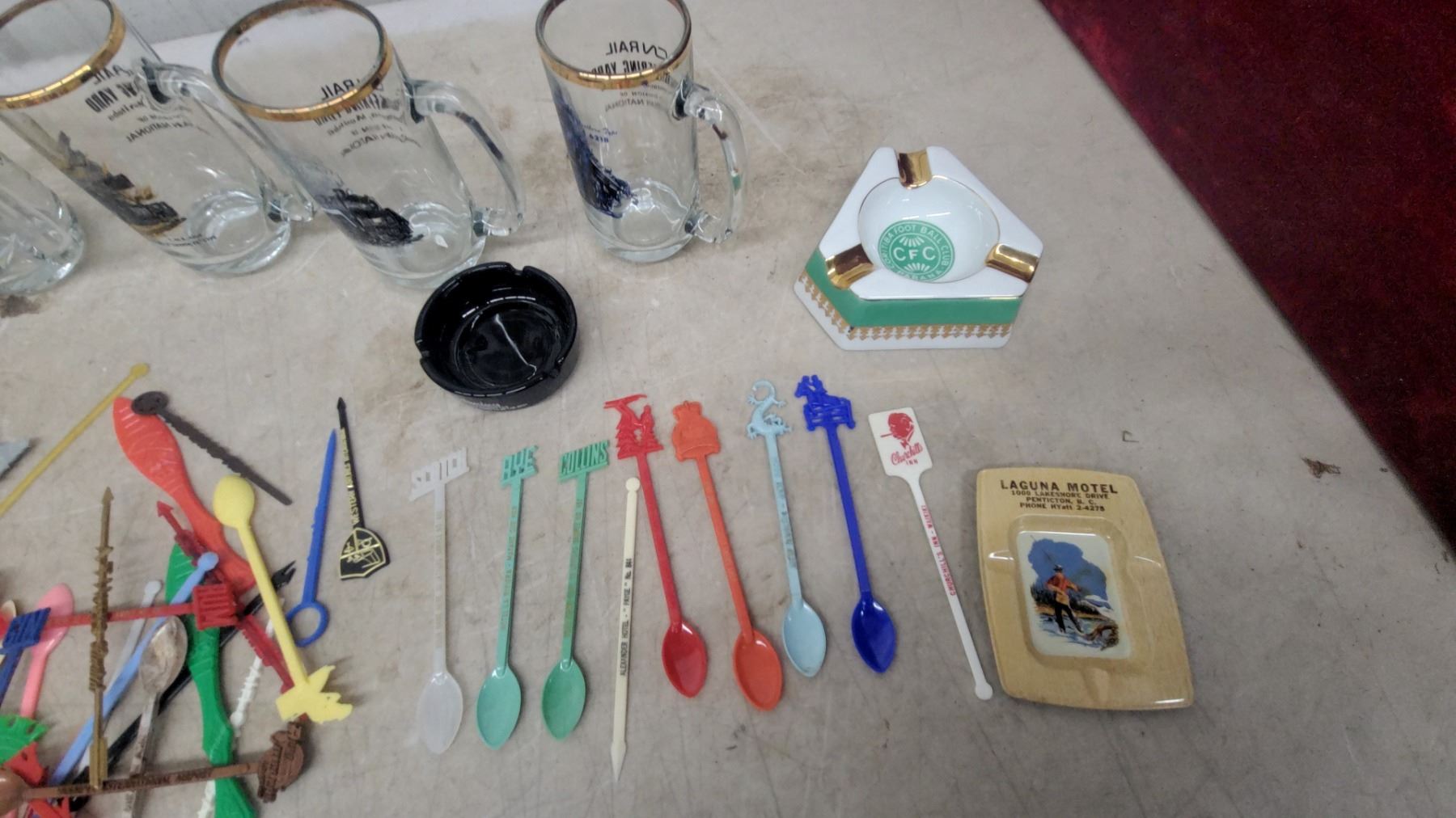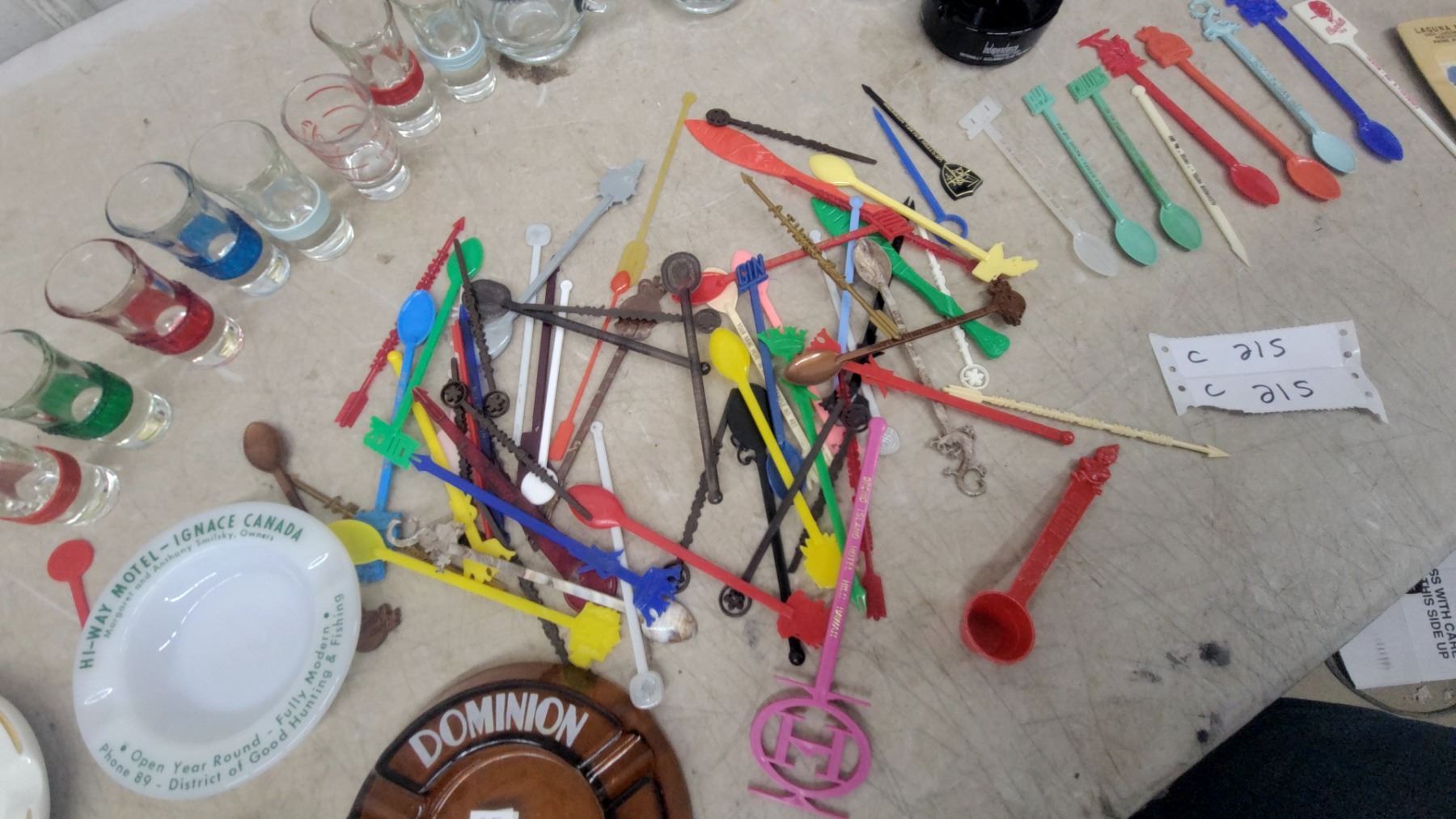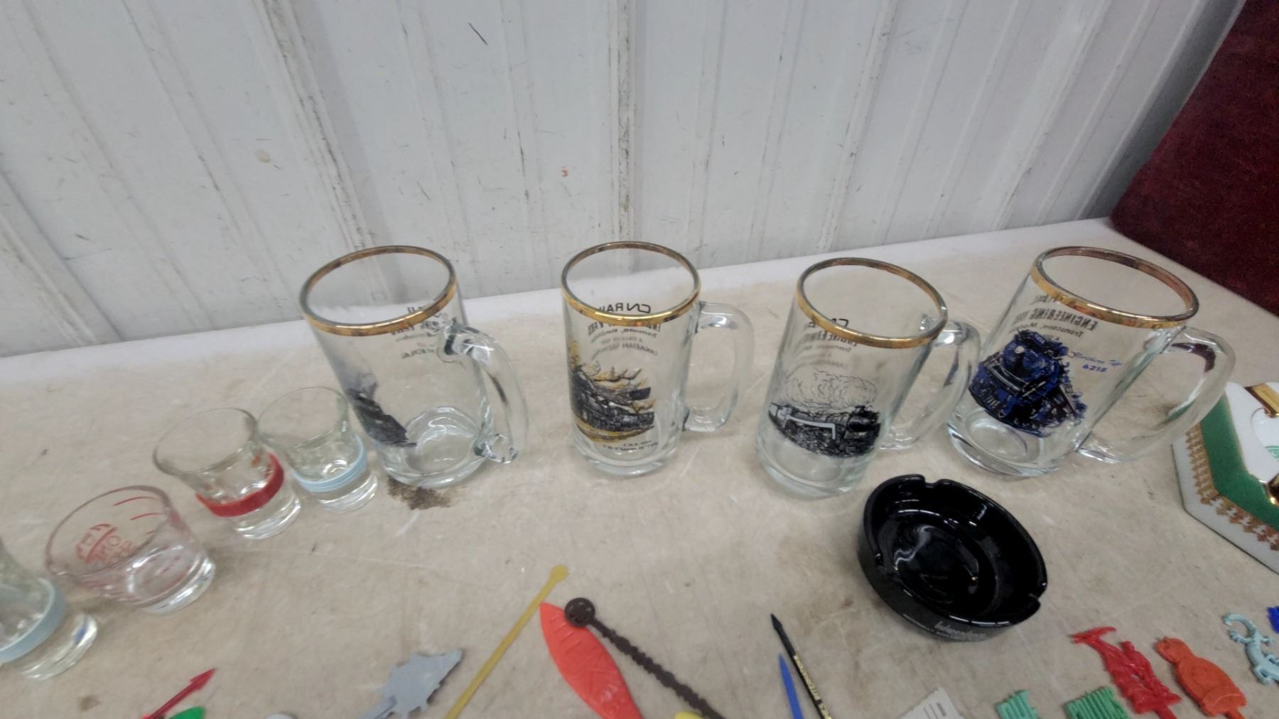 Lot 215 Vintage Ashtrays & Barware Lot: Double Dragon Ale, Dominion White Label, Hotel Ashtrays, Shot Glass