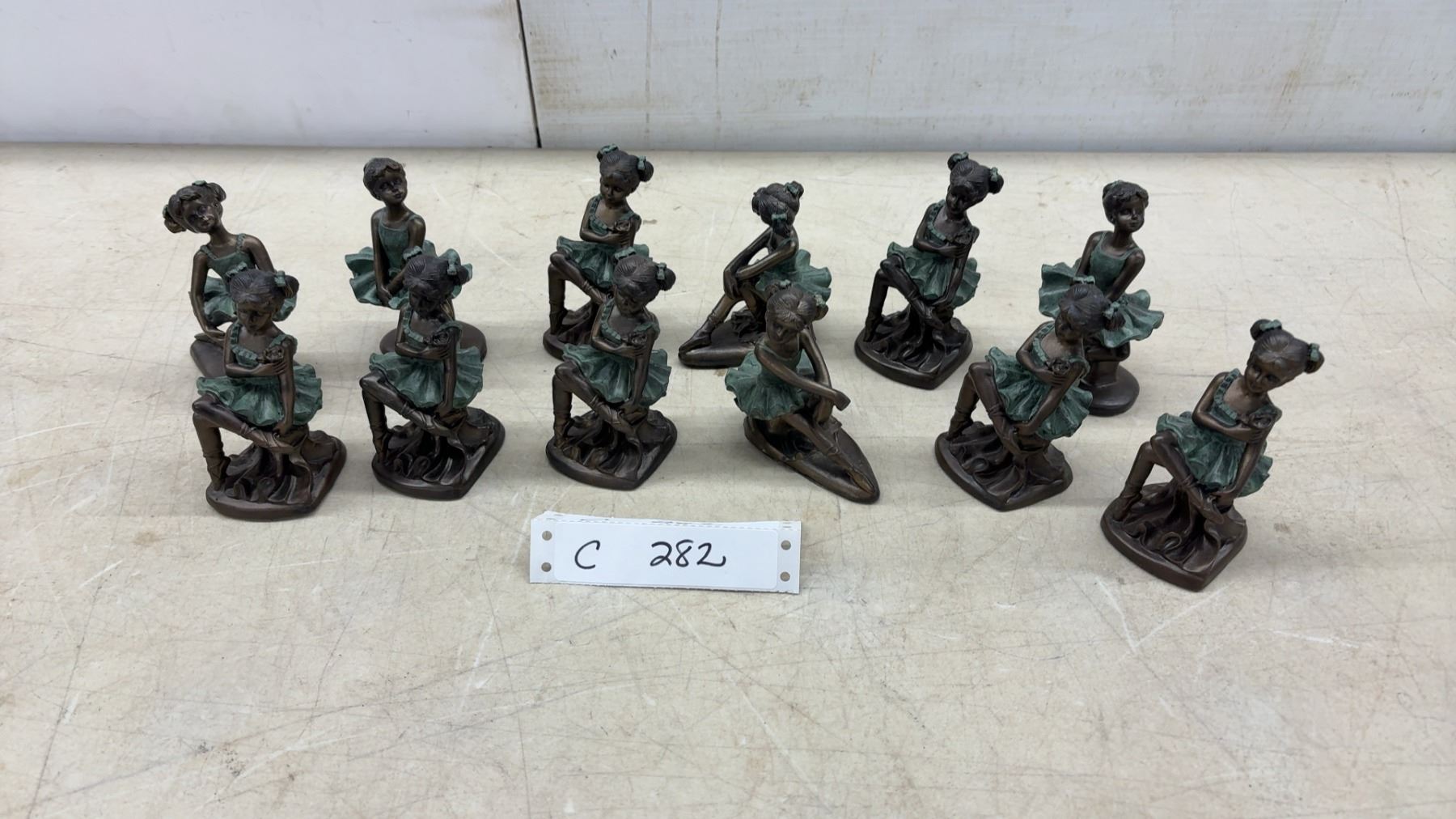 Lot 282 Collection of 12 Bronze-Effect Ballerina Figurines in Green Tutus, Various Poses