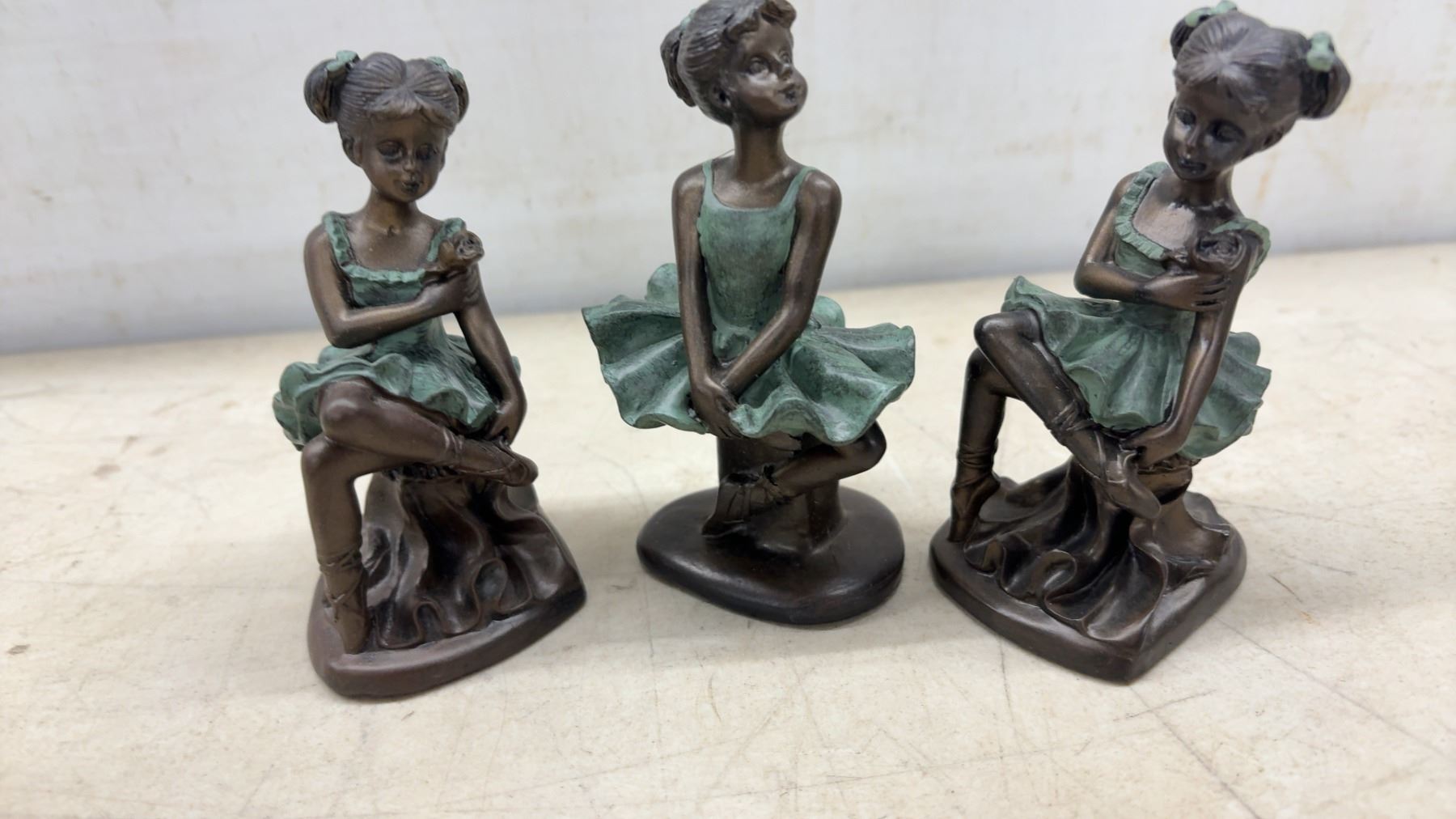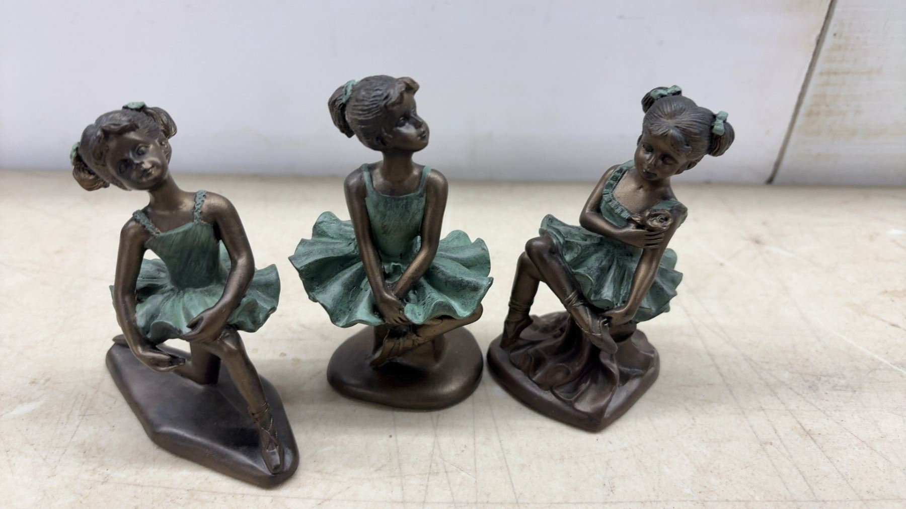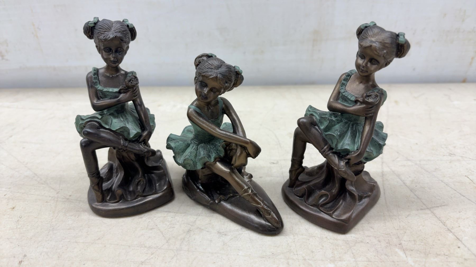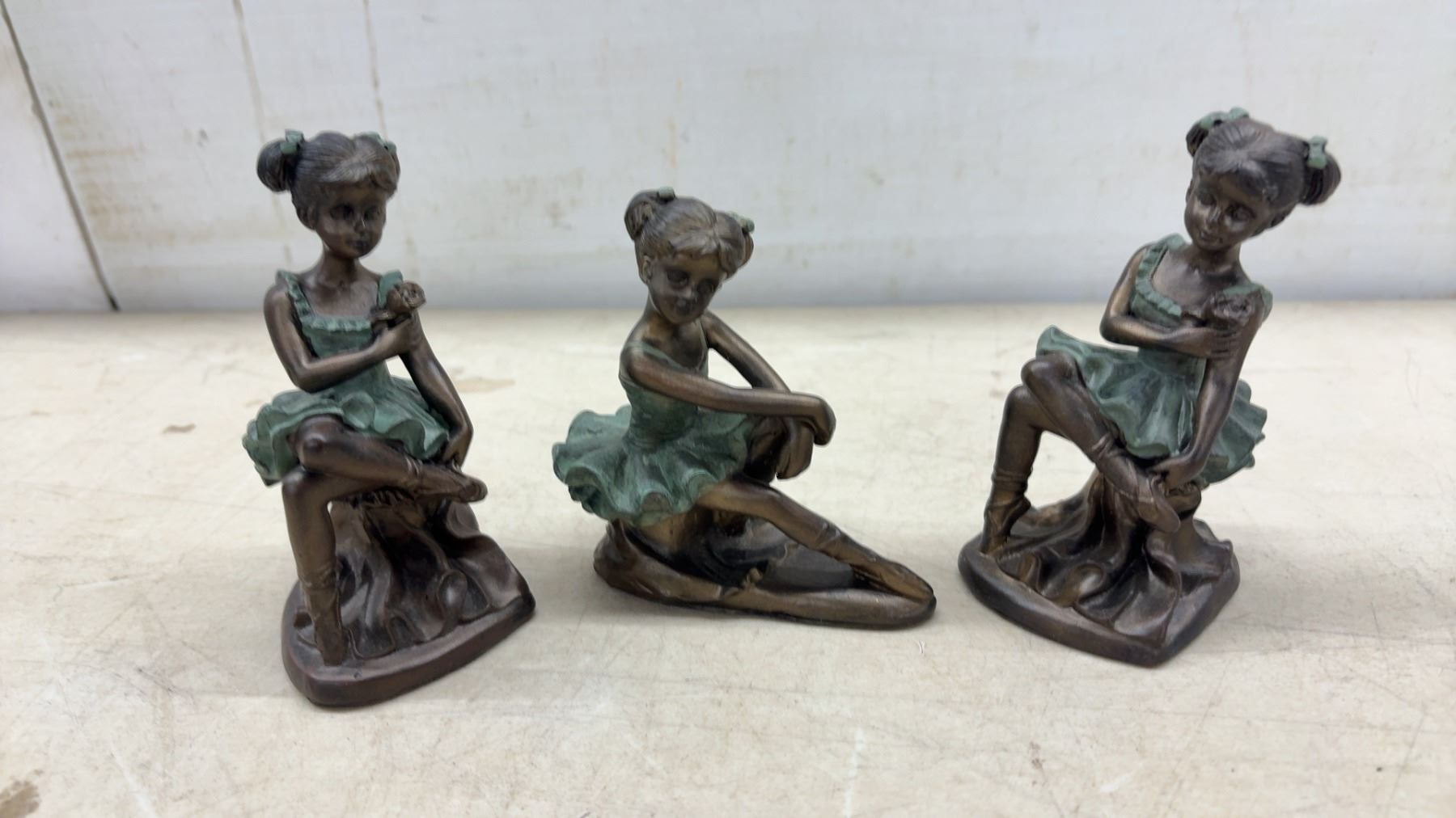 Collection of 12 Bronze-Effect Ballerina Figurines in Green Tutus, Various Poses