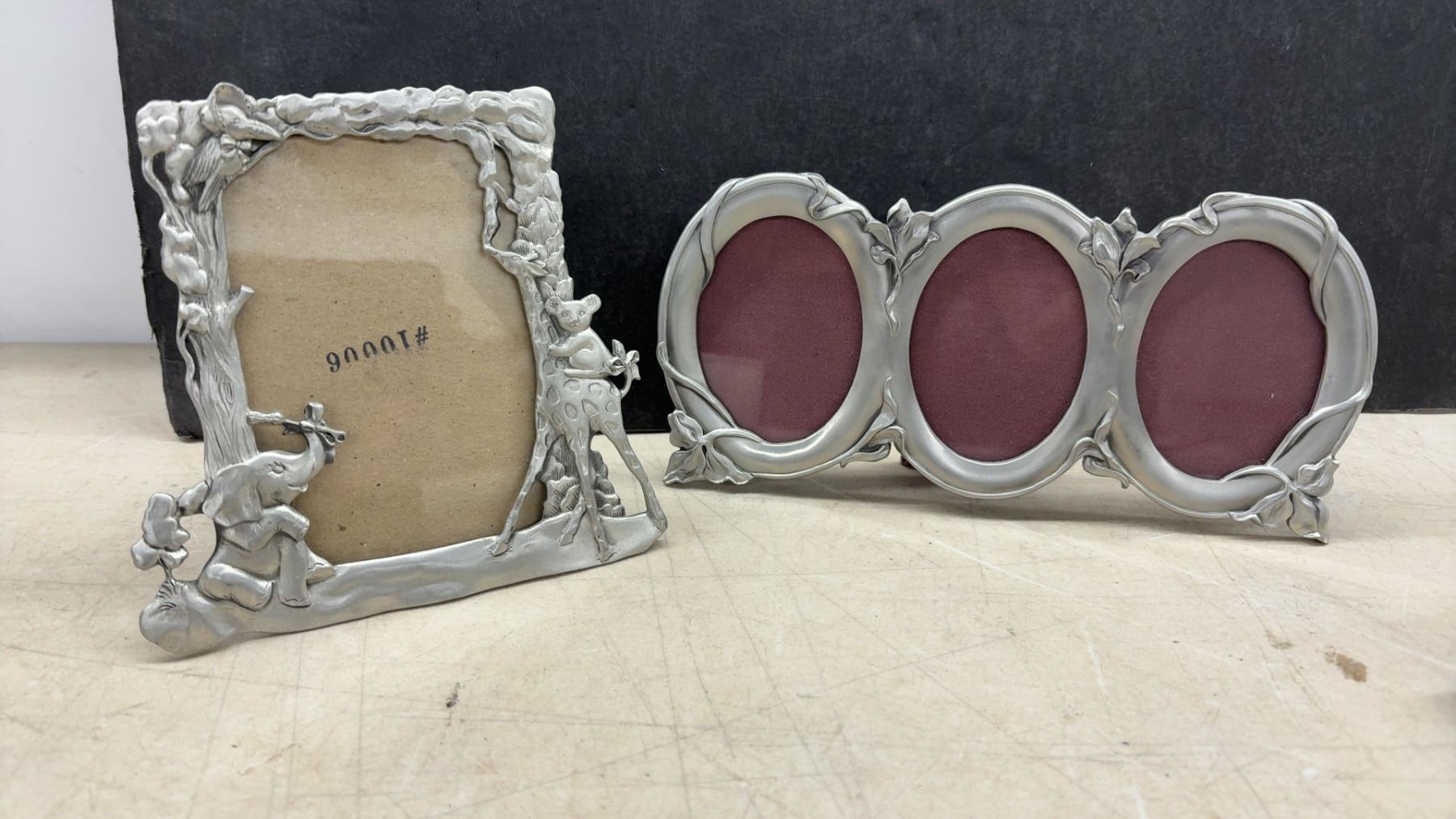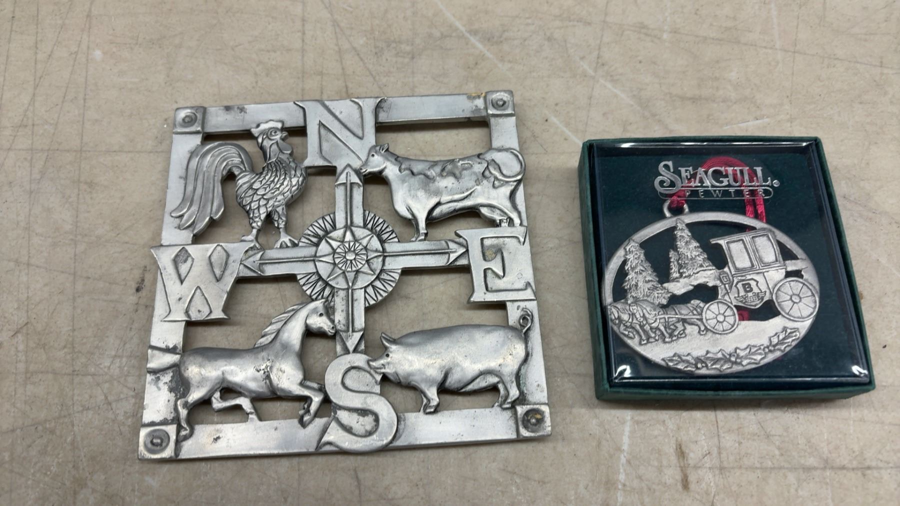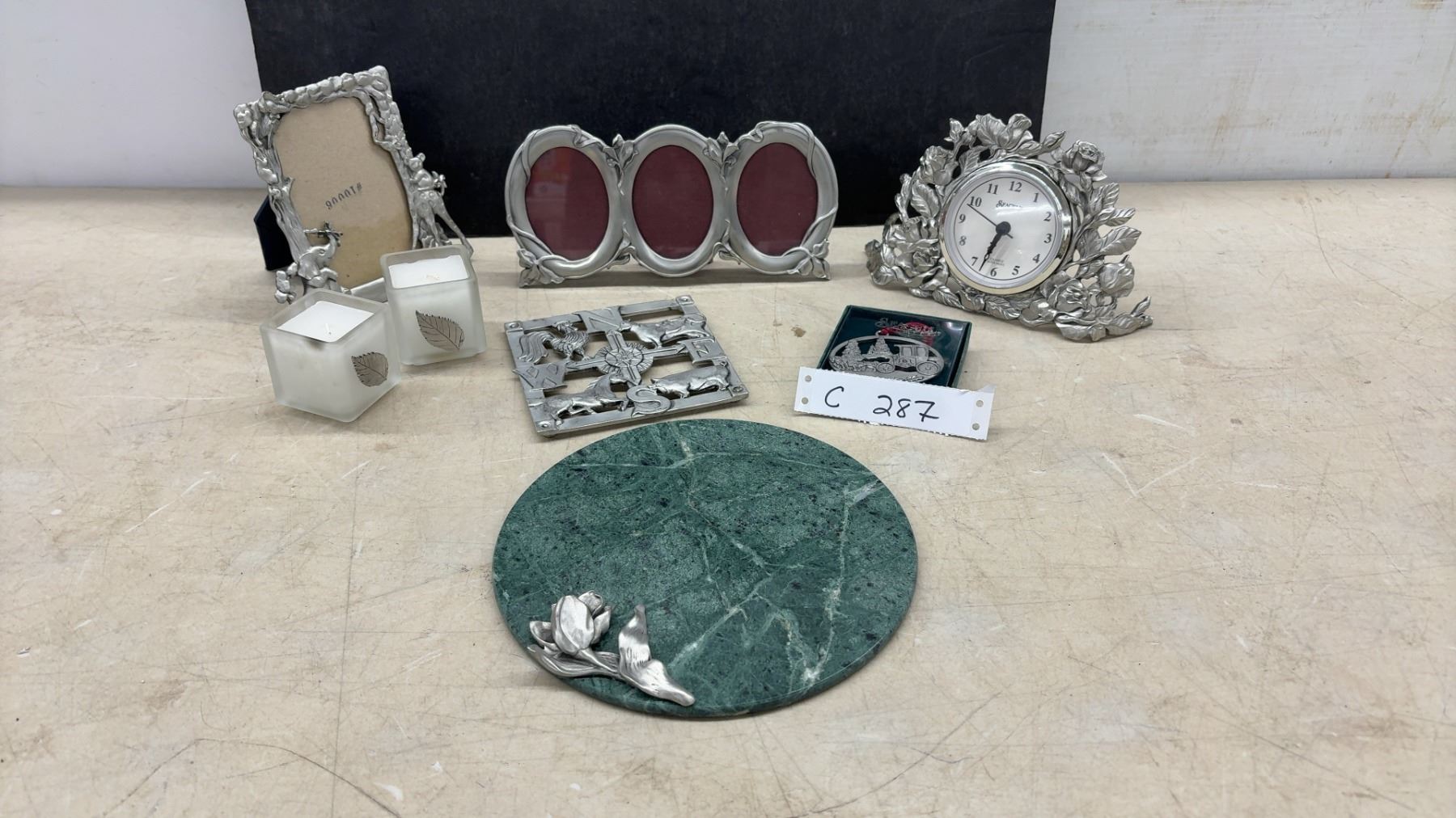 Lot 287 Seagull Pewter Collection: Clock, Photo Frames, Trivet, Marble Cheese Board, Candle Holders