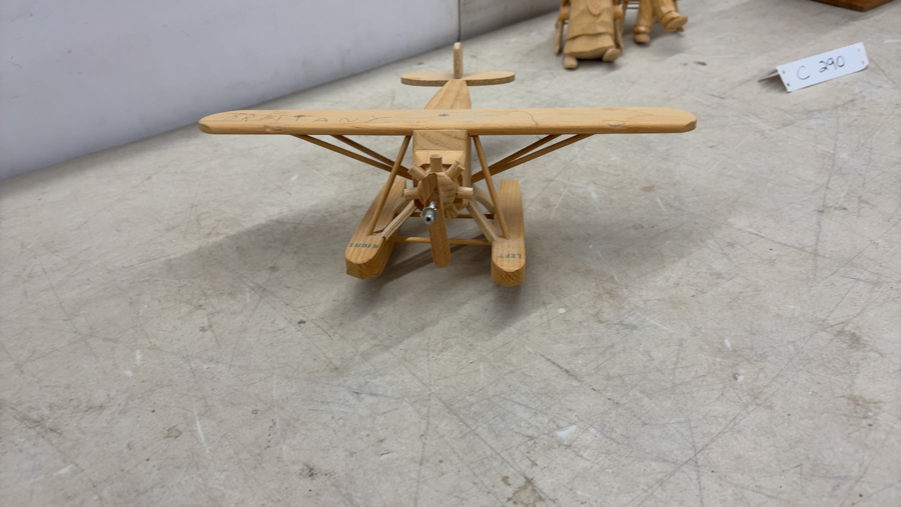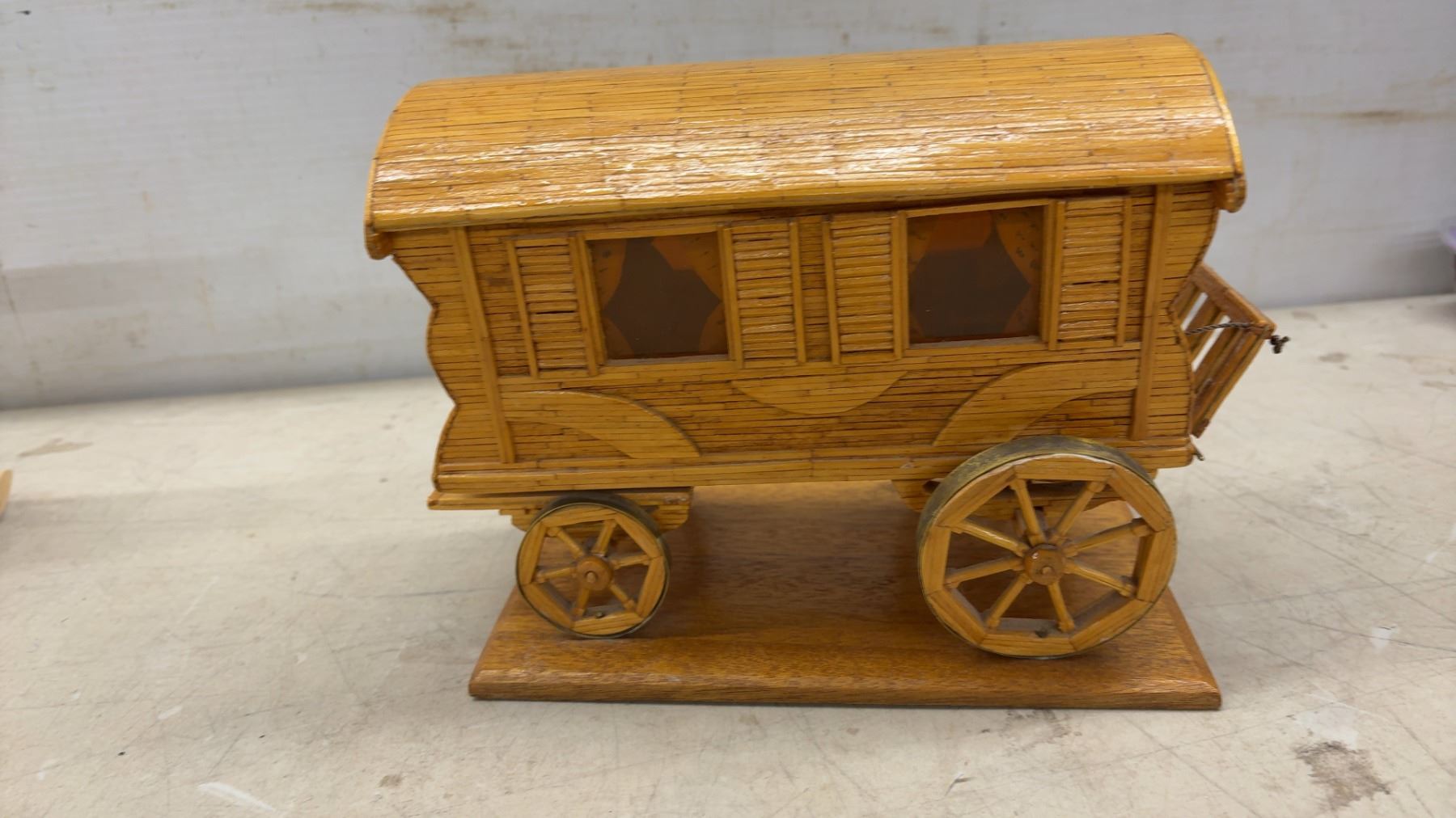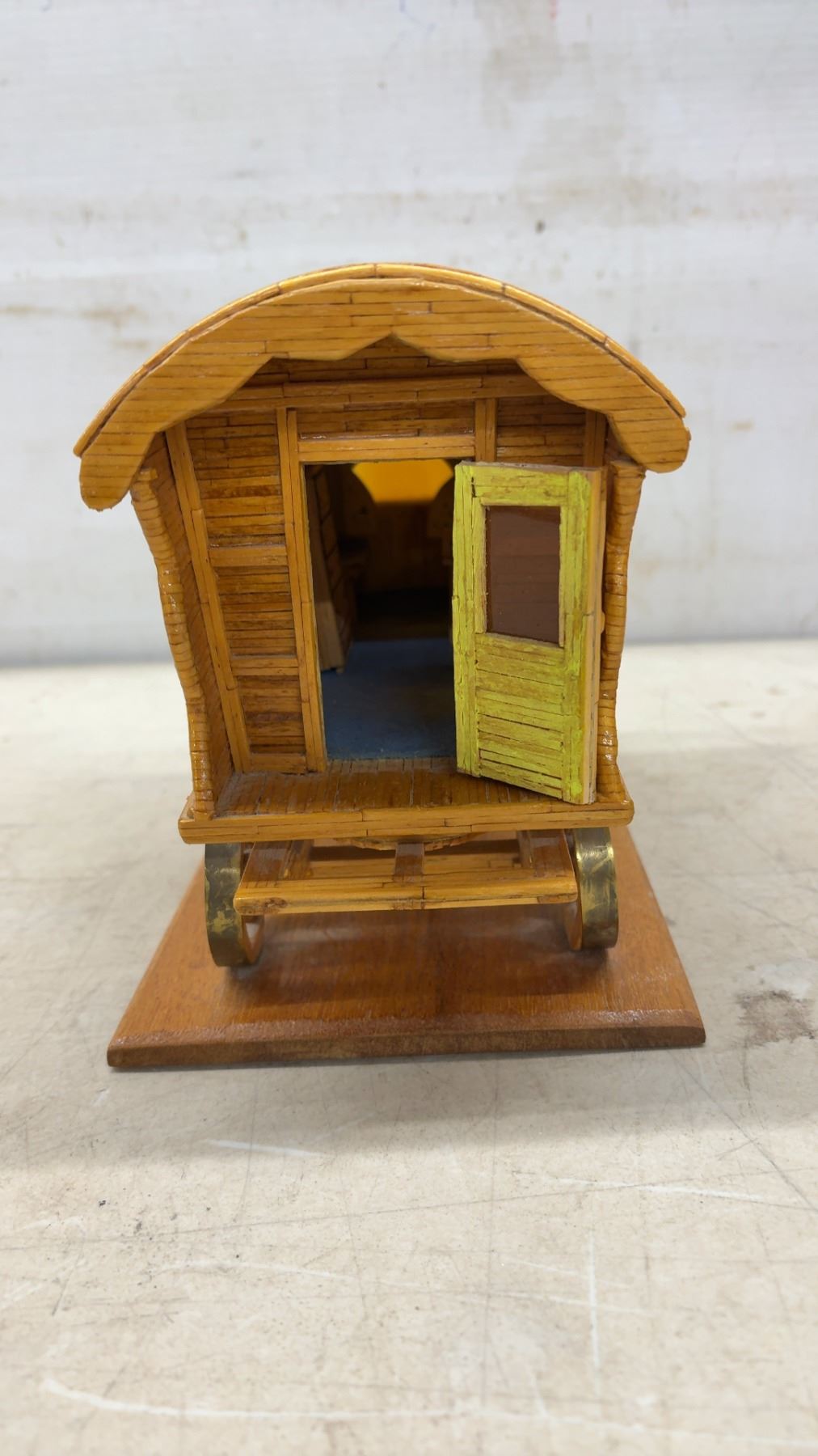 Handcrafted Wooden Models: Biplane, Elderly Couple in Rocking Chairs, and Romany Gypsy Caravan 7