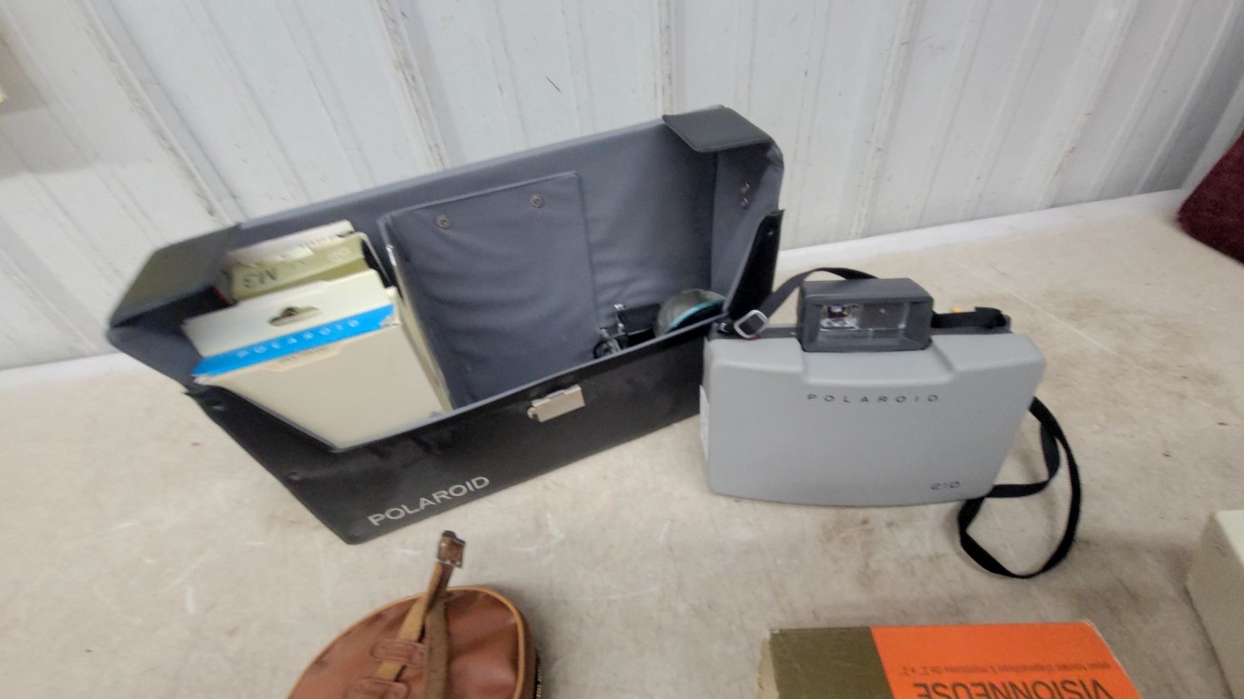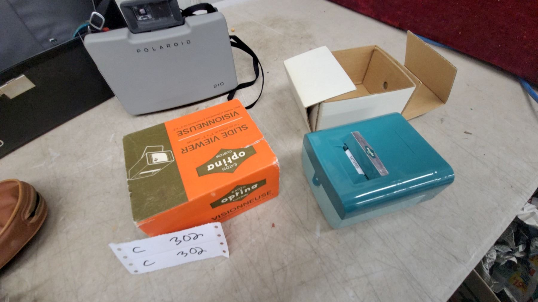 Lot 302 Vintage Camera Lot: Polaroid 210, Kodak Auto-Mask Printing Frame, Optina Slide Viewer, Flash Unit