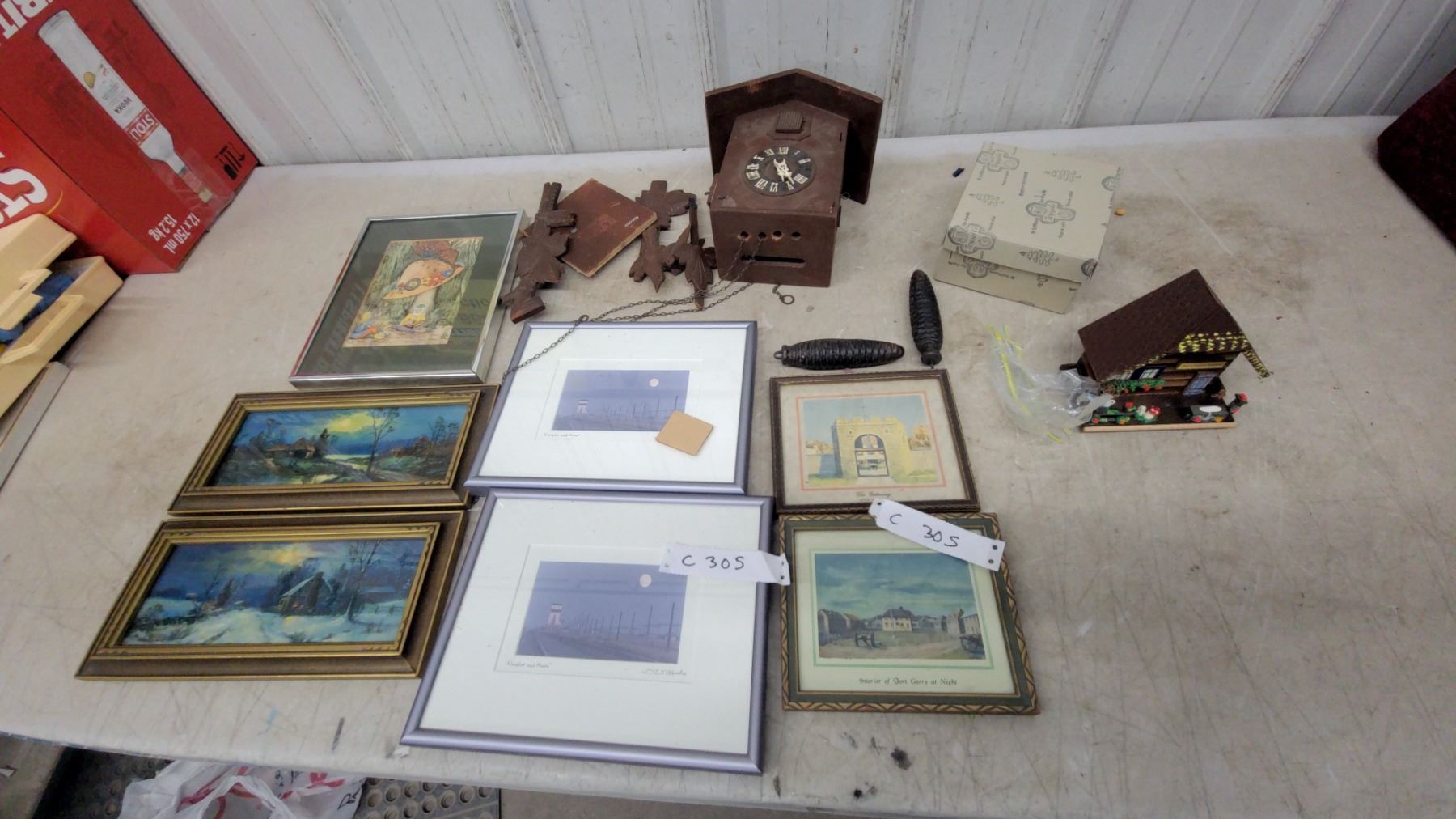Lot 305 Framed Prints, Cuckoo Clock Parts, Decorative Chalet Bank, Fort Garry Artwork
