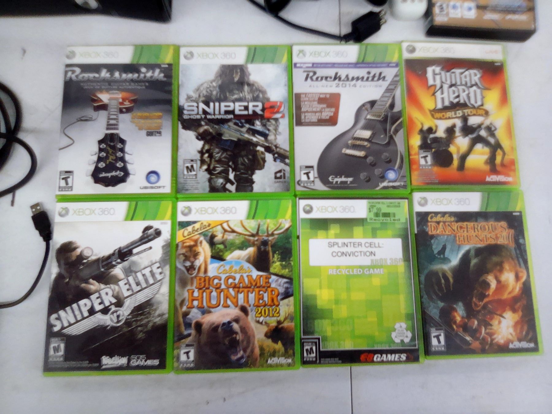 Lot 45 Xbox 360 S Console with Controller, Media Remote, Power Supply, Cables & 8 Games