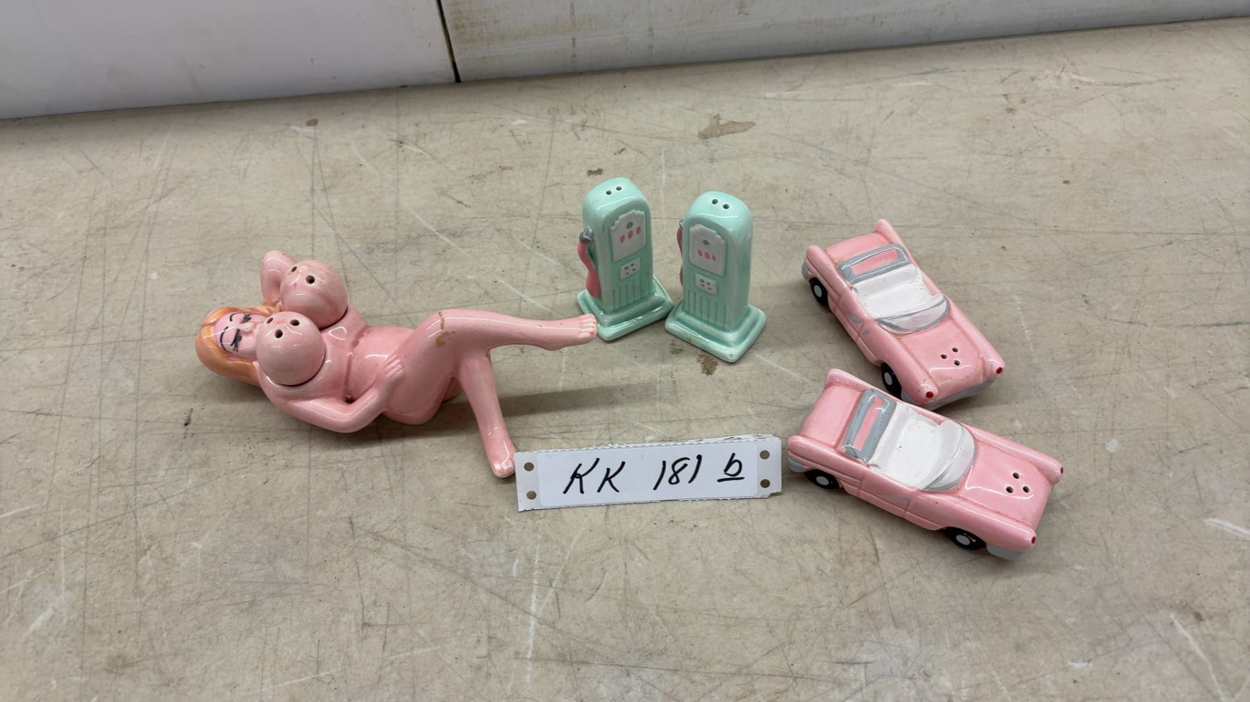 Lot 181B Ceramic Salt & Pepper Sets - Pink Cadillac Convertibles & Retro Gas Pumps & Lady with Shakers!!