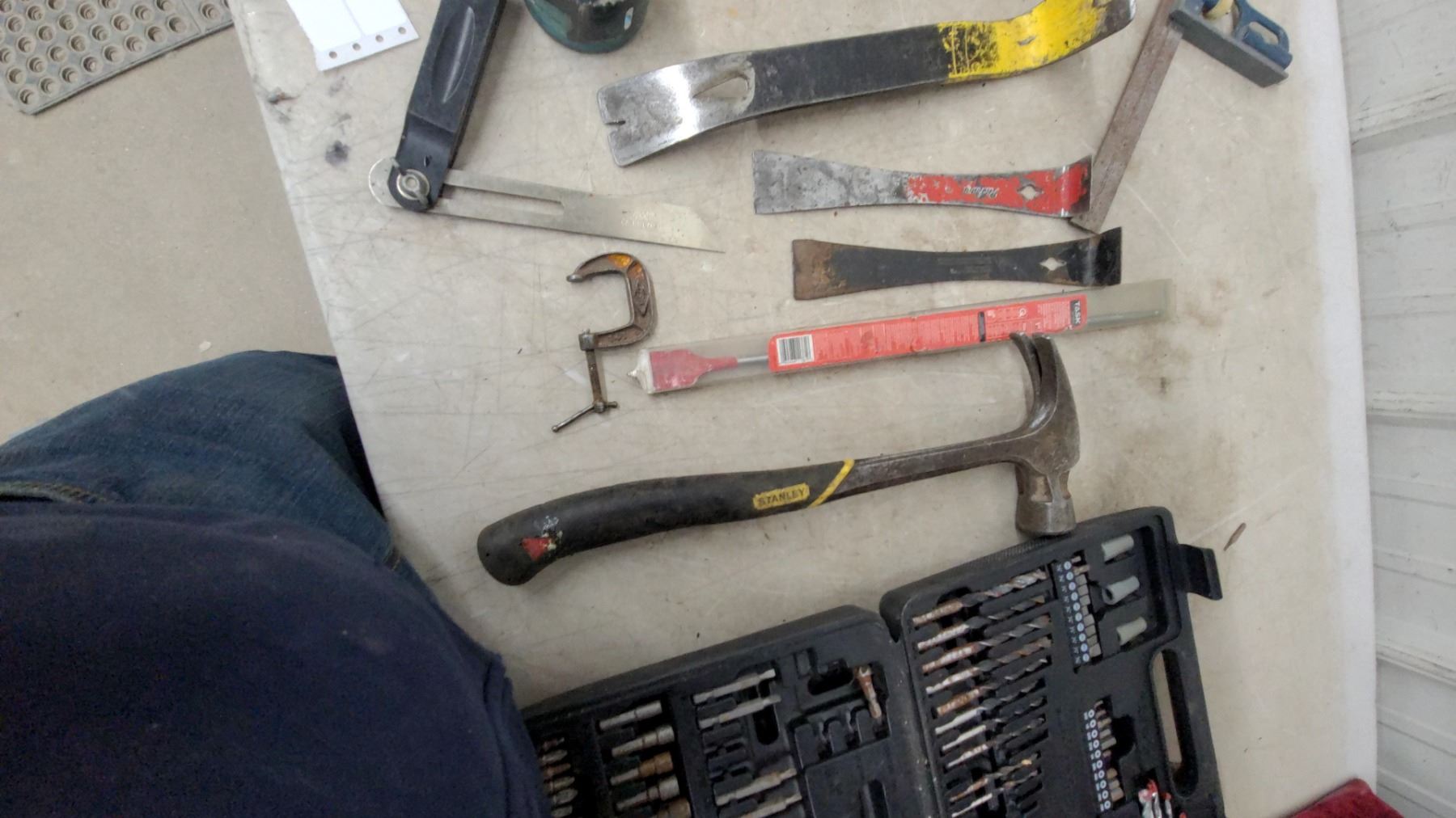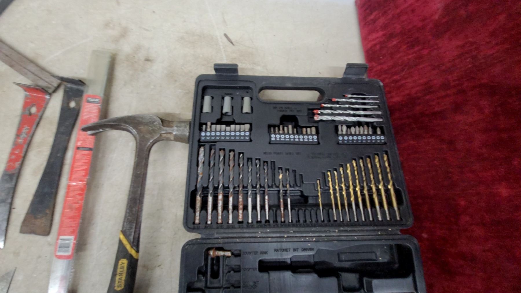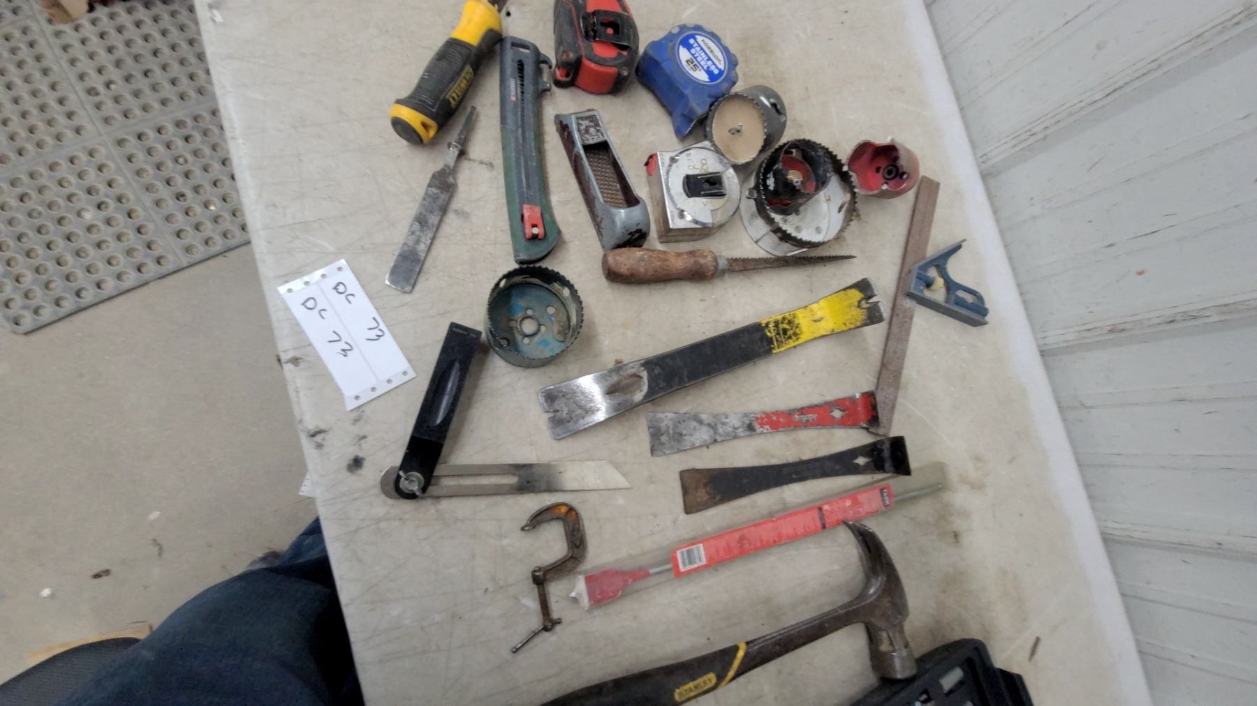 Lot 73 Stanley Hammer, Drill & Driver Bit Set, Hole Saws, Tape Measures, Utility Knife, Pry Bars, Saws