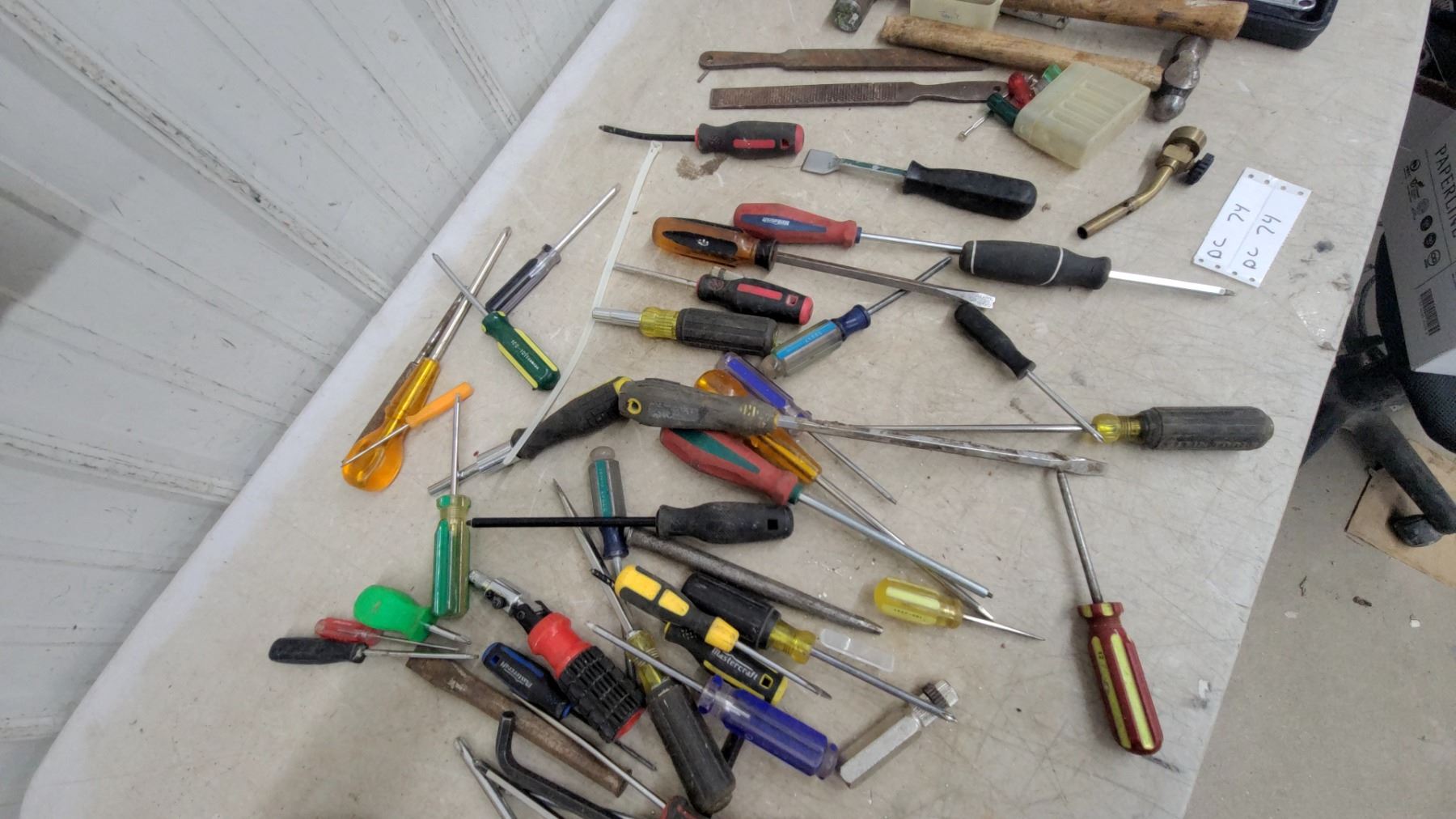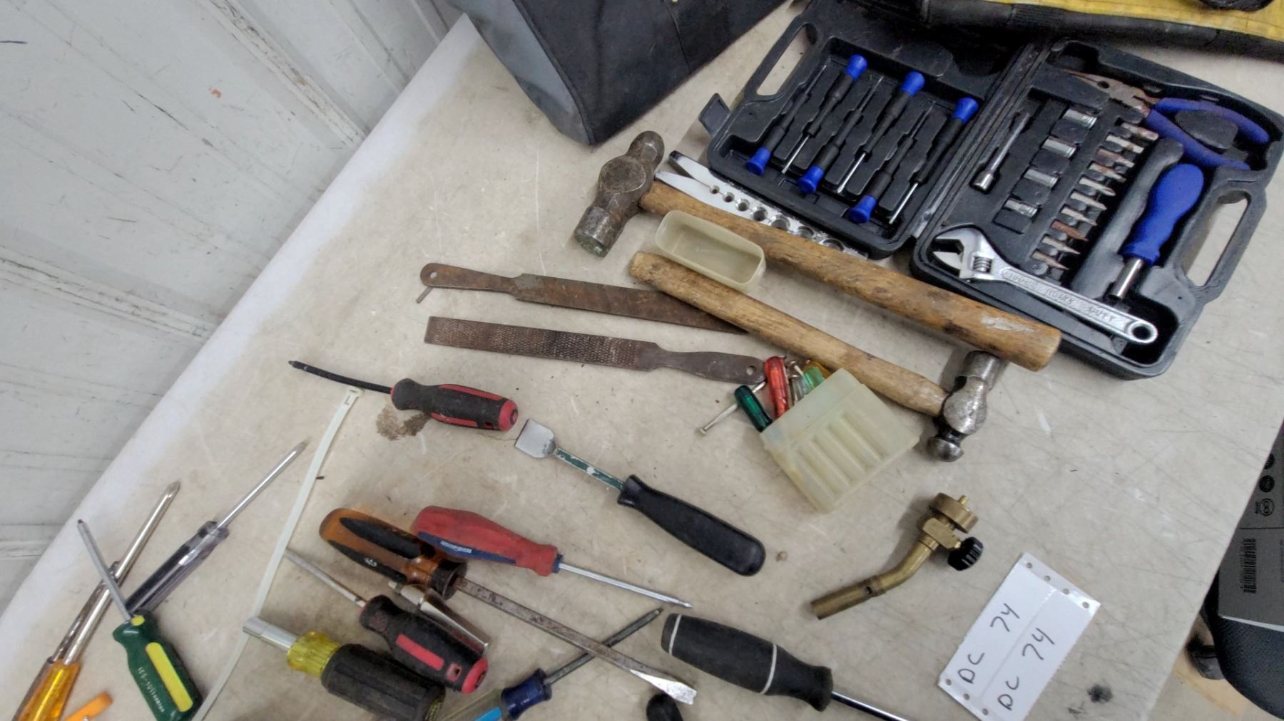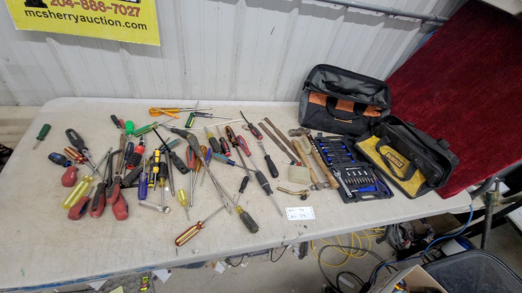 Lot 74 Assorted Screwdrivers, Tool Kit with Sockets & Bits, DeWalt Tool Bag, Ball Peen Hammer