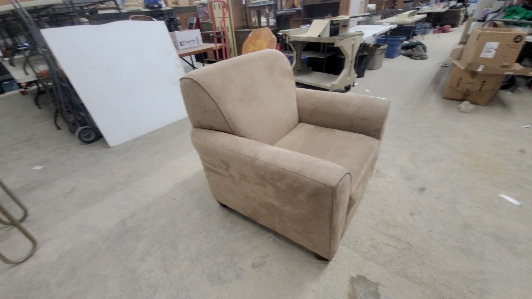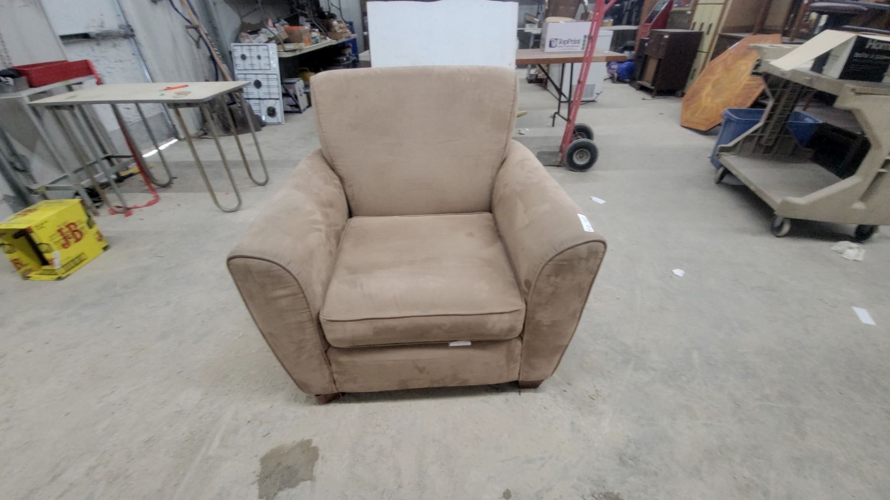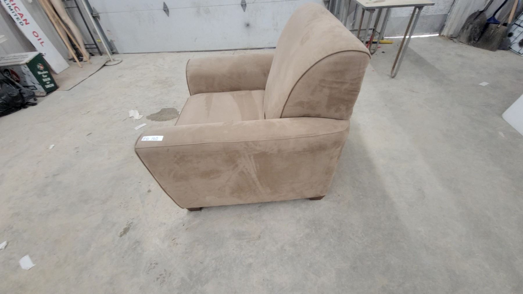 Lot 160 Tan/Beige Microfiber Upholstered Armchair with Curved Arms and Back Cushion