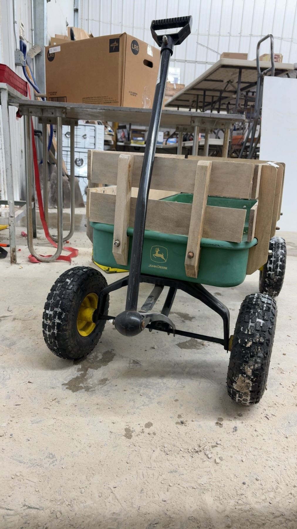John Deere Steel Wagon with Wooden Side Rails and Pneumatic Tires with Yellow Rims