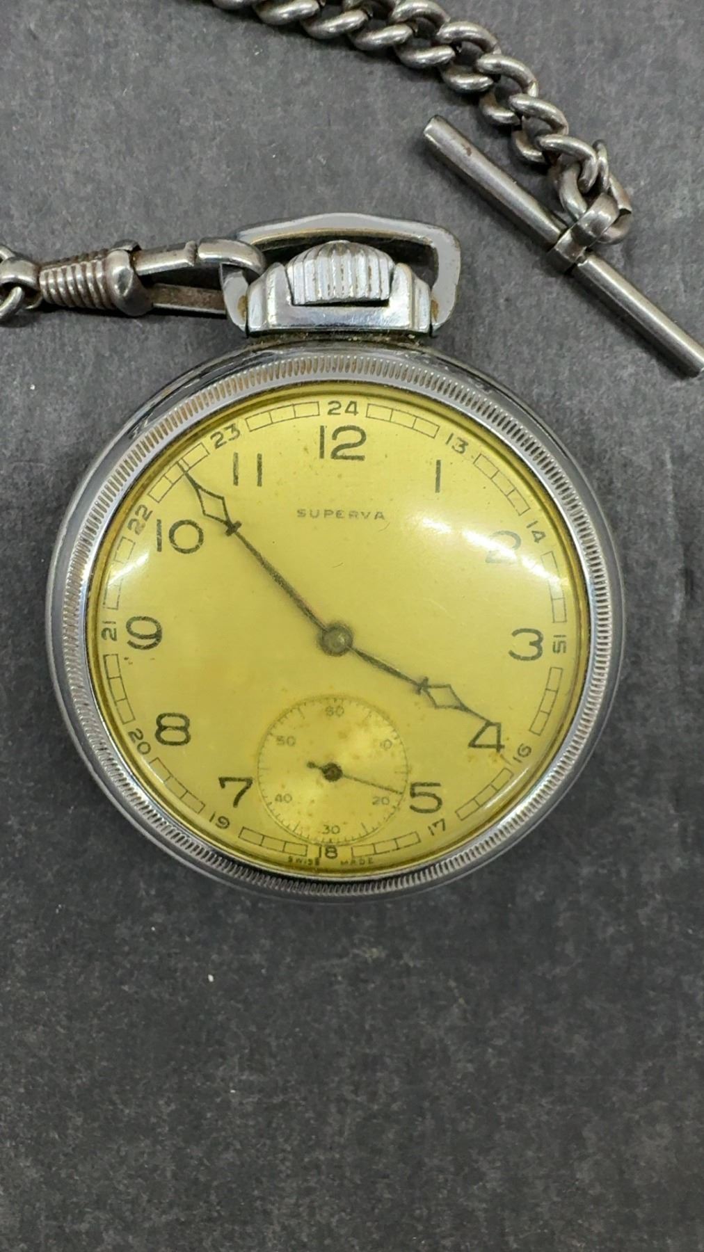 Vintage Superva Swiss Made 15 Jewel Pocket Watch with Nickel Silver Case and Chain, Working
