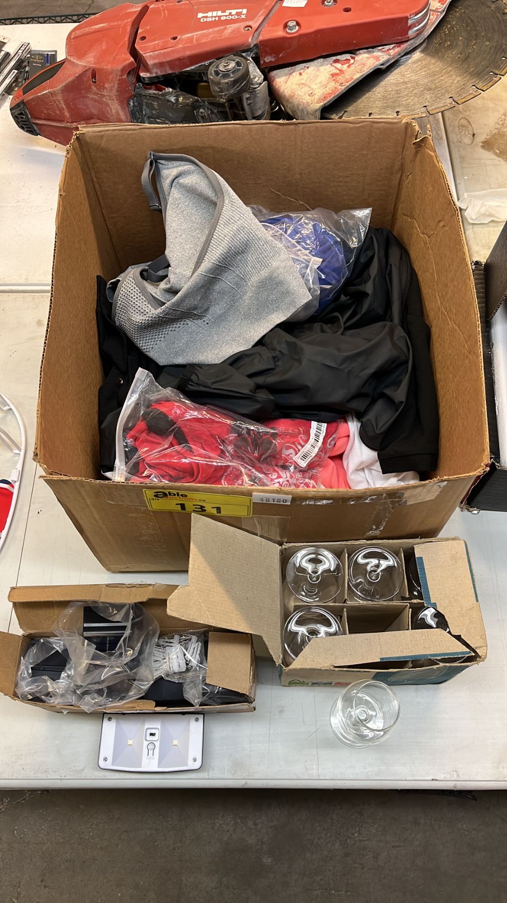 ASSORTED ITEMS INCLUDING; CLOTHING, SOLAR POWERED LIGHTS & BRANDY GLASSES