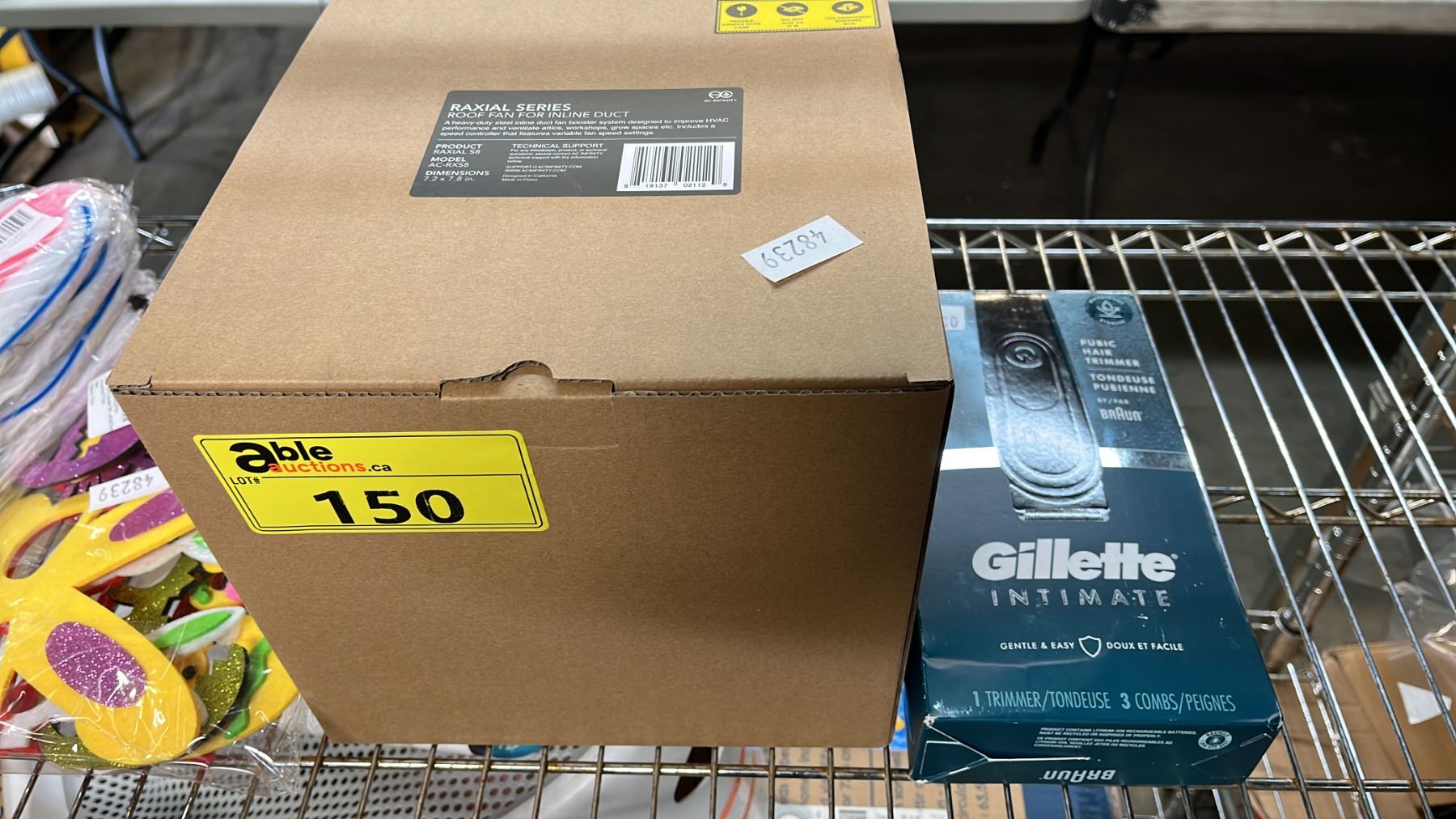 Lot 150 ASSORTED ITEMS INCLUDING; EASTER MASKS, RAXIAL SERIES ROOF FAN FOR INLINE DUCT & GILLETE INTIMATE