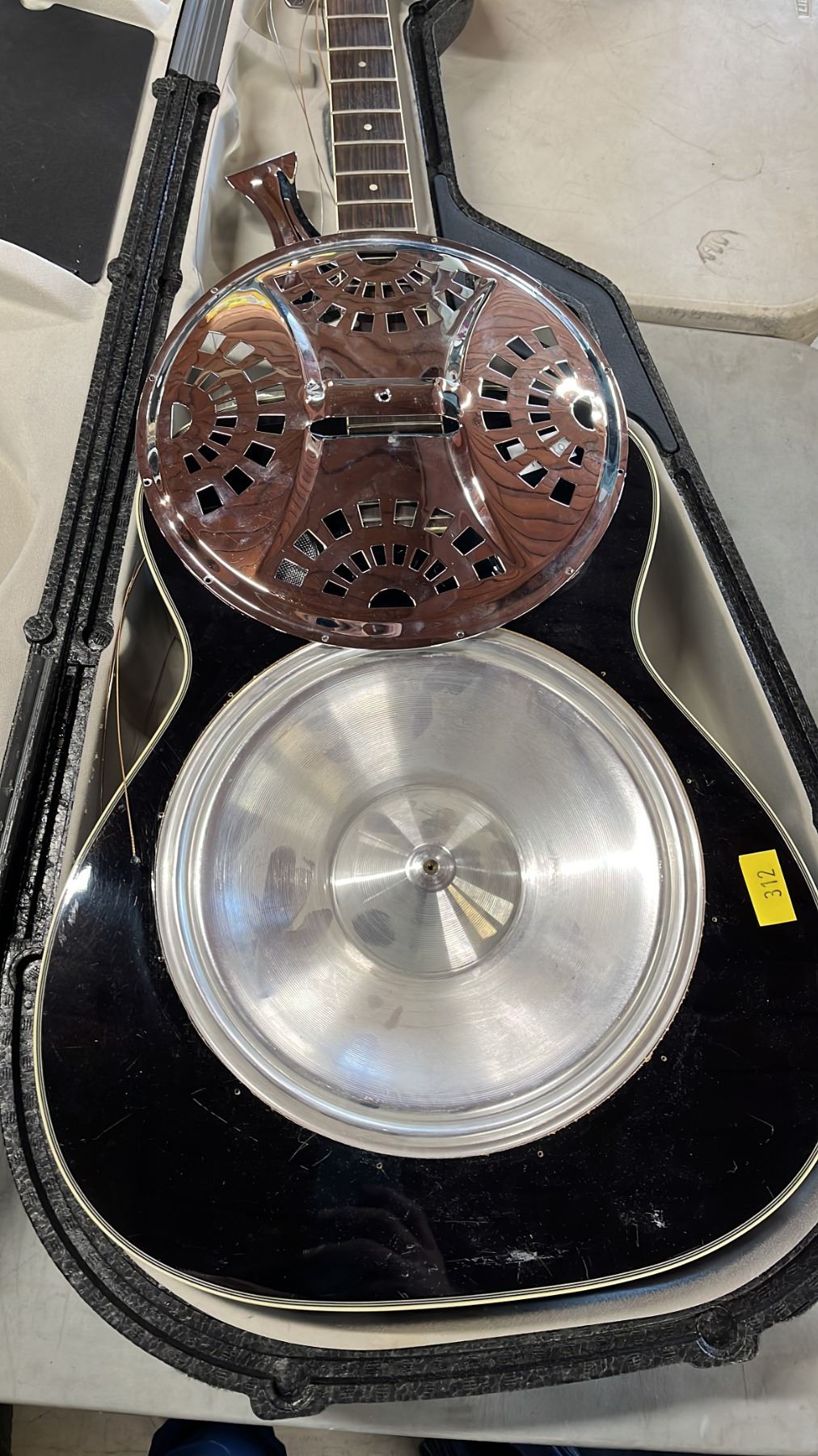 Lot 312 REGAL DOBRO GUITAR IN CASE: COVER PLATE NEEDS TO BE ATTACHED, HAS STRINGS, BUT IS NOT STRUNG