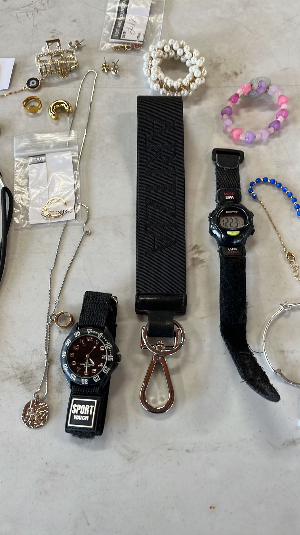 ASSORTED FASHION JEWELRY, 2 DIGITAL WATCHES & ARITZIA ALWAYS FOUND KEYCHAIN