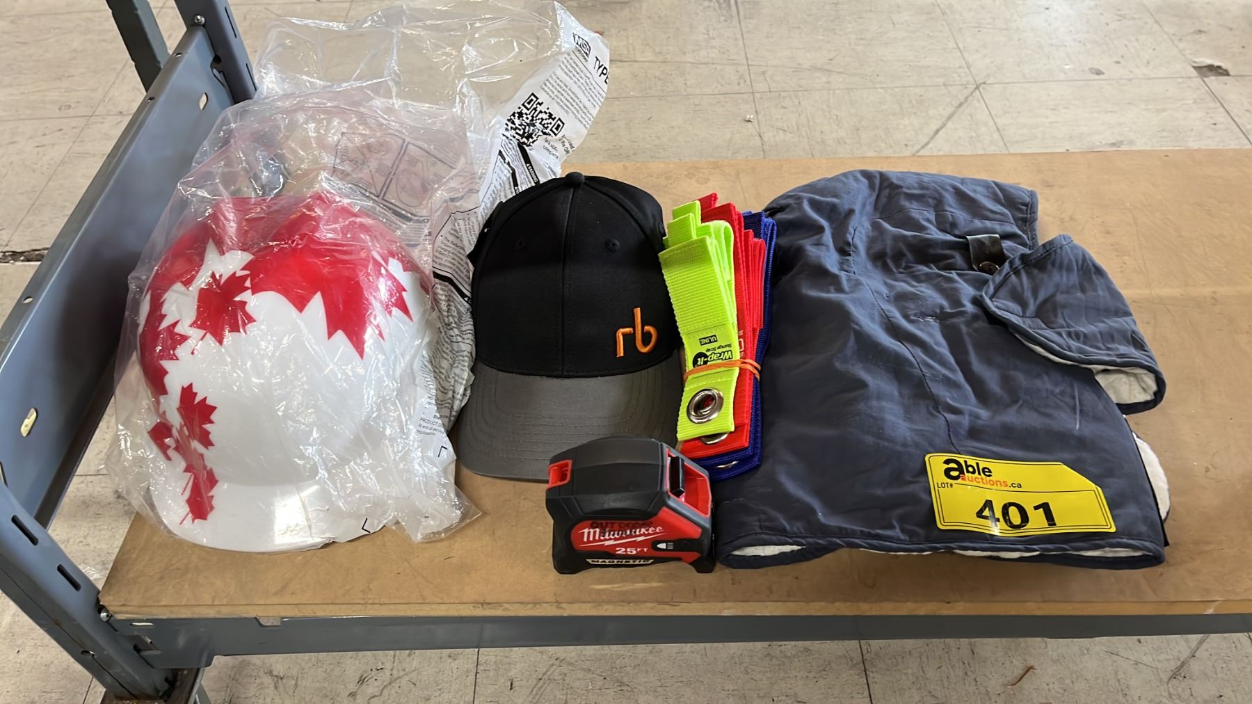 Lot 401 MAPLE LEAF DESIGN HARD HAT, WINTER LINER, BALL CAP, MILWAUKEE TAPE MEASURE & ULINE STORAGE STRAPS