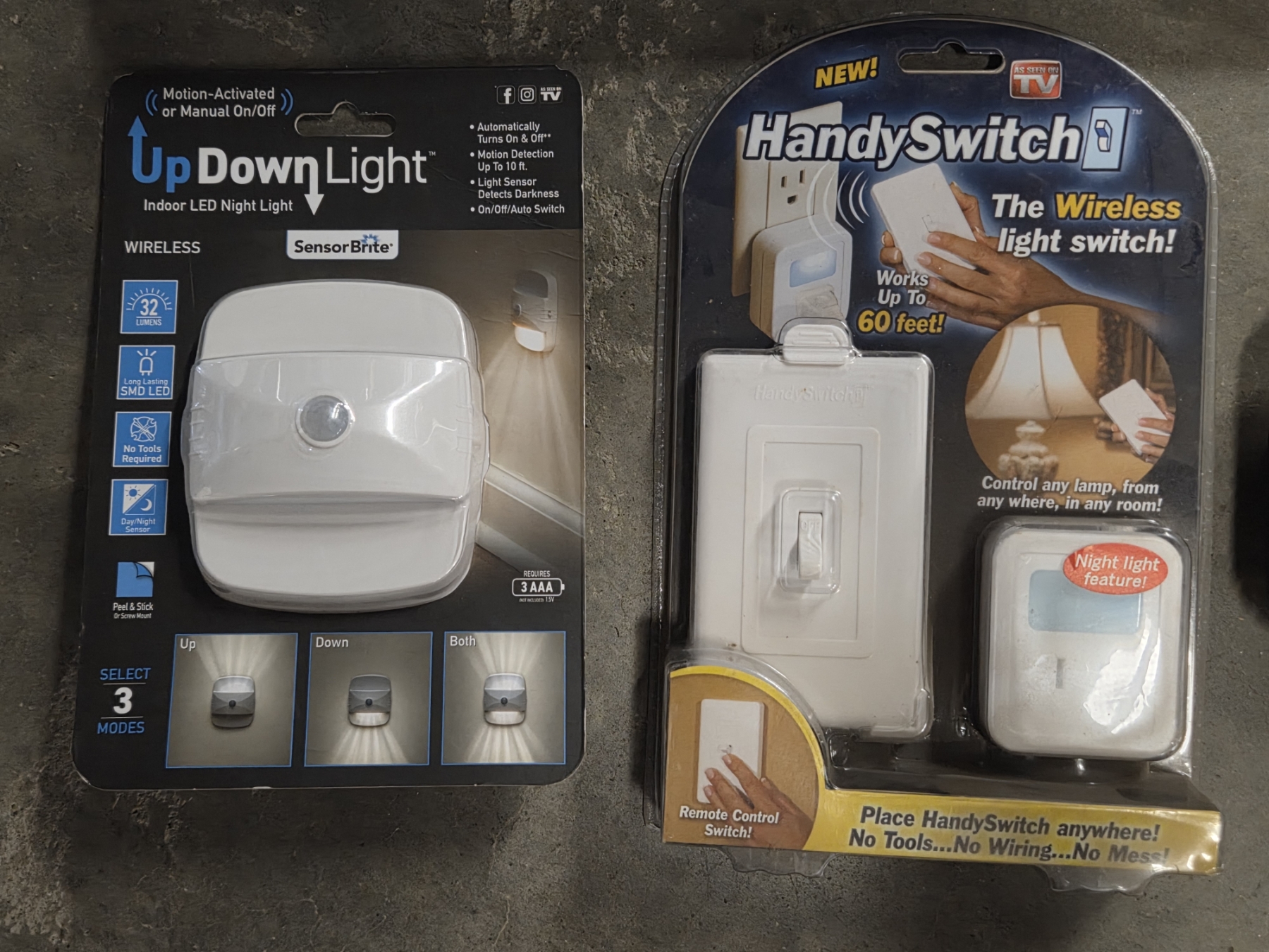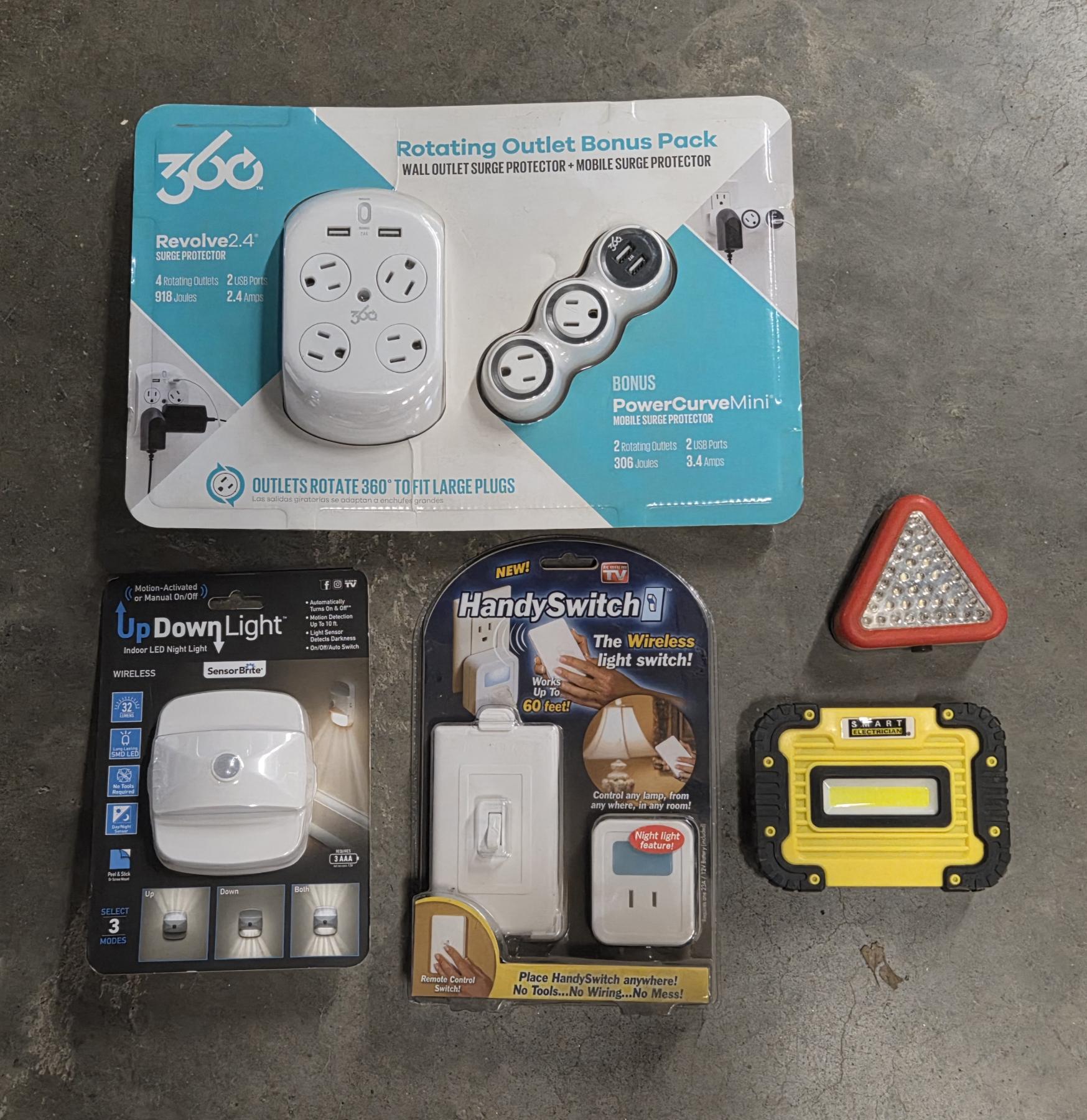 Lot 479 All Brand New- Emergency Lights, Rotating Outlets, Handy Switch, And Up Down Light