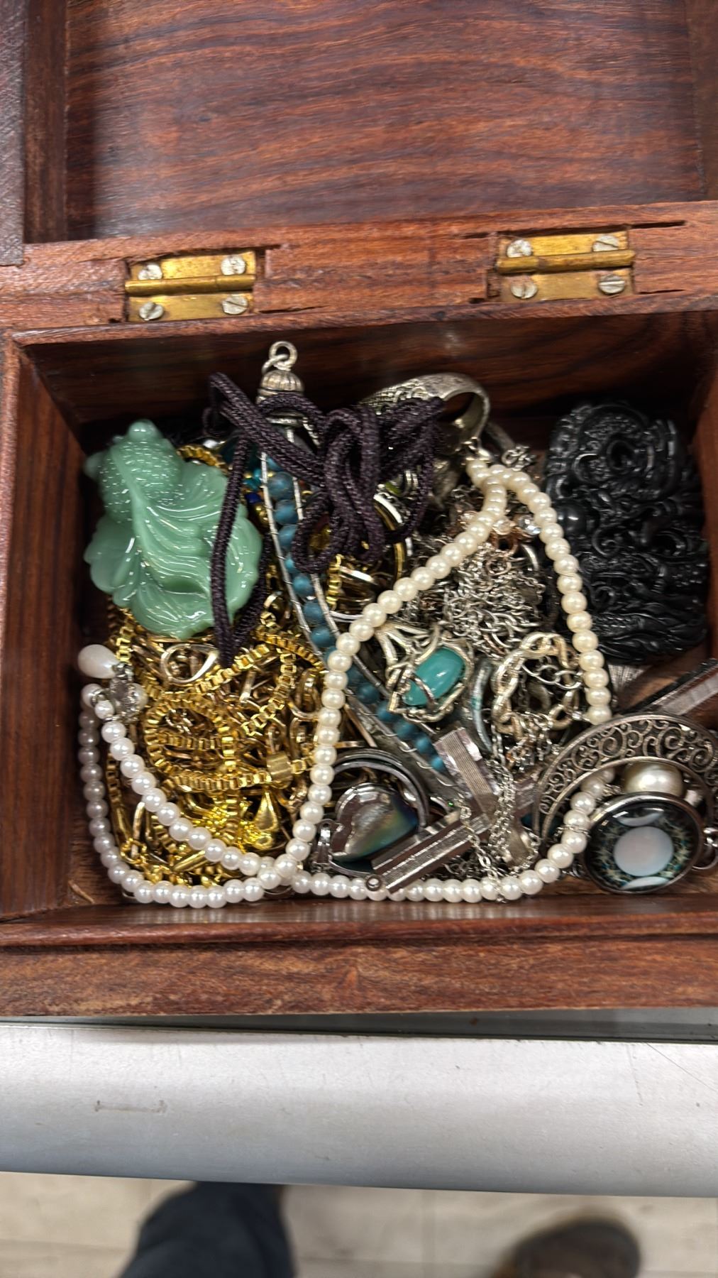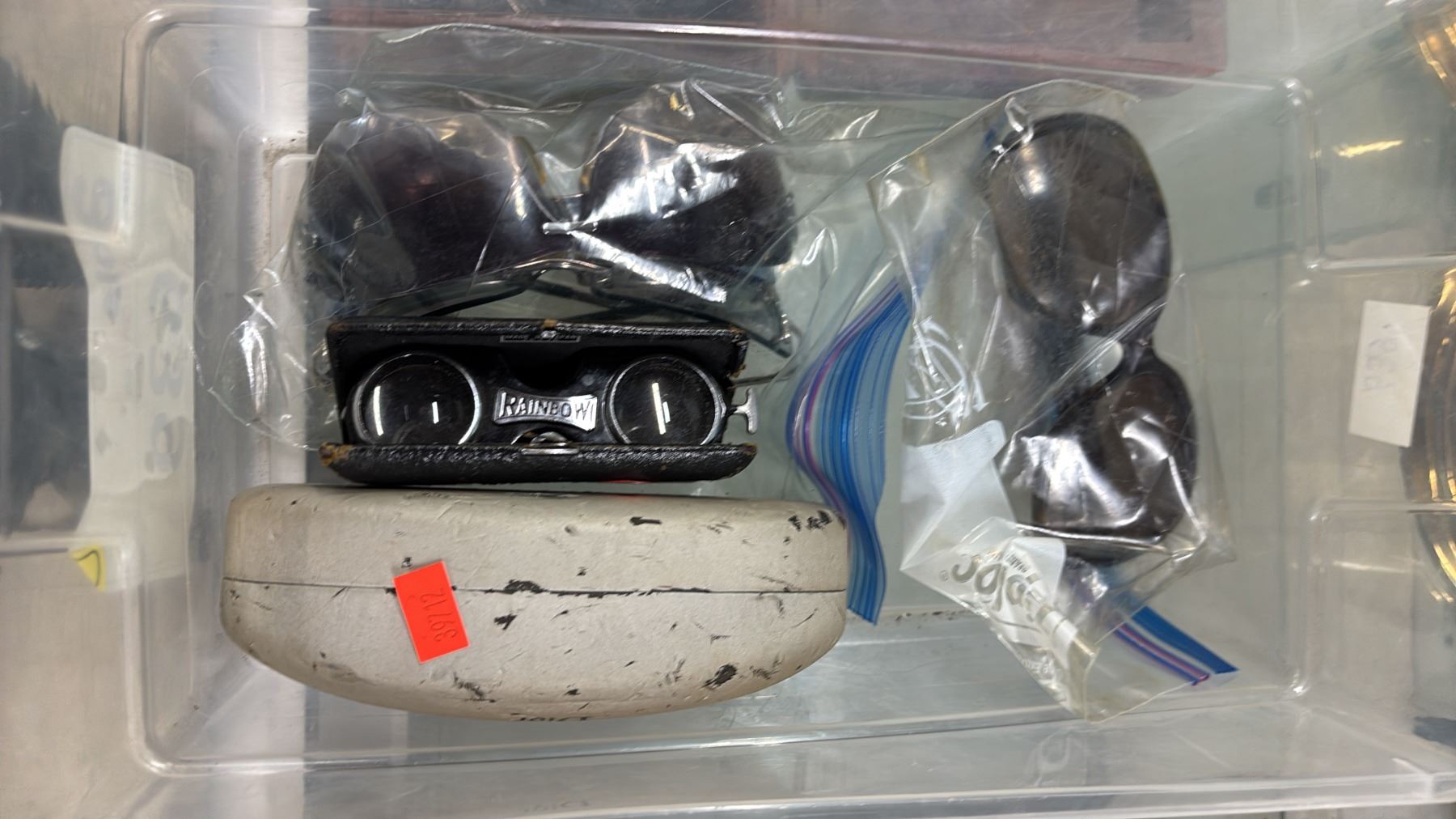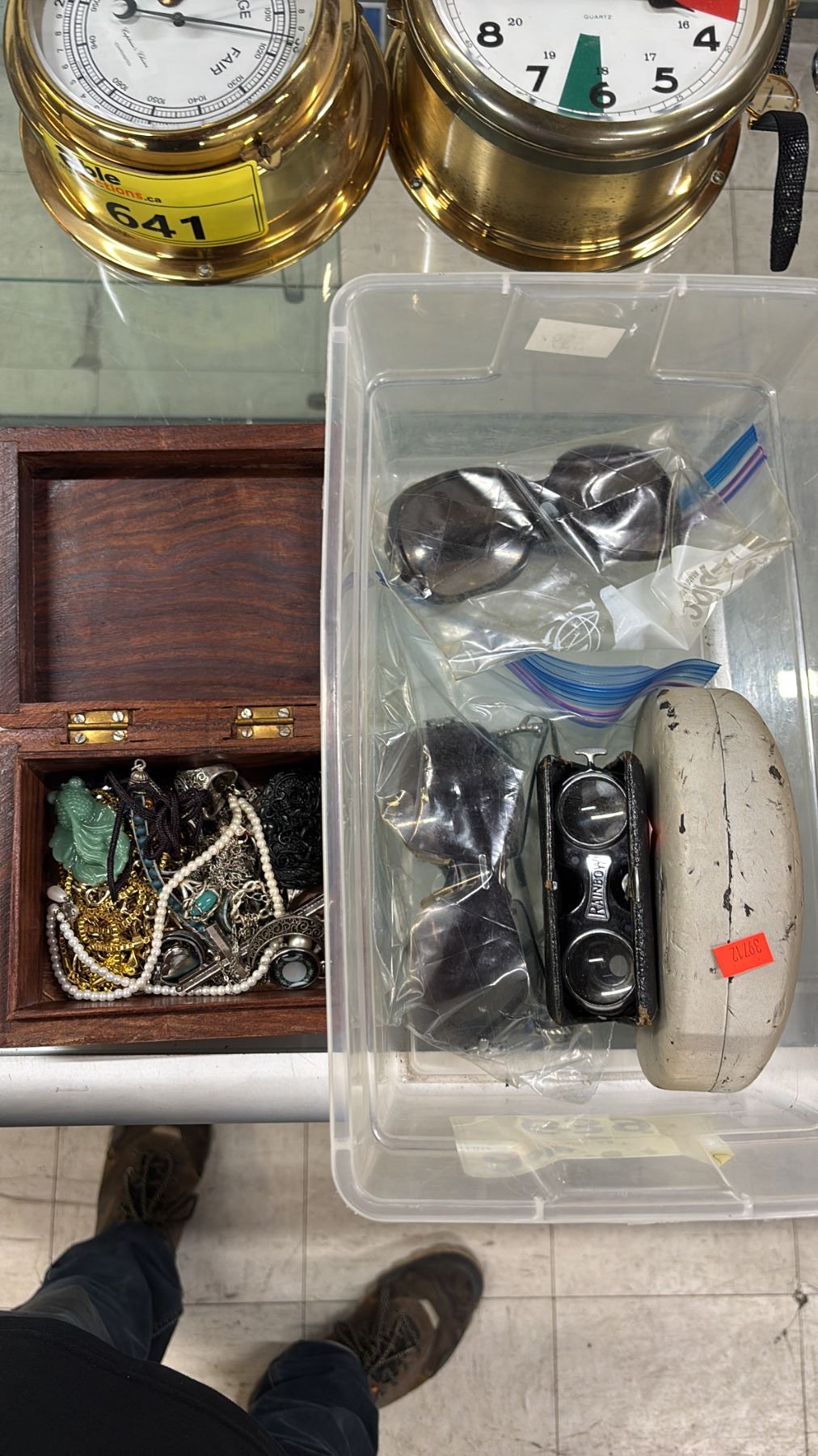 Lot 639 WOOD JEWELRY BOX & CONTENTS, 3 PAIRS OF SUNGLASSES & VINTAGE BINOCULARS
