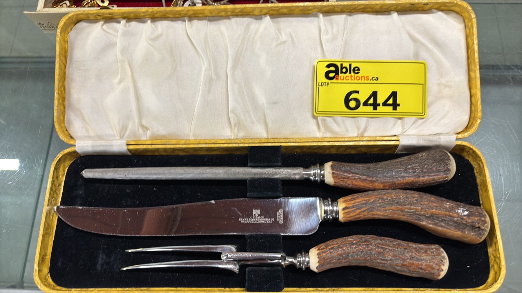 STAG HANDLED 3 PIECE CARVING SET & VINTAGE PANORAMA WOOD PLATE WITH KILLER WHALE DESIGN