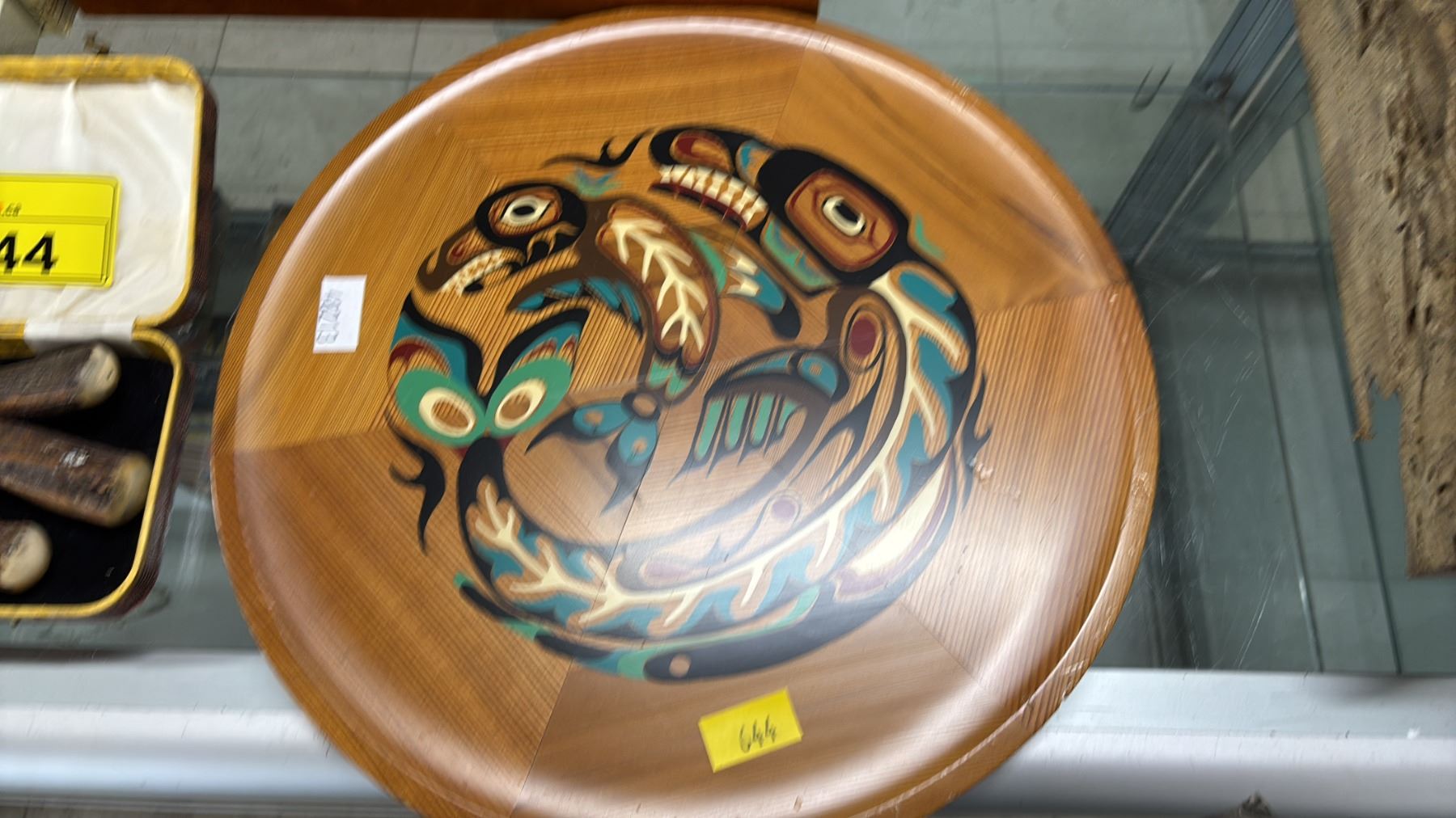 Lot 644 STAG HANDLED 3 PIECE CARVING SET & VINTAGE PANORAMA WOOD PLATE WITH KILLER WHALE DESIGN