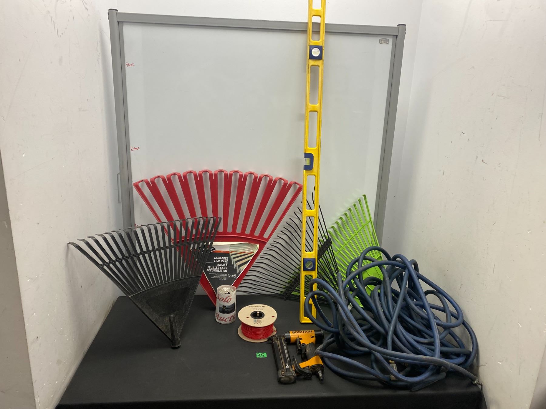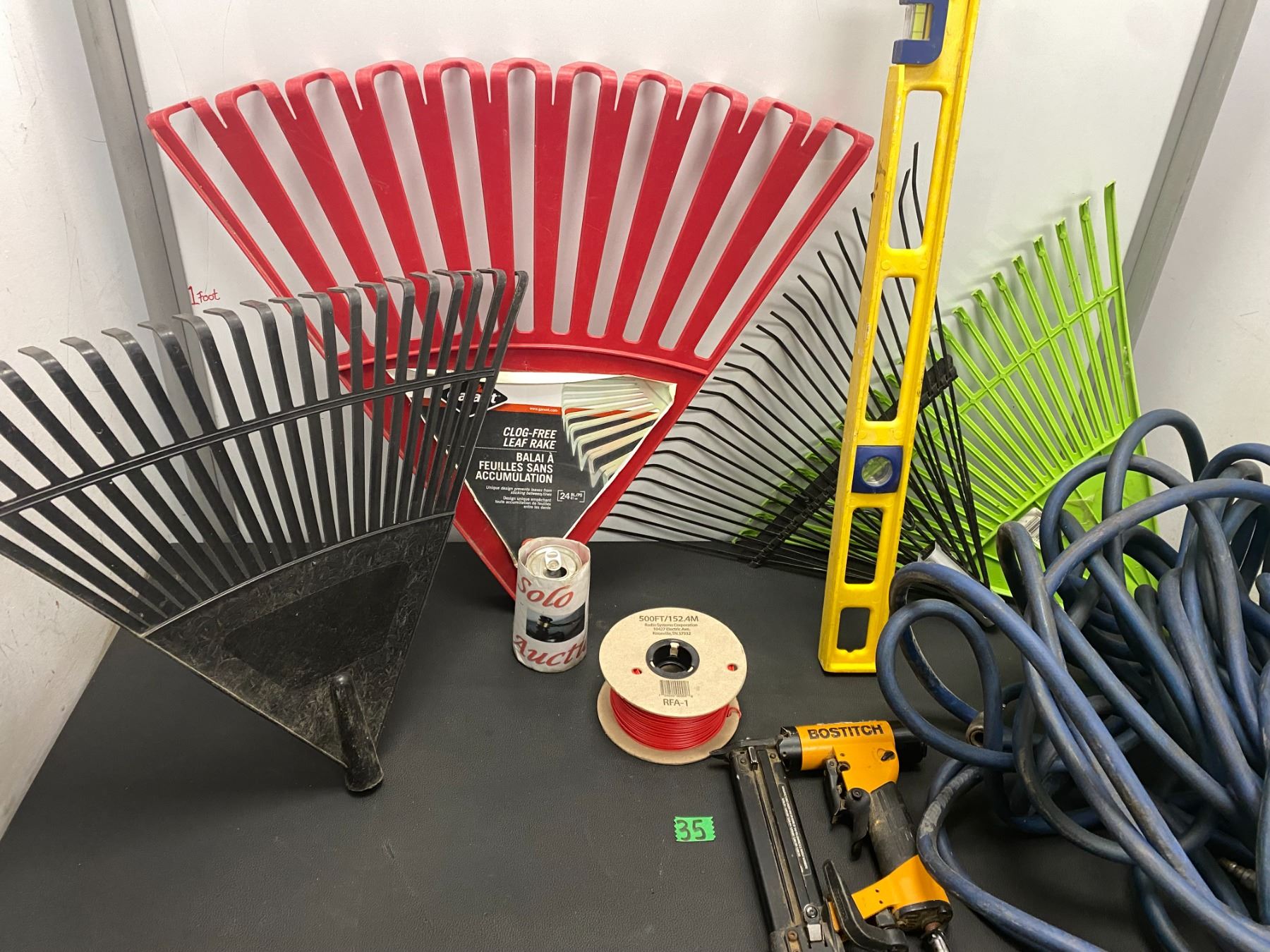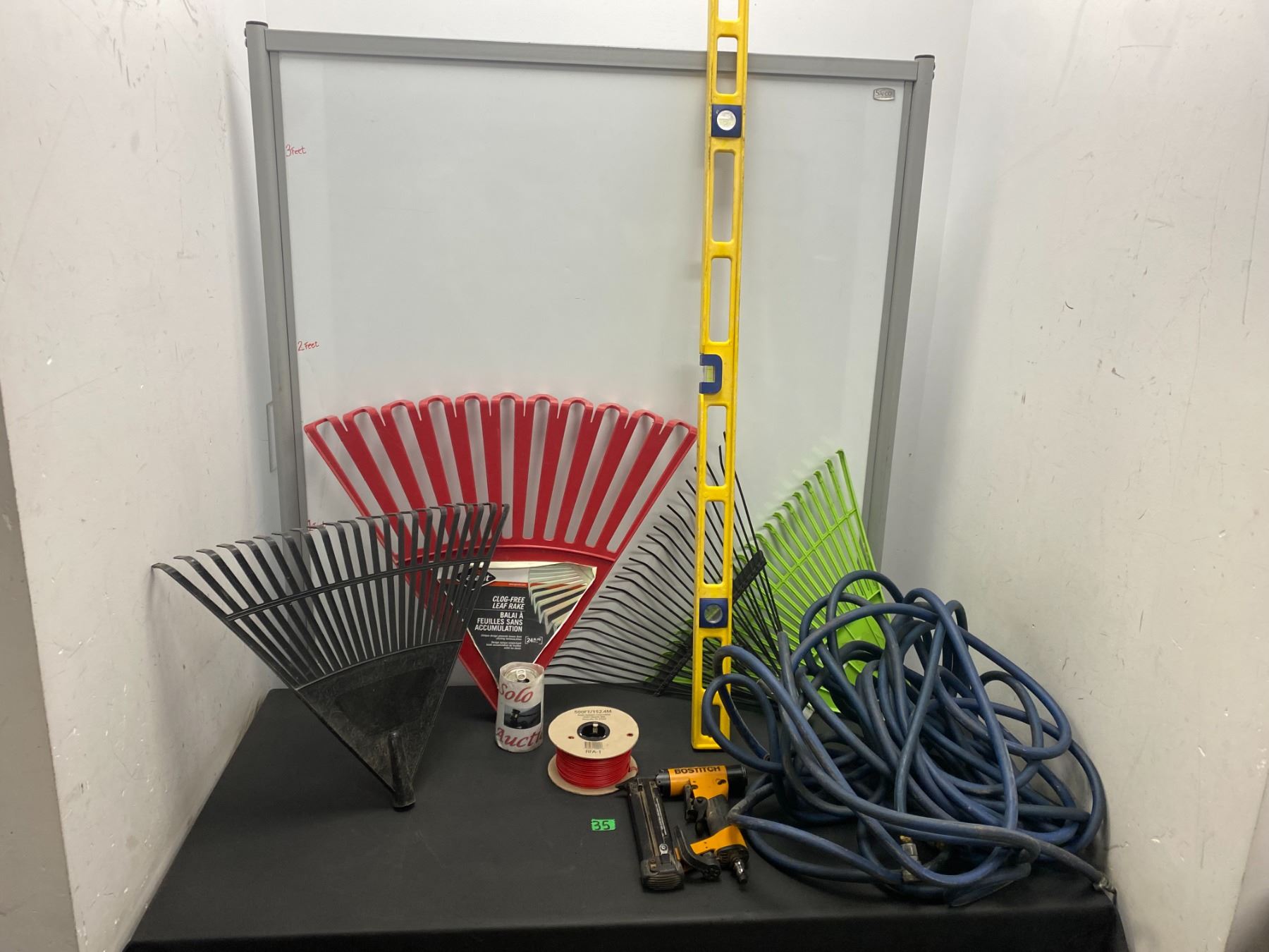 Lot 35 Lot of garden items including rakes, level and more