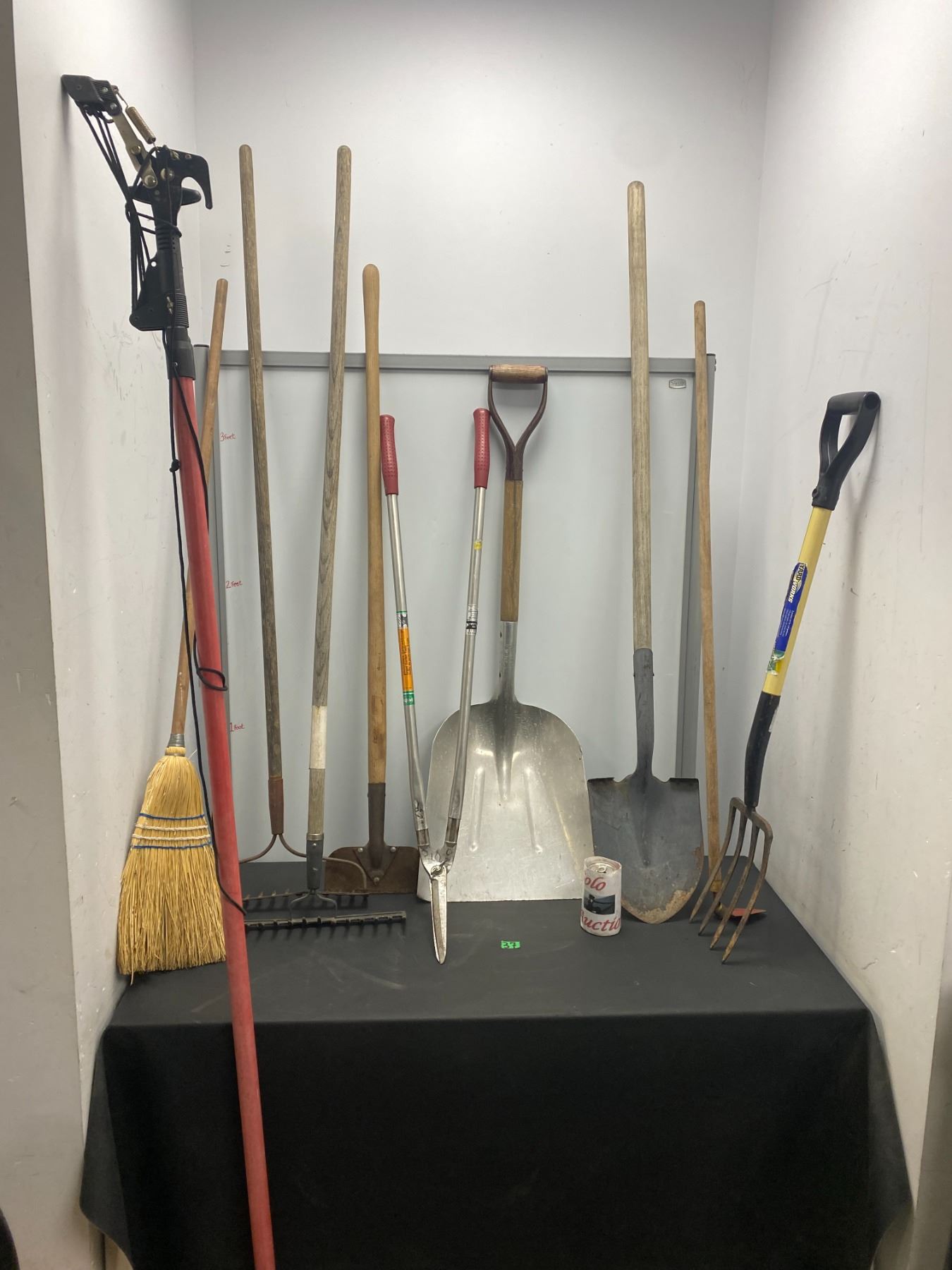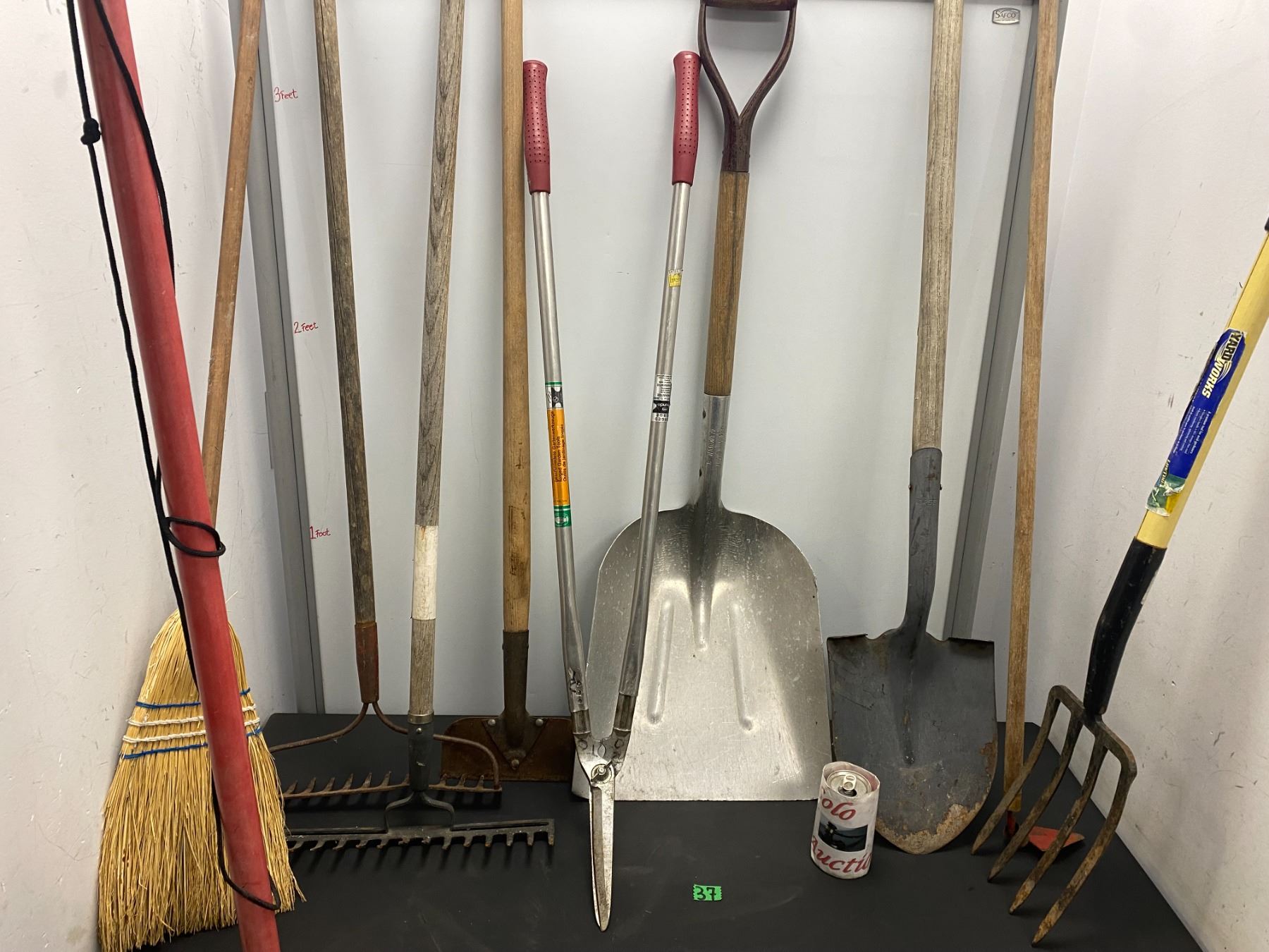 Lot 37 Lot of garden tools including rakes, shovels, broom and more