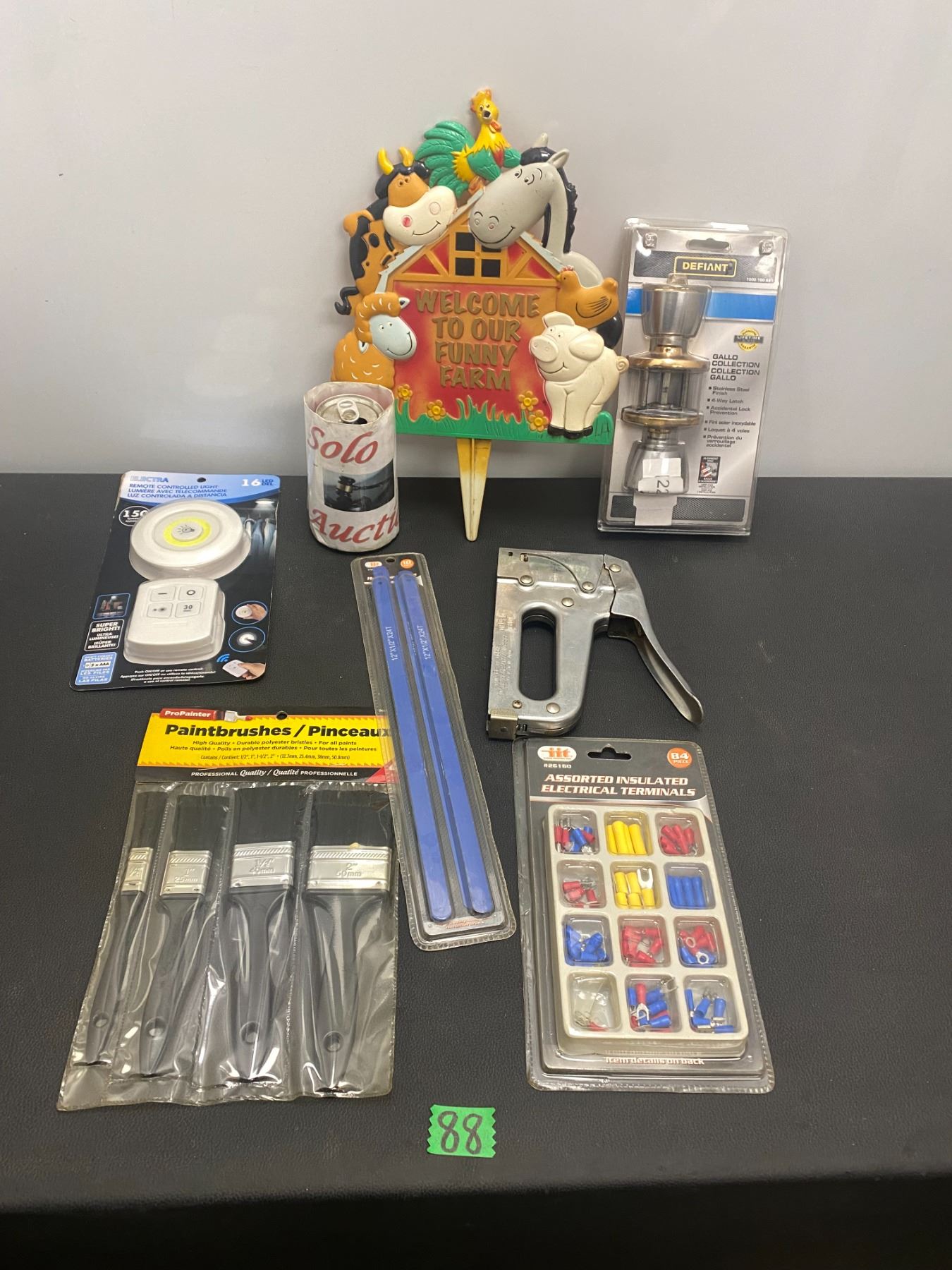 Lot 88 Assorted lot of items including door handle set, staple gun, paint brushes and more