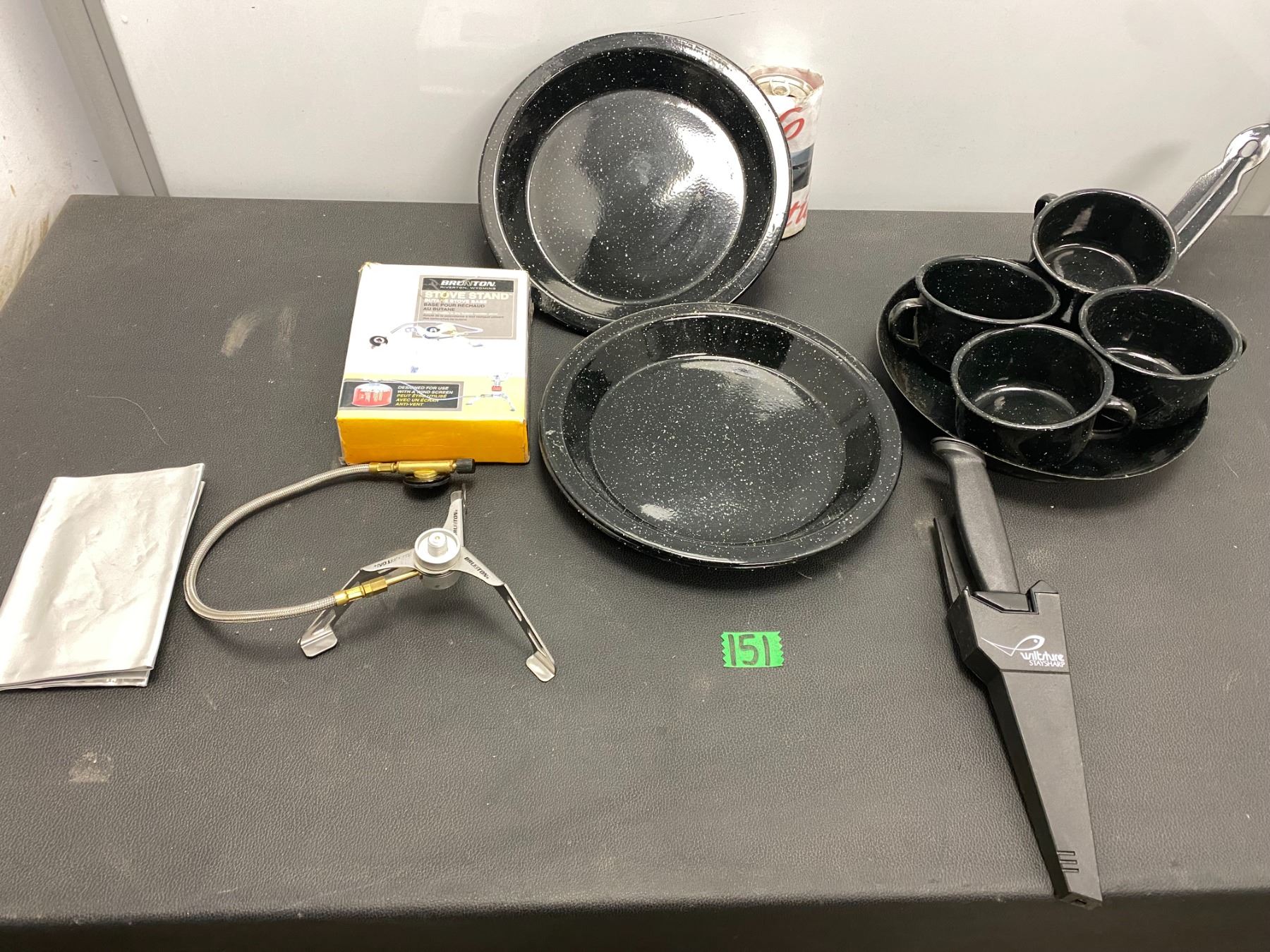 Lot 151 Small camp stove, camping cups and plate sets, knife