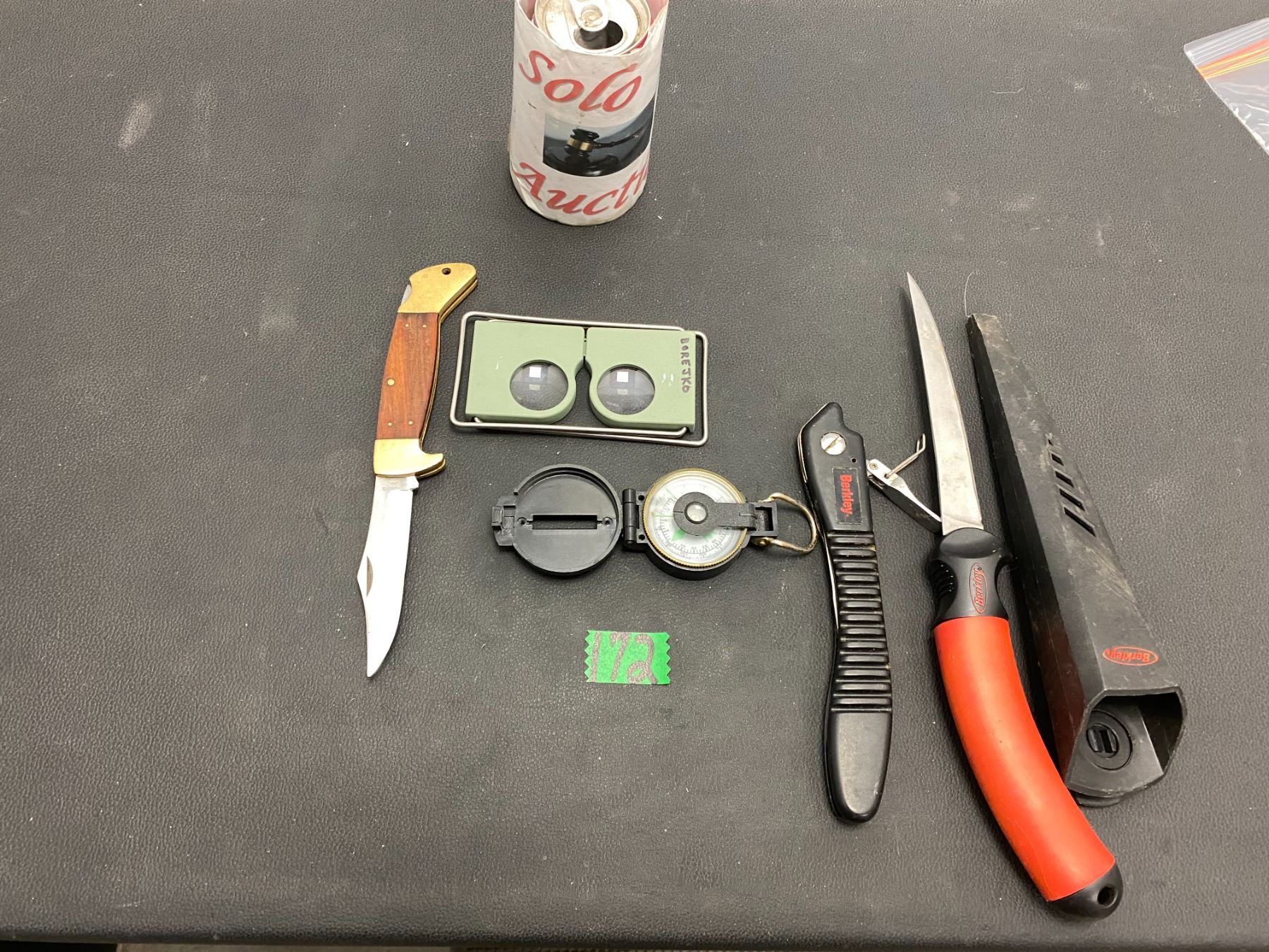 Lot 172 Lot of assorted items including fillet knife, folding knife, magnifying Lense and more