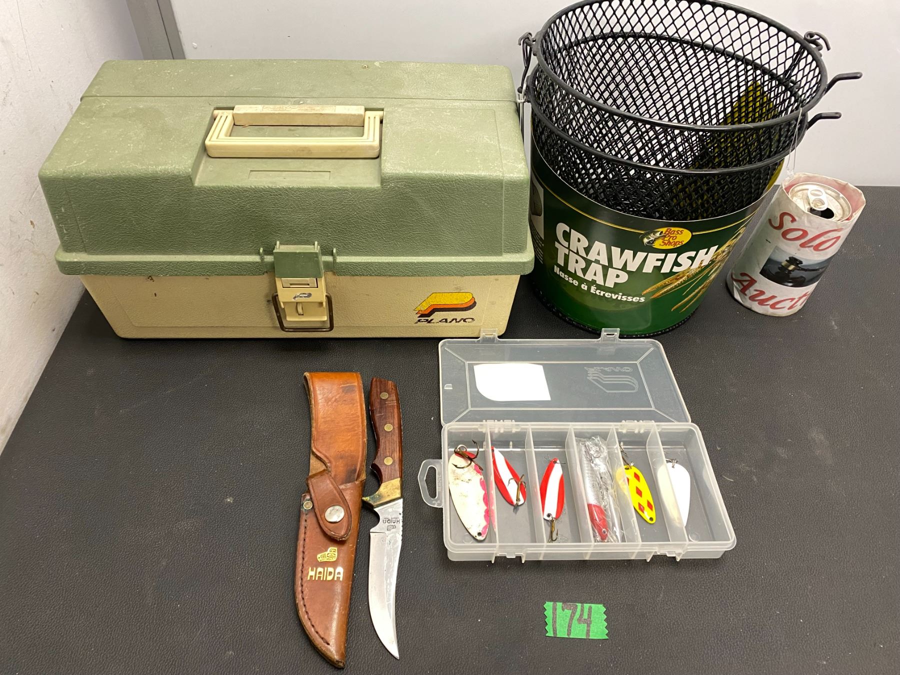 Lot 174 Fishing tackle box, tackle, fillet knife, and crawfish traps