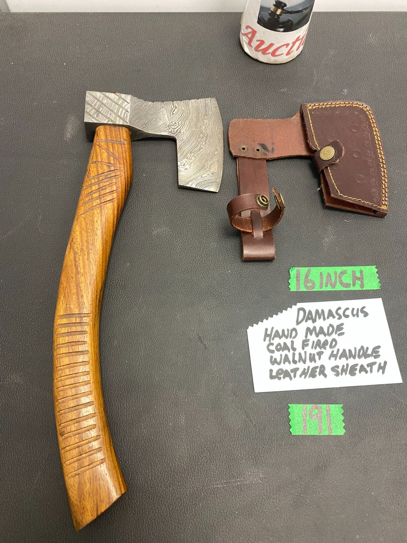 Lot 191 16 Inch Damascus hand made, coal fired, walnut handle with leather sheath