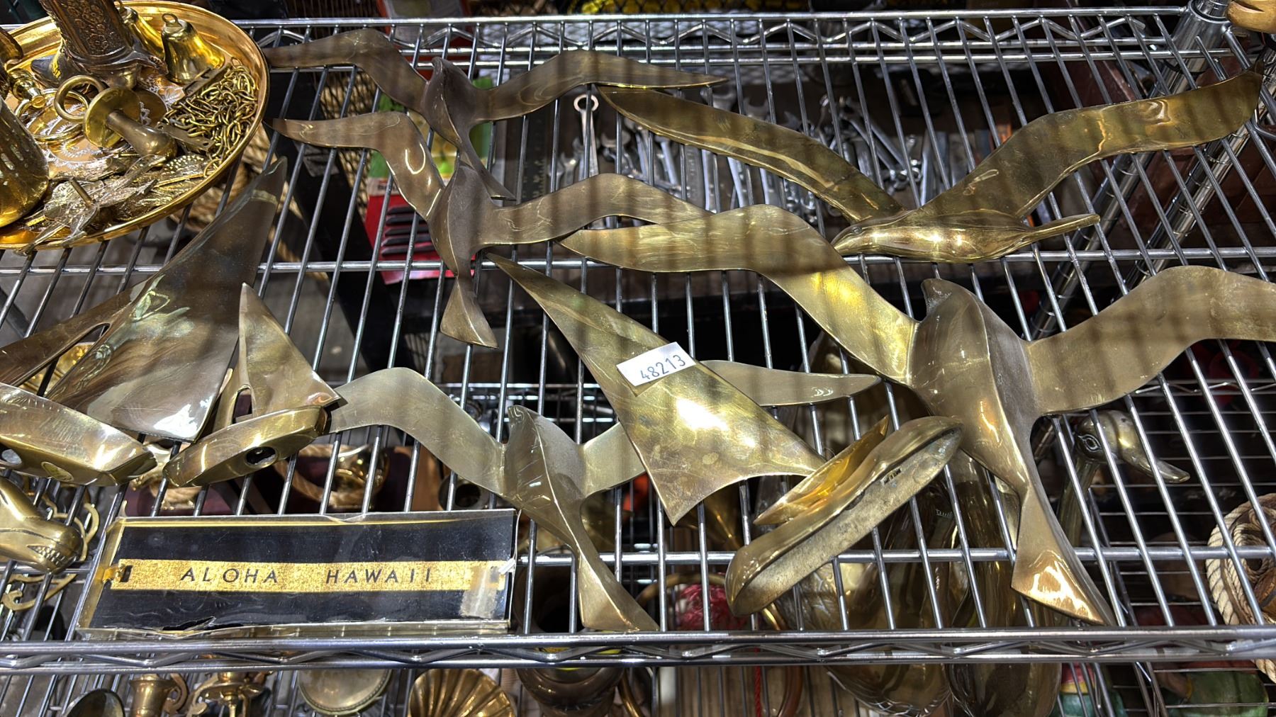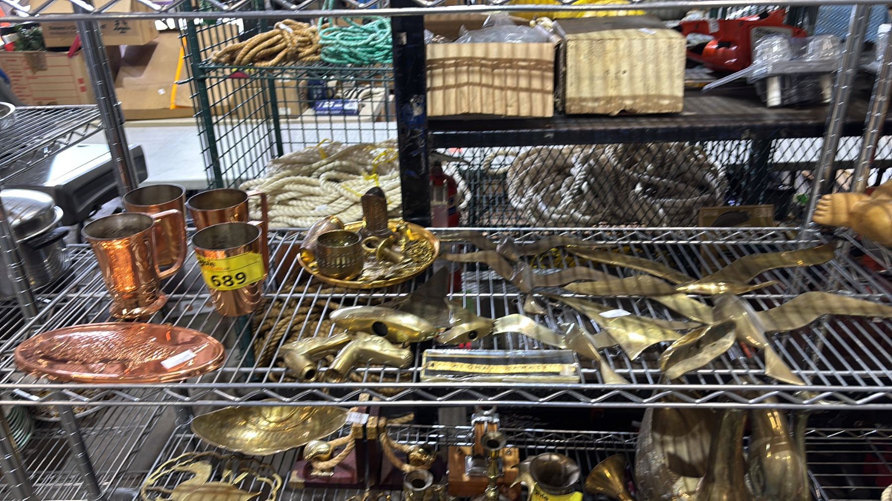 SHELF OF BRASS WALL DECO, COPPER CUPS & MORE