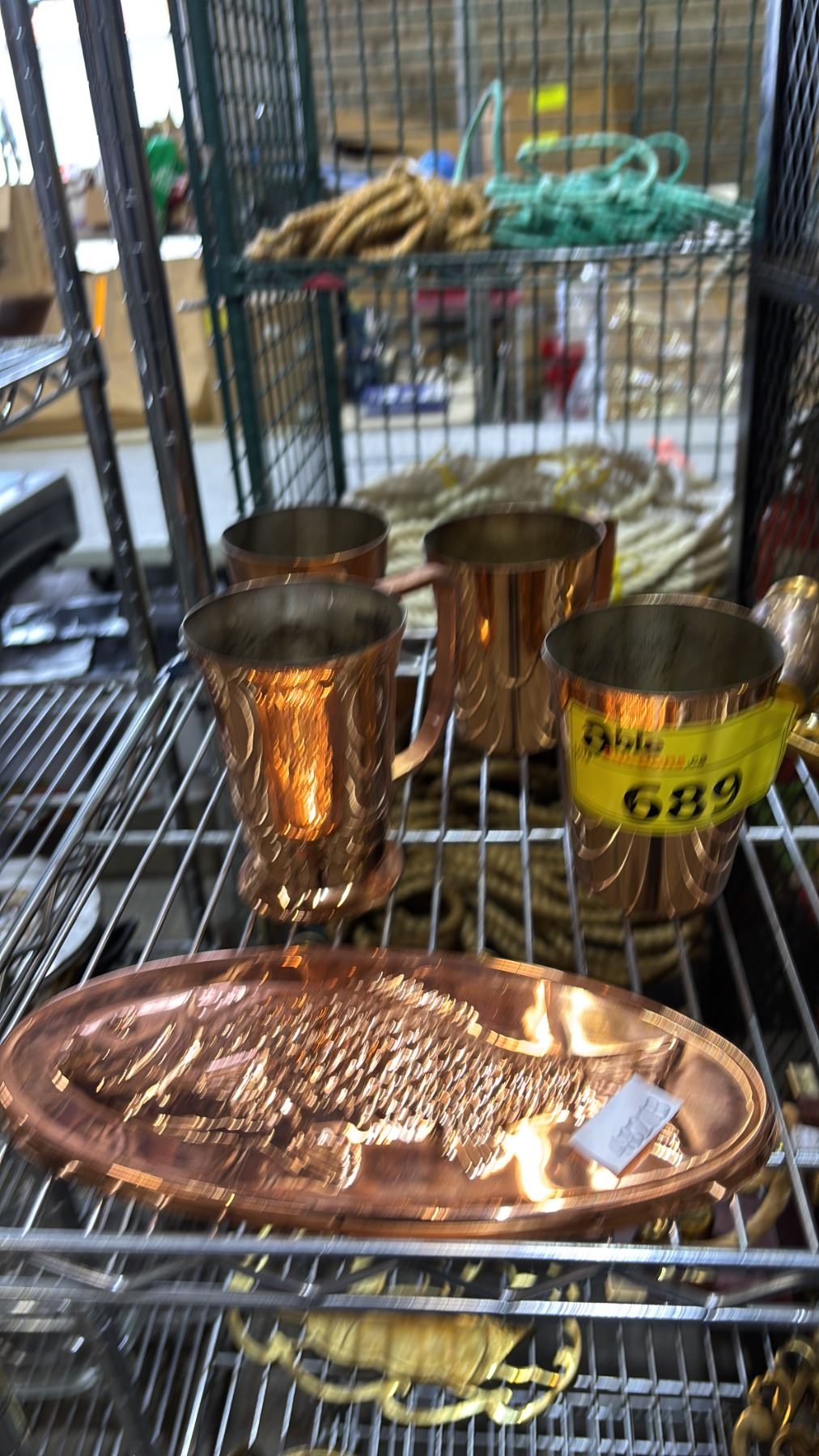 Lot 689 SHELF OF BRASS WALL DECO, COPPER CUPS & MORE