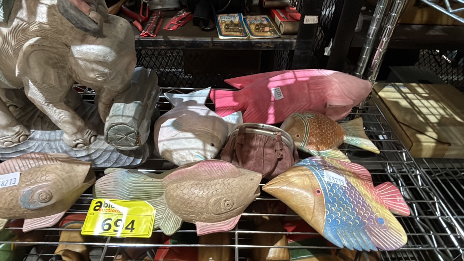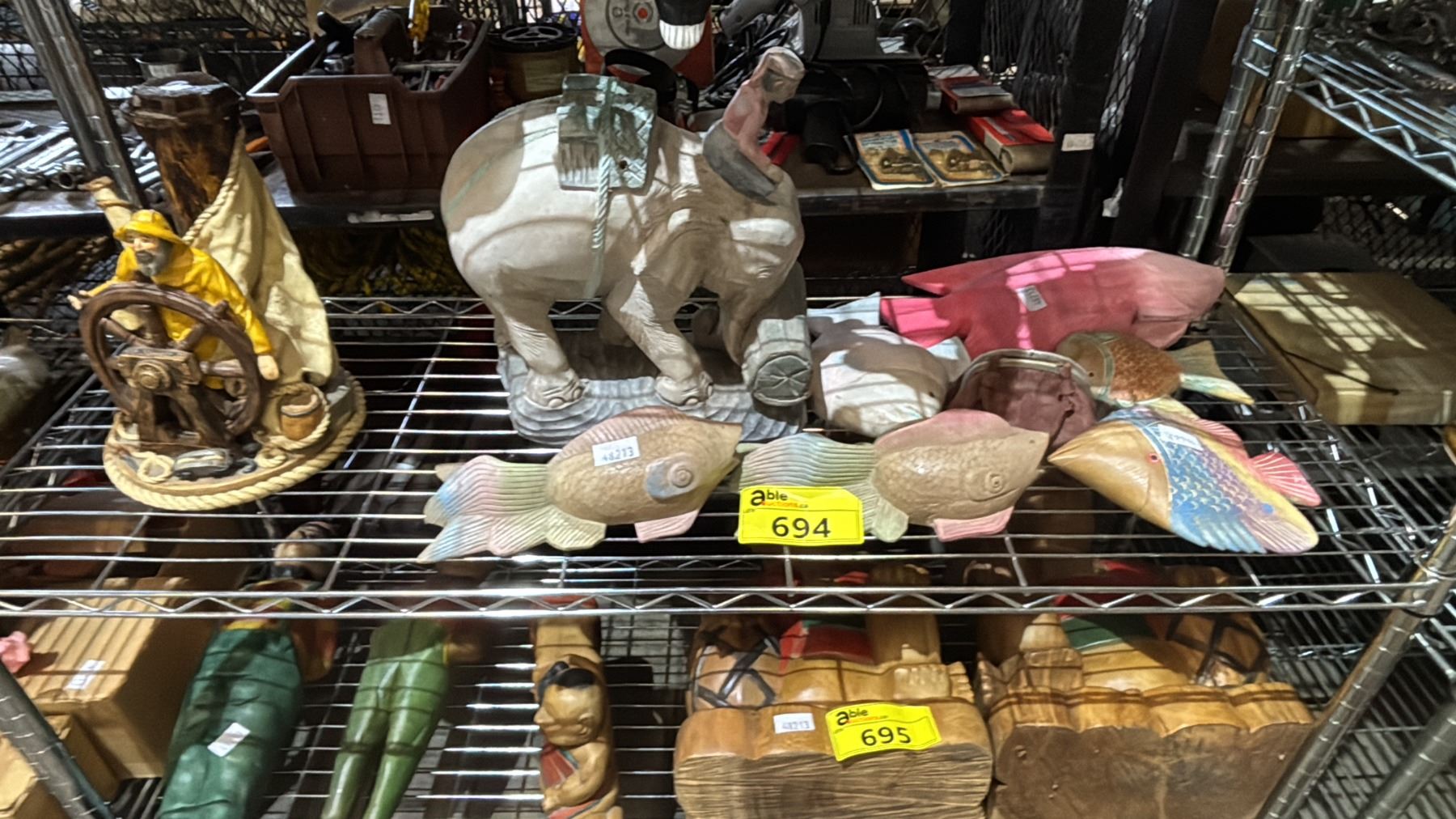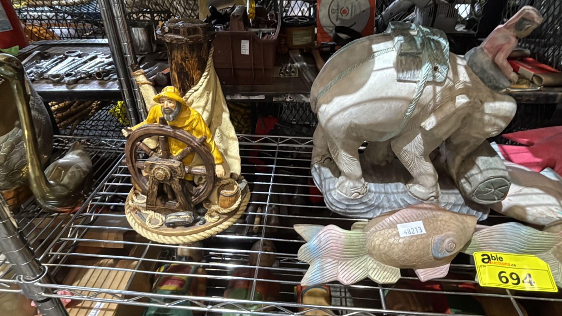 Lot 694 PAINTED WOOD ELEPHANT, PAINTED WOOD FISH & PORCELAIN SAILOR STATUE