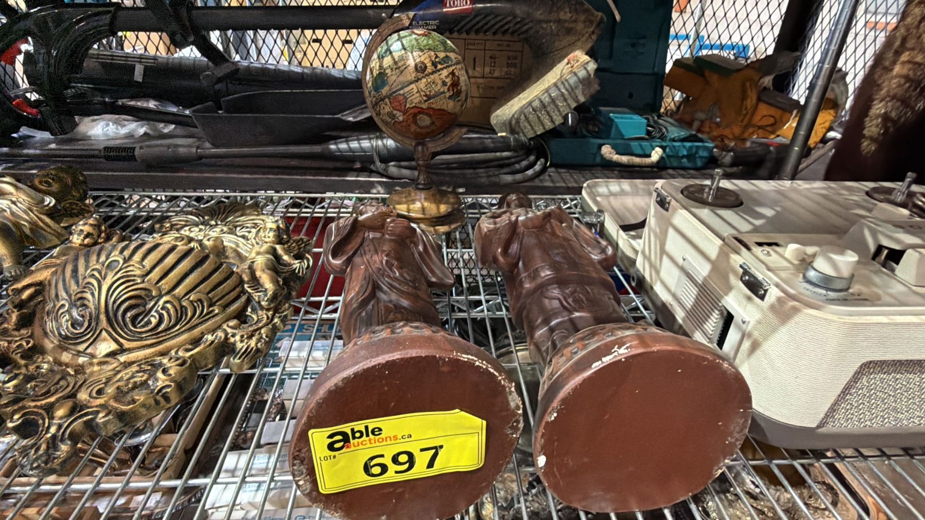Lot 697 VINTAGE SONY REEL-TO-REEL TAPECORDER, CERAMIC FIGURINES, SMALL GLOBE, CHALKWARE ASIAN FIGURES & MORE