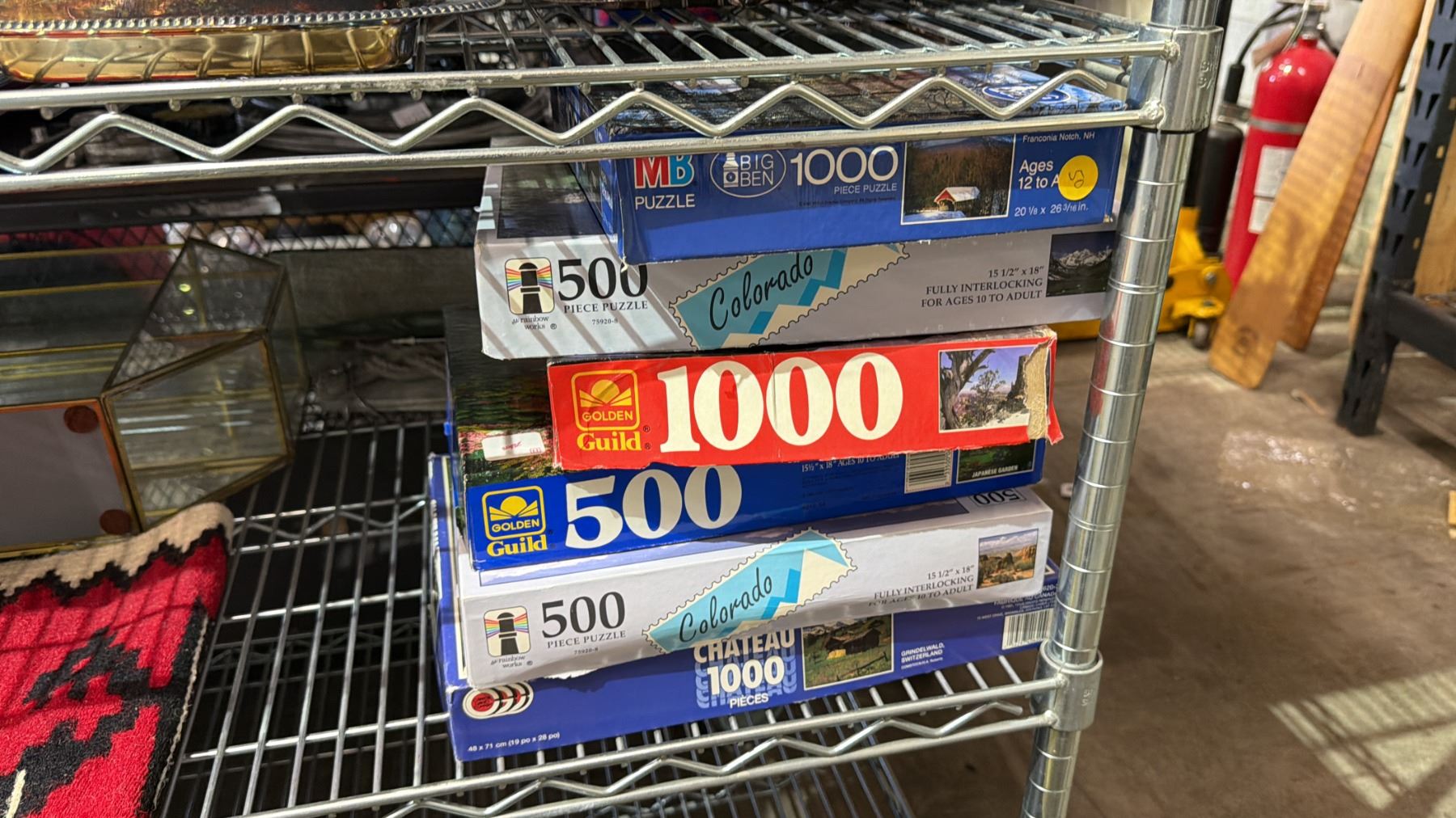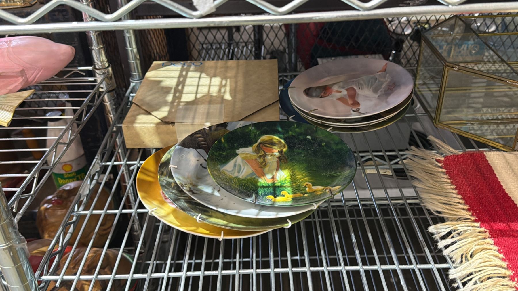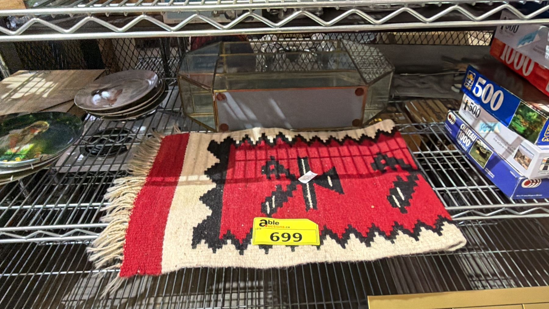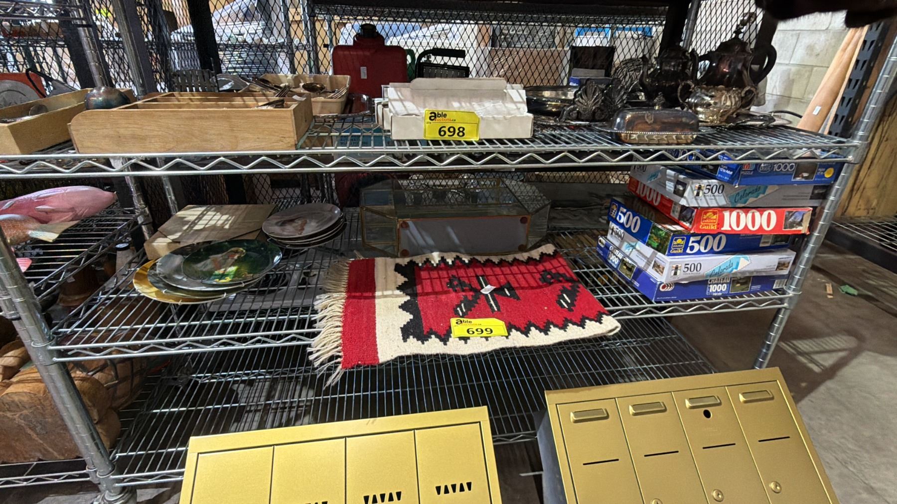 Lot 699 SHELF OF ASSORTED PUZZLES, COLLECTOR PLATES, TABLE RUNNER & MORE