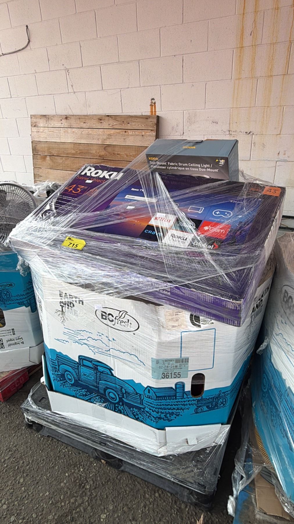 Lot 715 PALLET OF HOUSEHOLD GOODS INCLUDING: ROKU TV, KODA CEILING LIGHT, KEURIG COFFEE MAKER & MORE