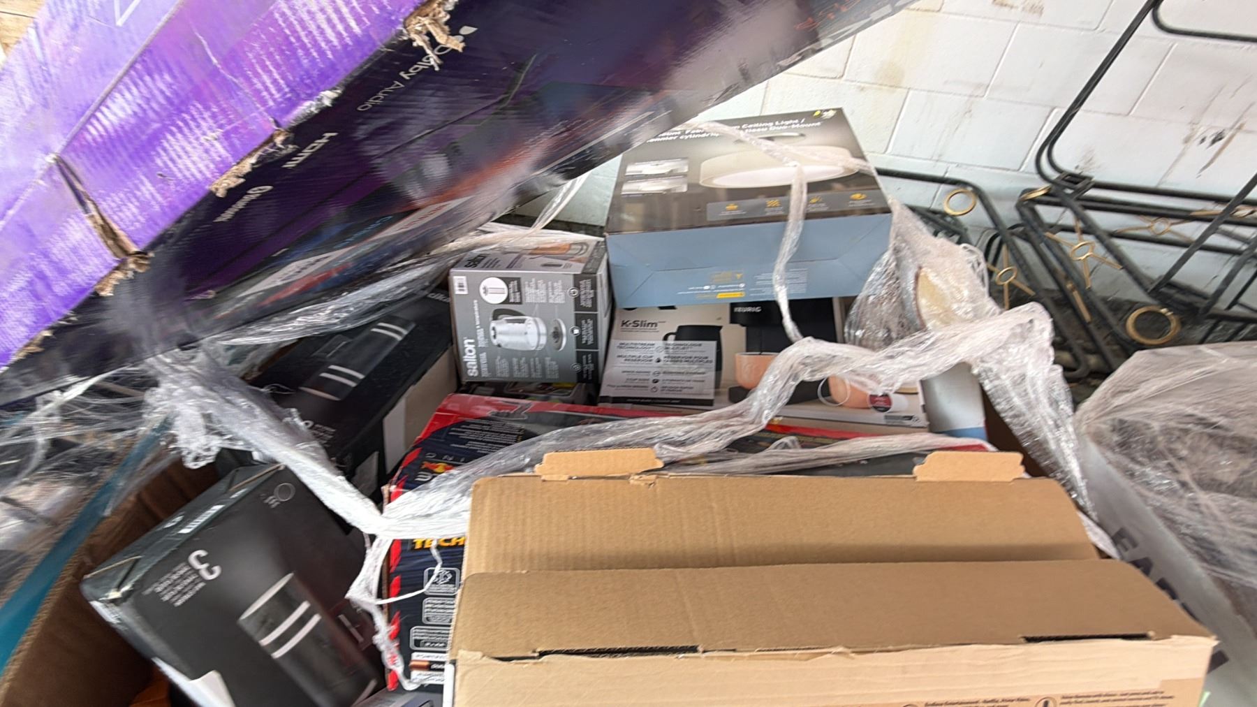 PALLET OF HOUSEHOLD GOODS INCLUDING: ROKU TV, KODA CEILING LIGHT, KEURIG COFFEE MAKER & MORE *WORKING CONDITION UNKNOWN/MAY BE MISSING PARTS AND OR PIECES/MUST TAKE ALL ON PALLET*