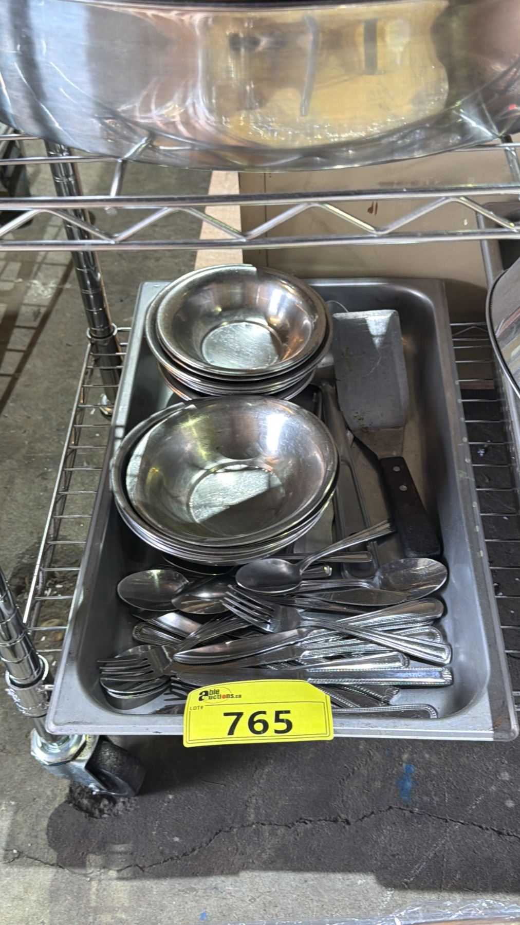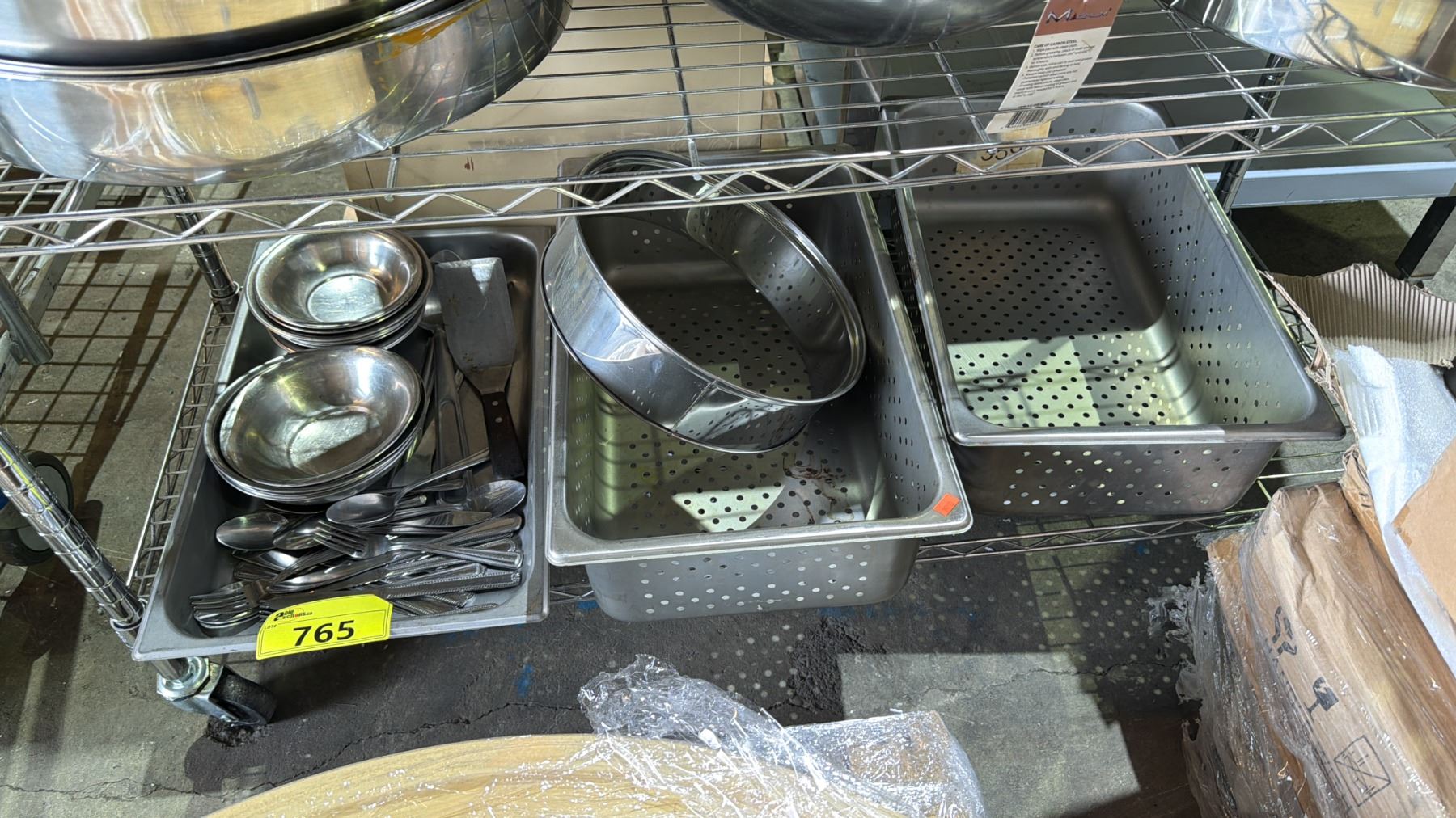 Lot 765 SHELF OF ASSORTED FLATWARE, COOKWARE & MORE