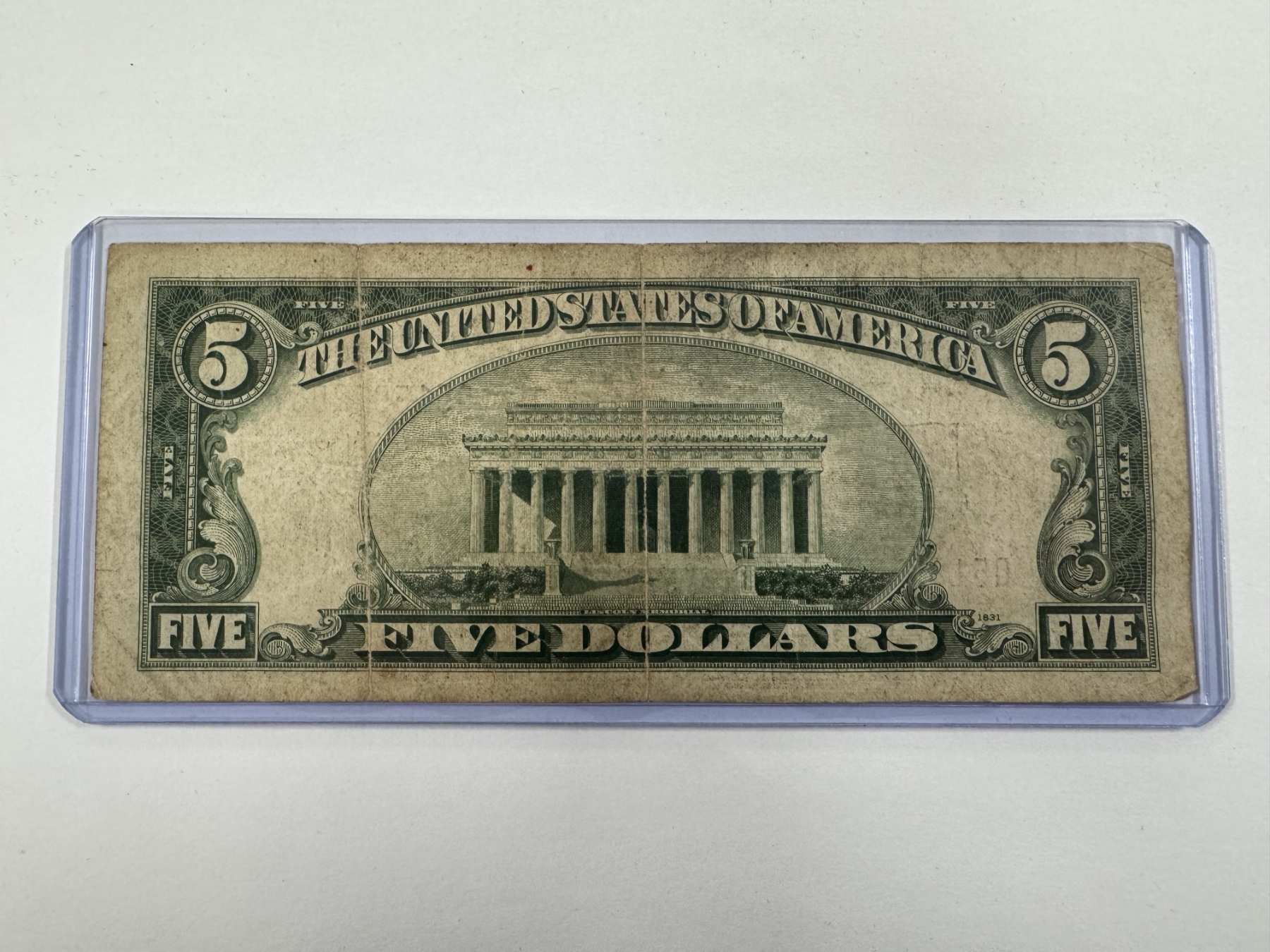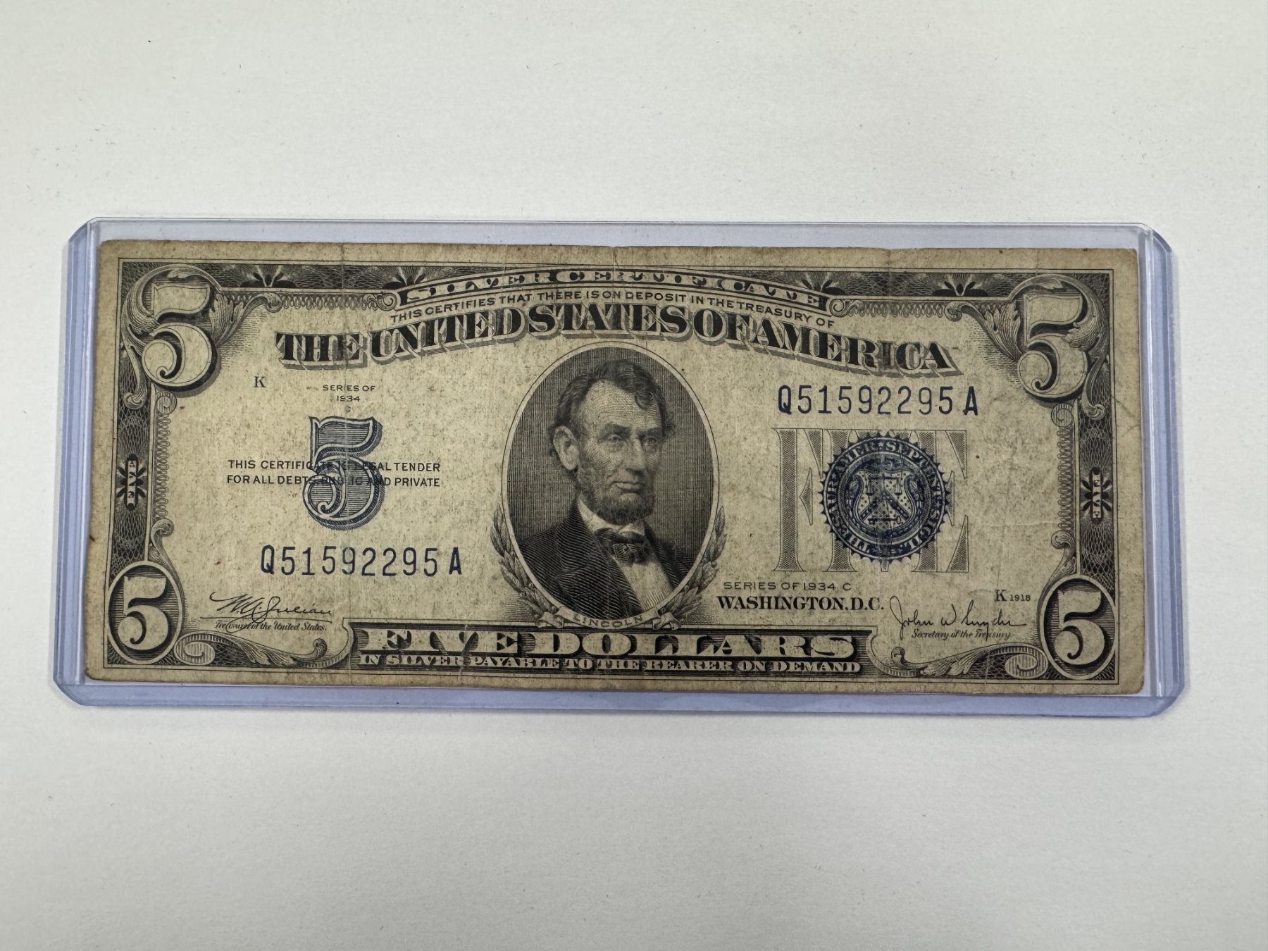 1934 United States Lincoln $5.00 Silver Certificate Note in Protective Holder - Great Piece