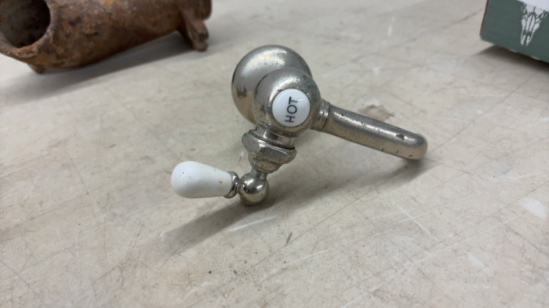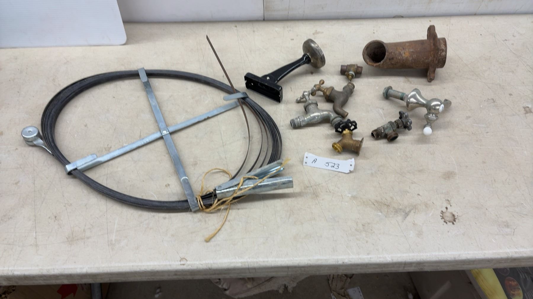 Lot 523 Vintage Plumbing Lot: Fish Tape Reel, Assorted Brass Faucets, Valves, and Cast Iron Pipe Fitting