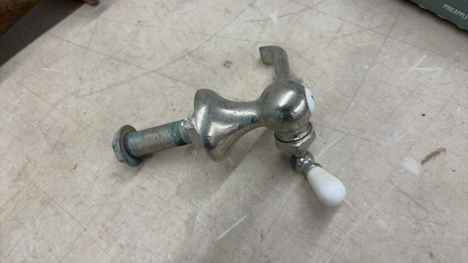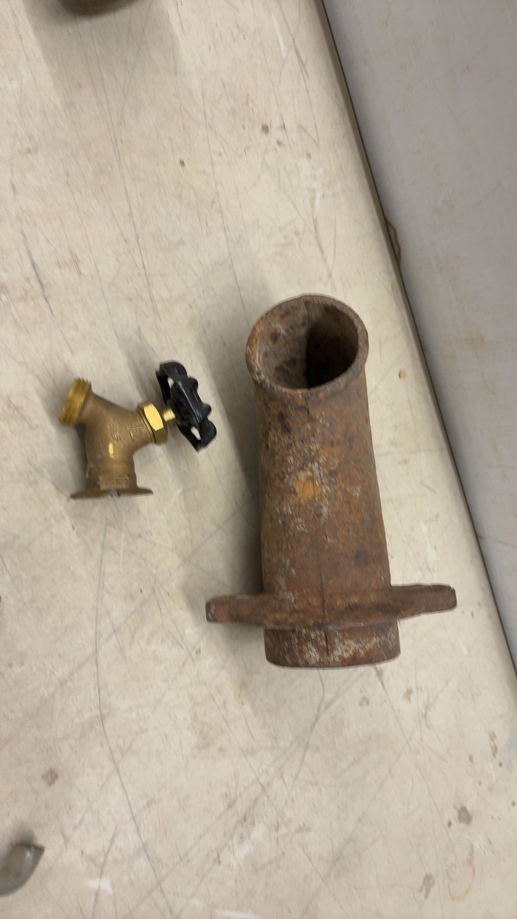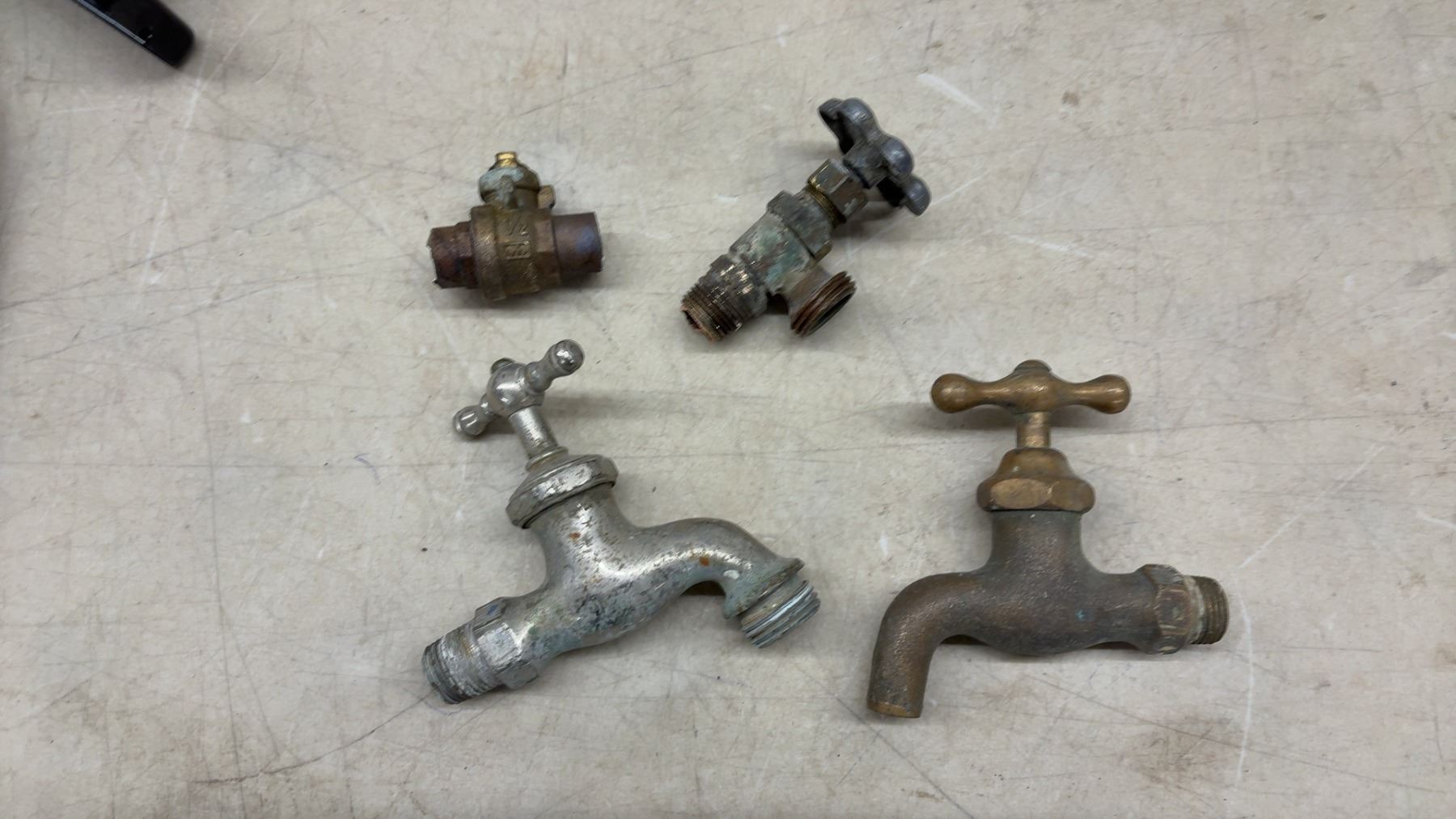 Vintage Plumbing Lot: Fish Tape Reel, Assorted Brass Faucets, Valves, and Cast Iron Pipe Fitting