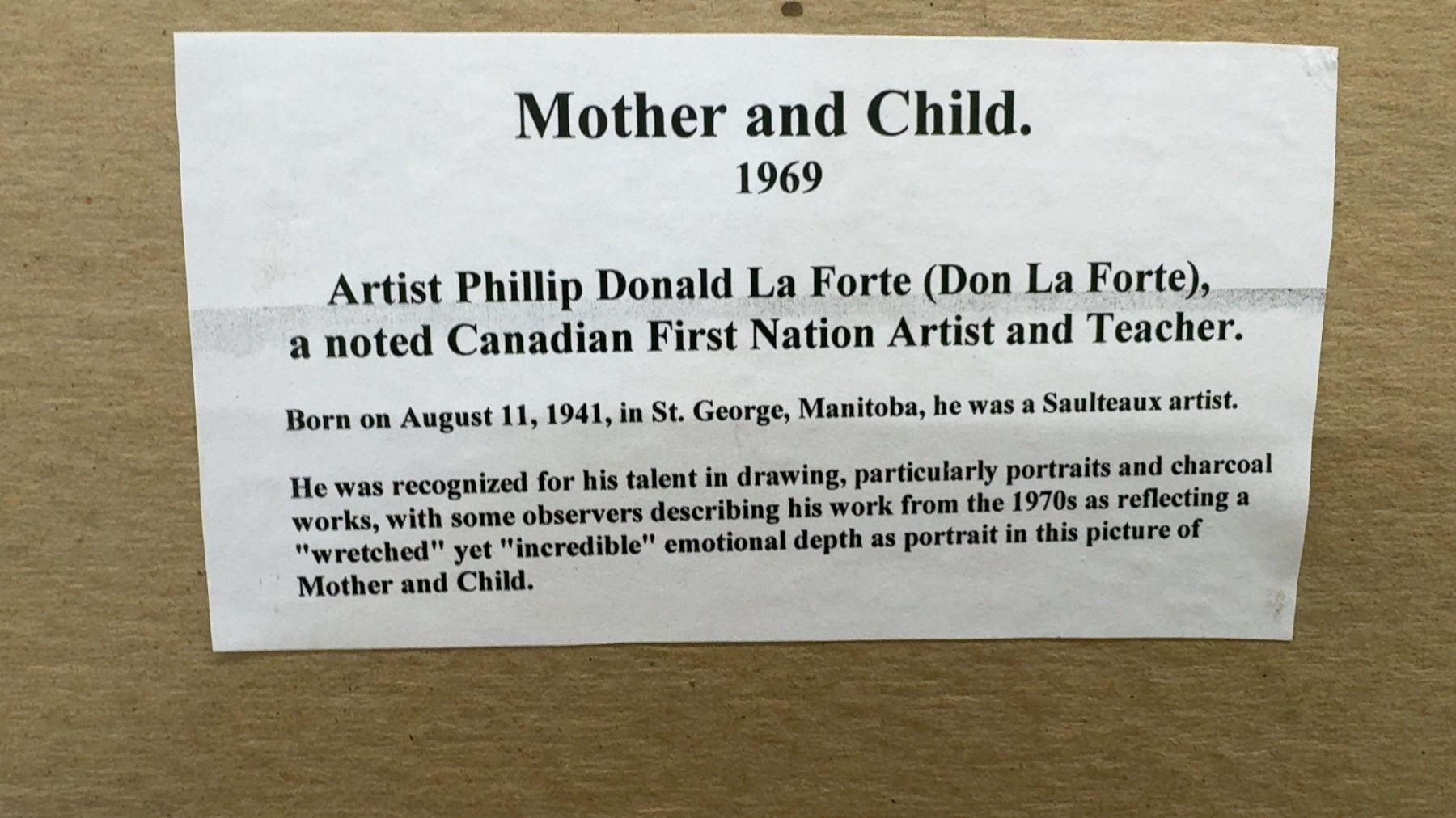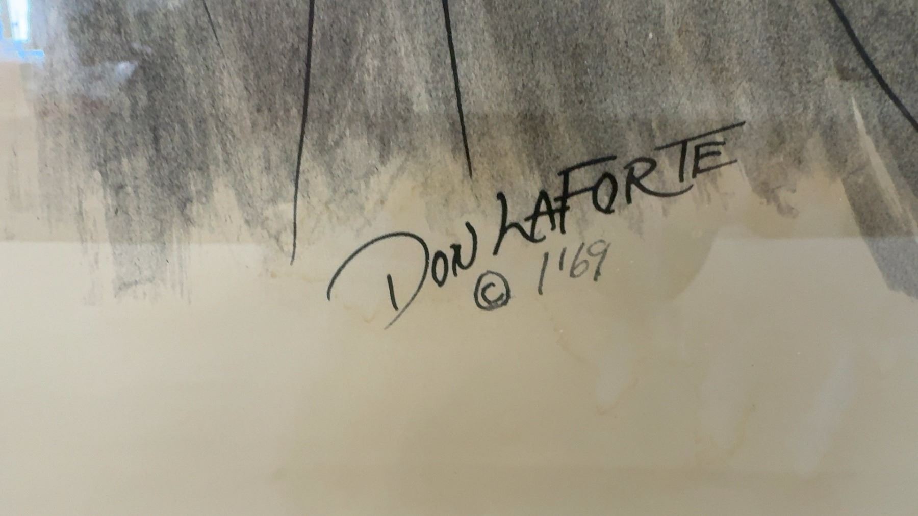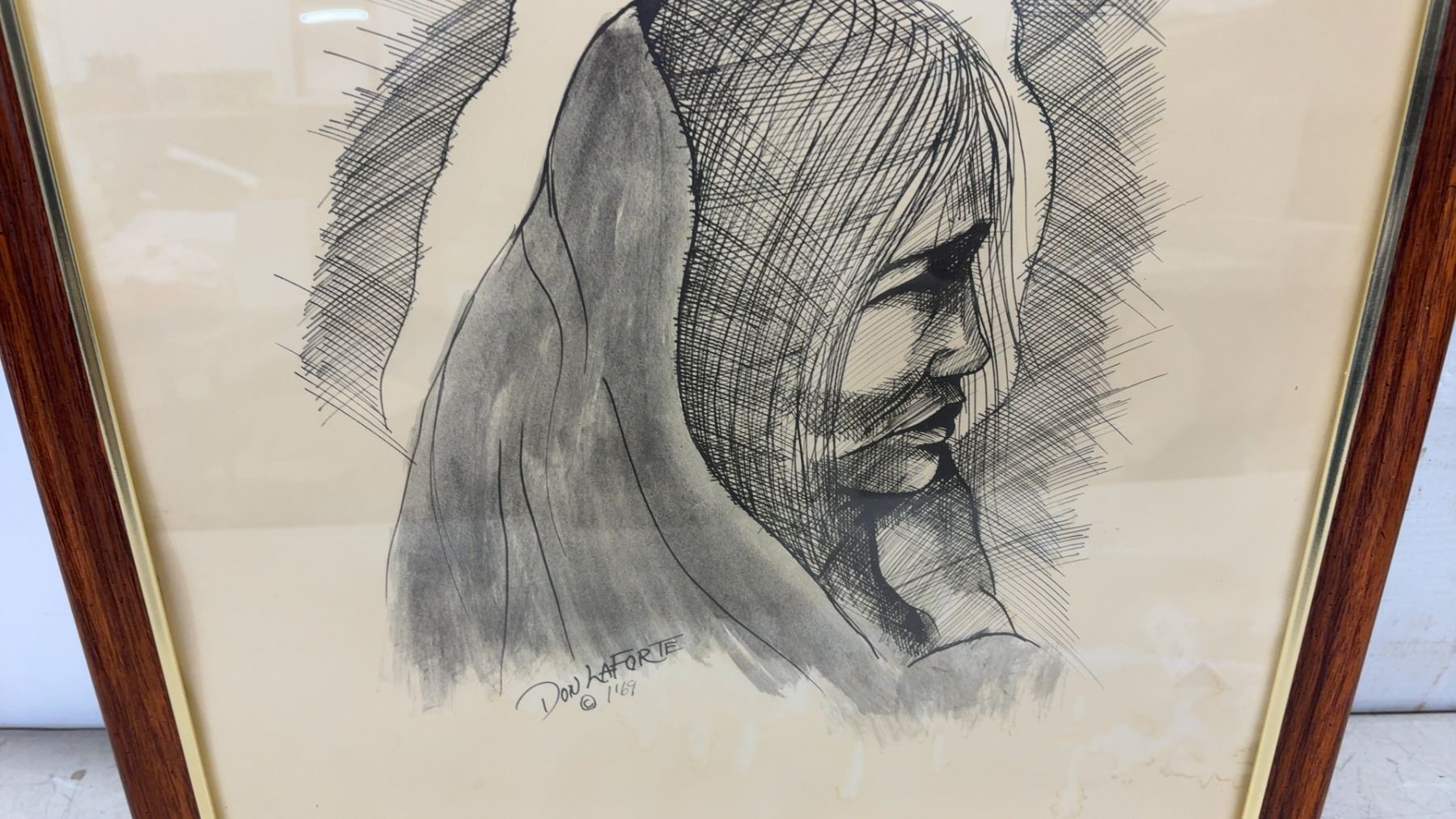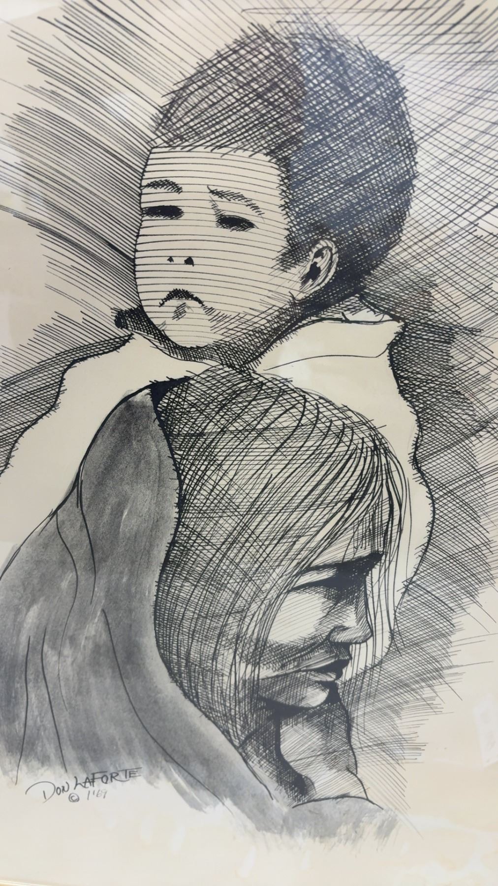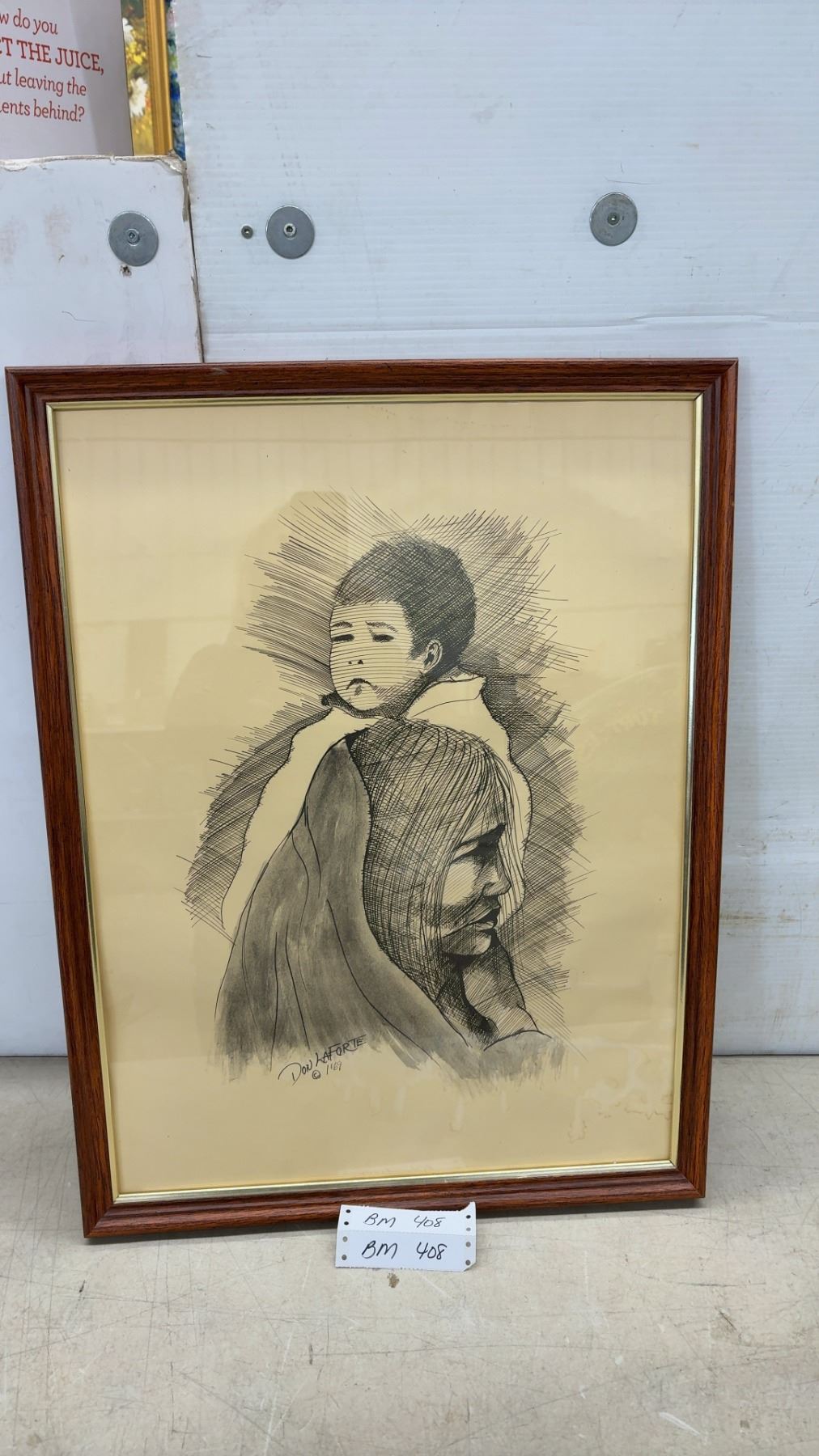 Lot 408 Don LaForte "Mother and Child" 1969 Signed Ink Drawing, Framed, Canadian First Nation Artist 25 1/2