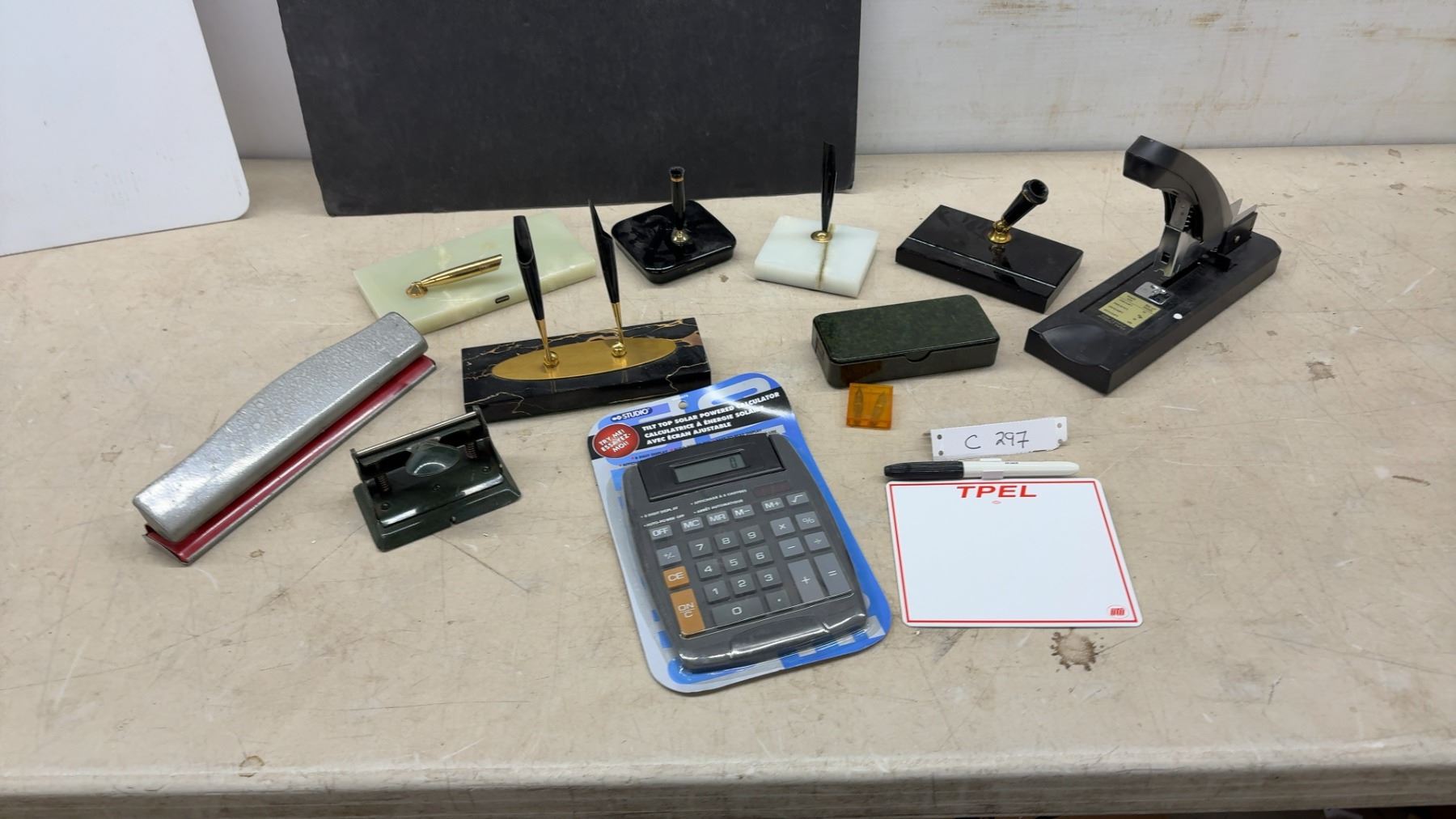 Lot 297 Office Supplies Lot: Heavy-Duty Stapler, Hole Punches, Pen Stands, Solar Calculator, Notepad and