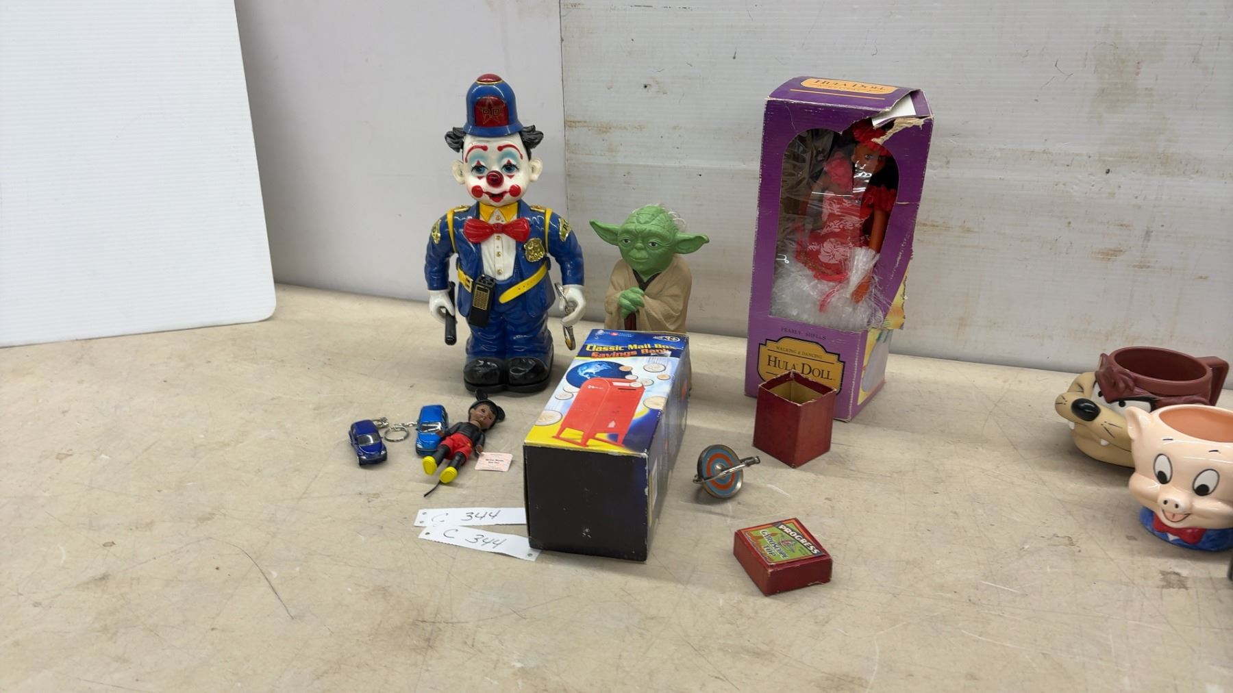 Lot 344 Vintage Toy Lot: Police Clown Figure, Star Wars Yoda Figure, Hula Doll, Mailbox Bank, Porky Pig Mug
