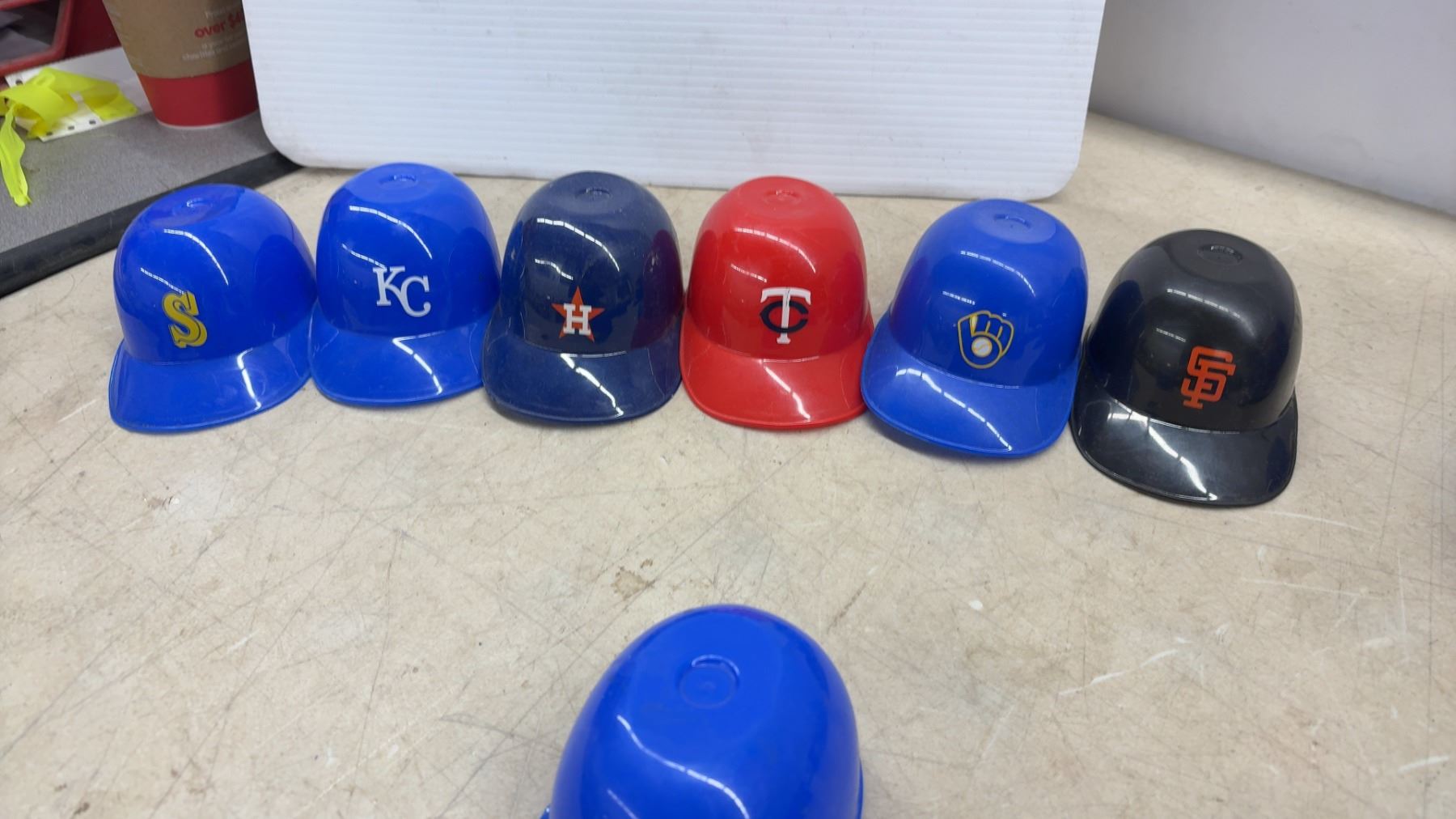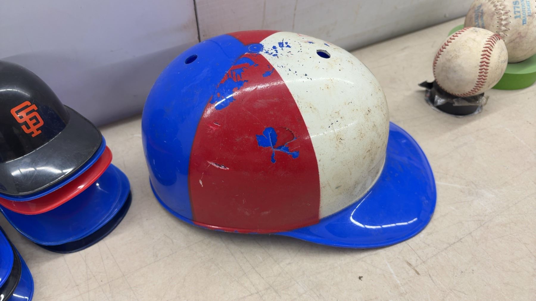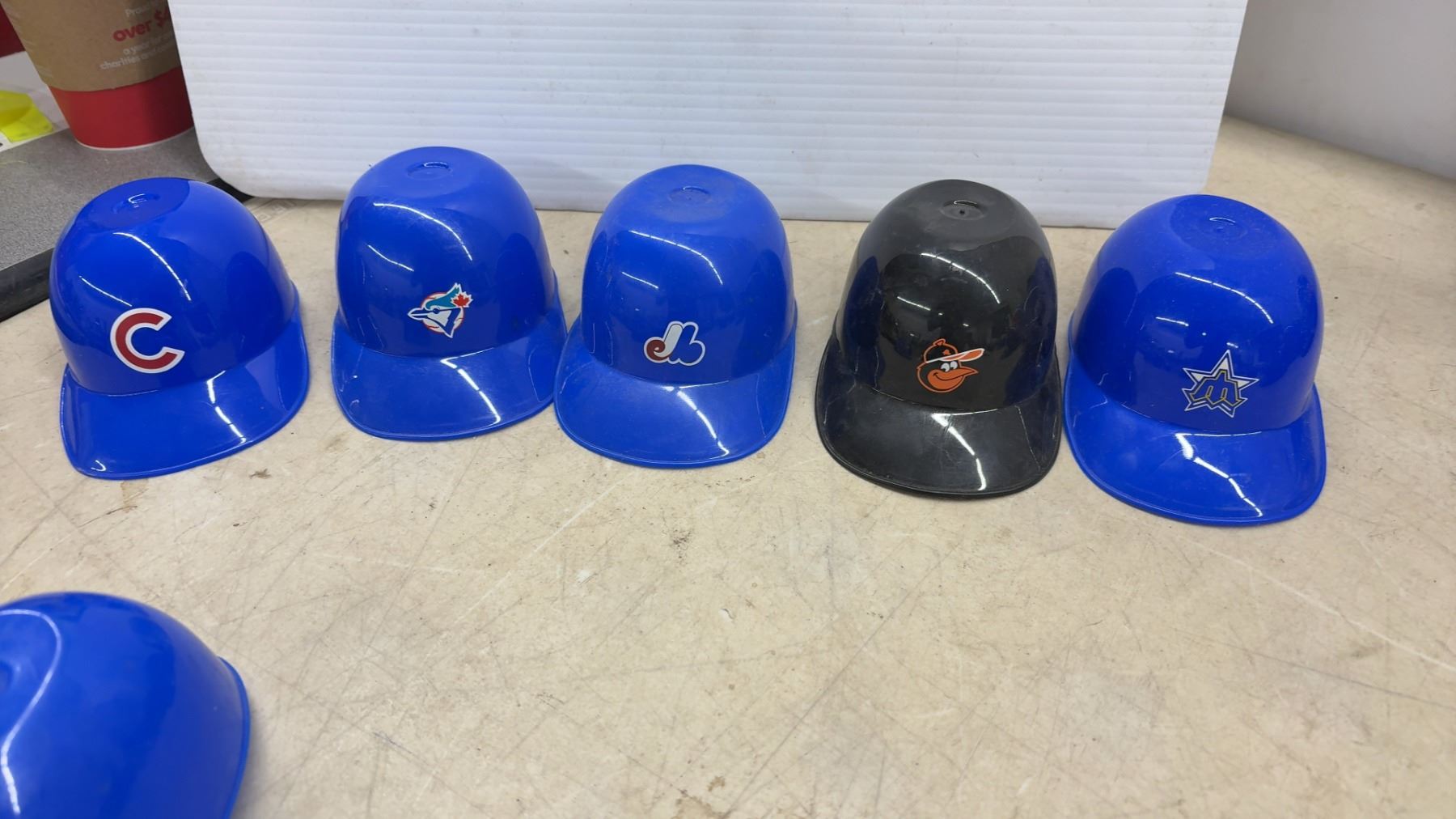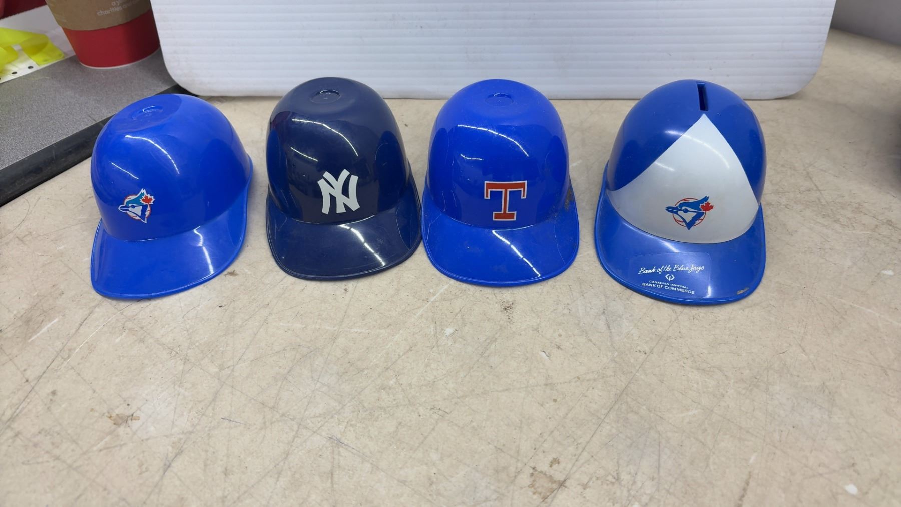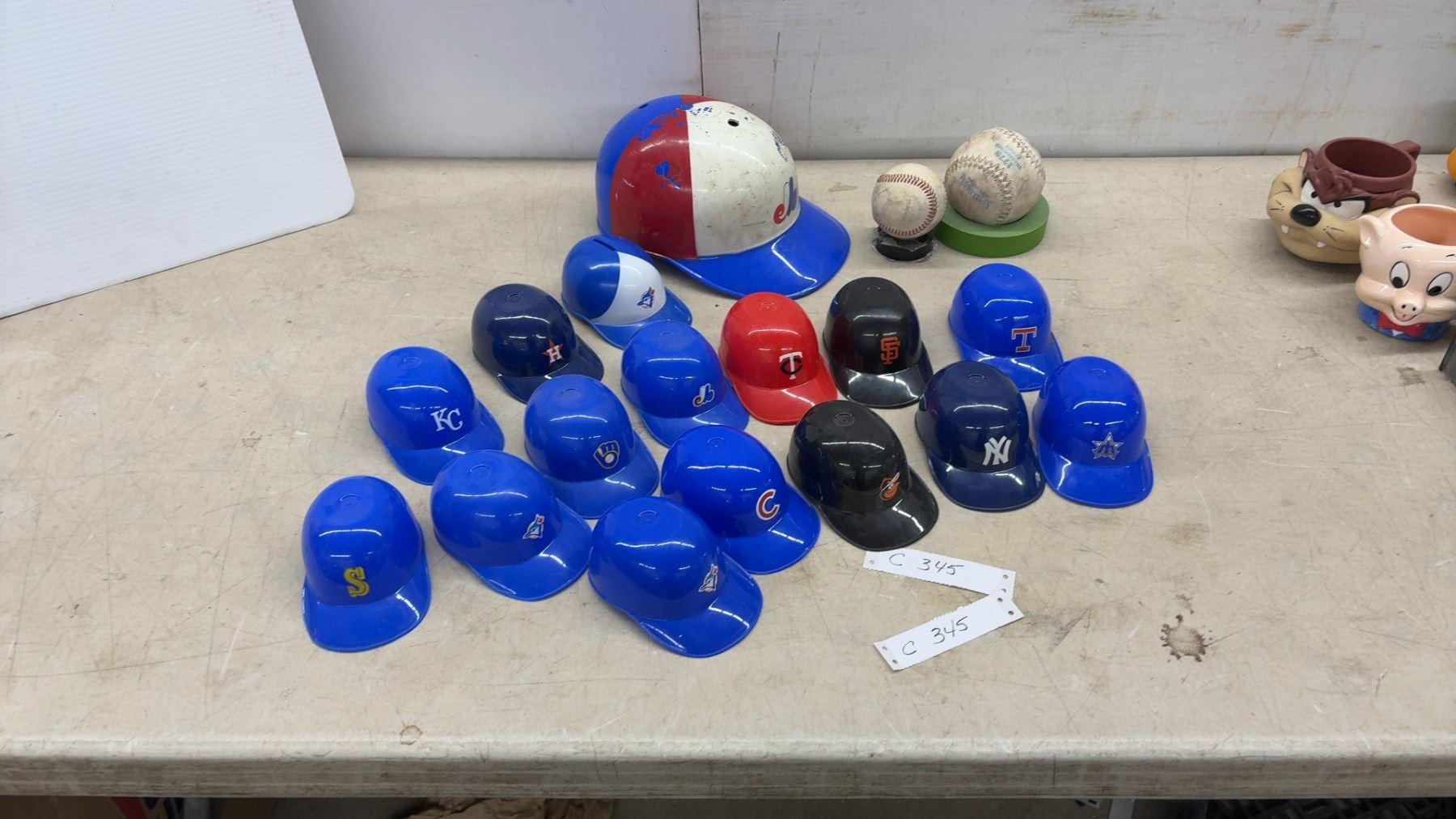 Lot 345 Collection of MLB Mini Batting Helmets (14), Various Teams, 2 Baseballs, Blue Jays Bank & Youth
