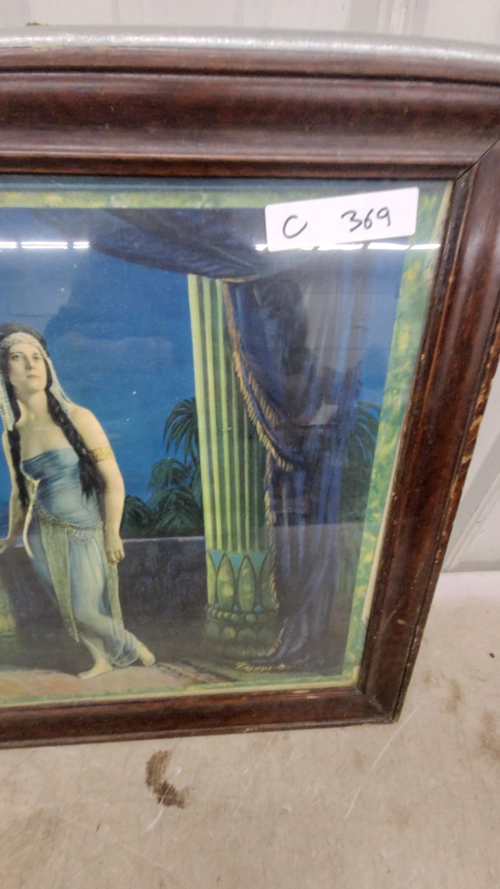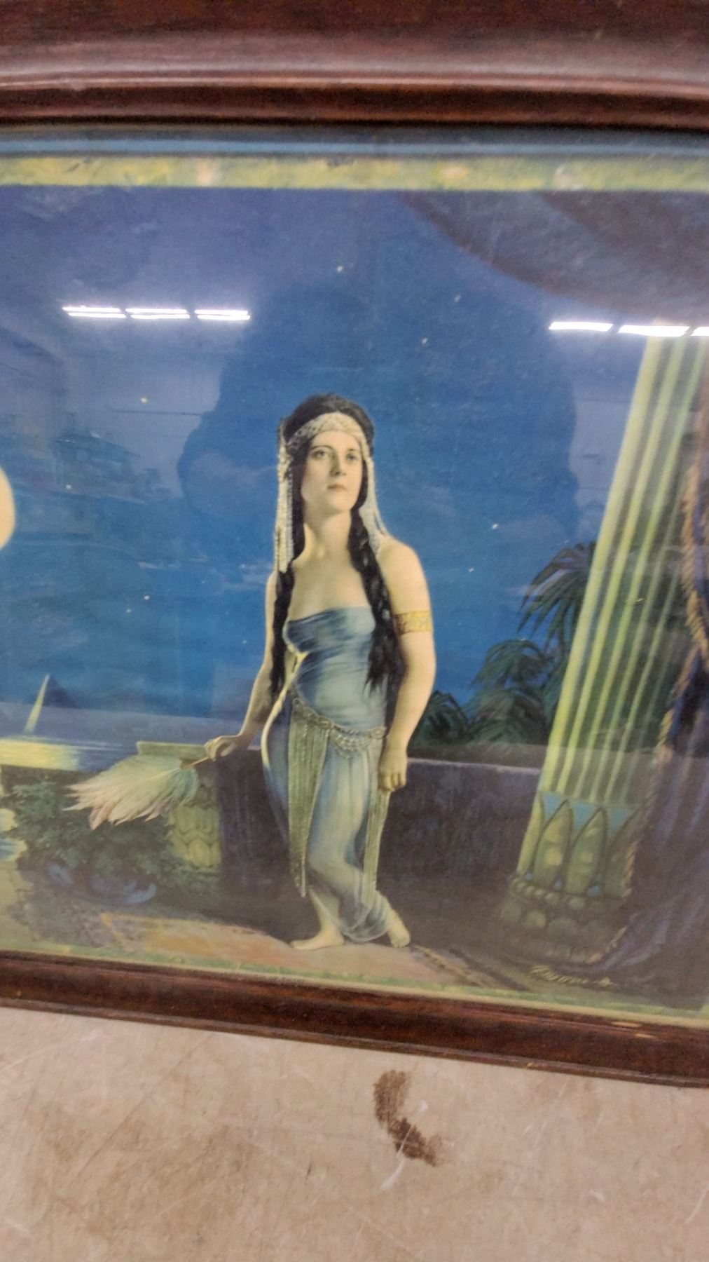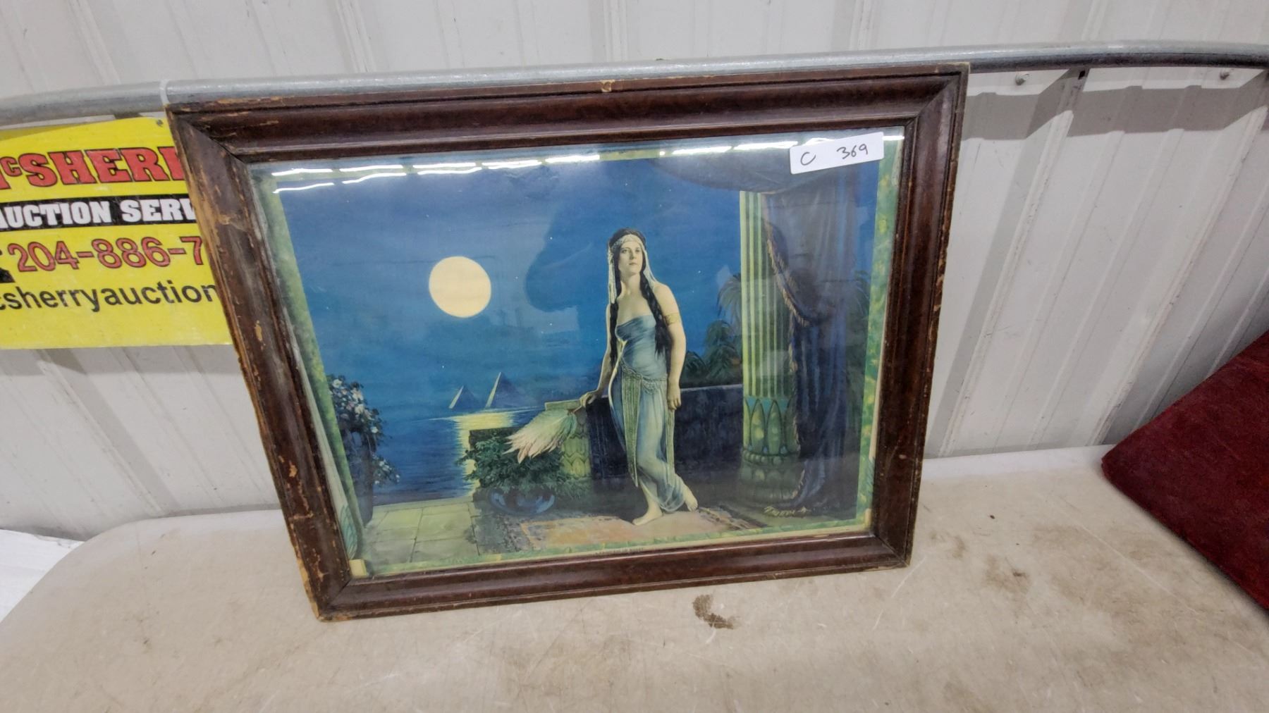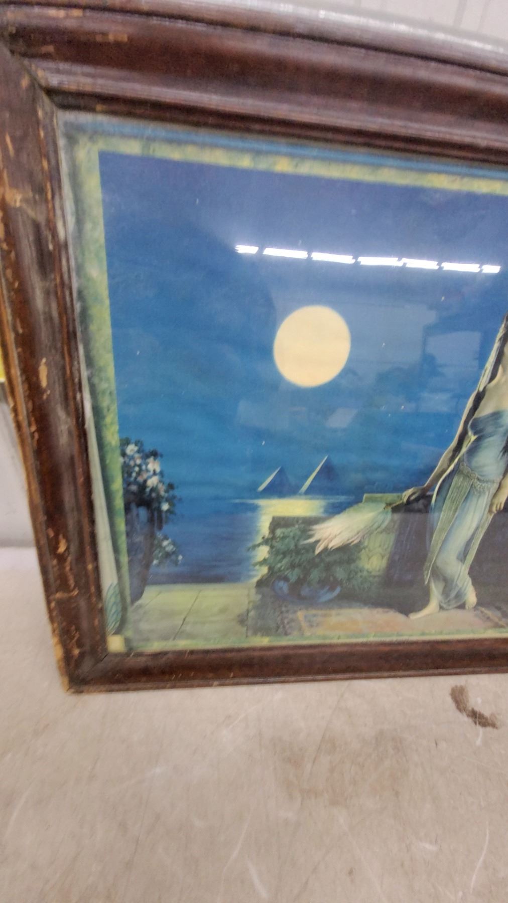 Lot 369 Vintage Framed Print "Cleopatra" Egyptian Scene with Pyramids & Moon, Wood Frame 21 x 27"