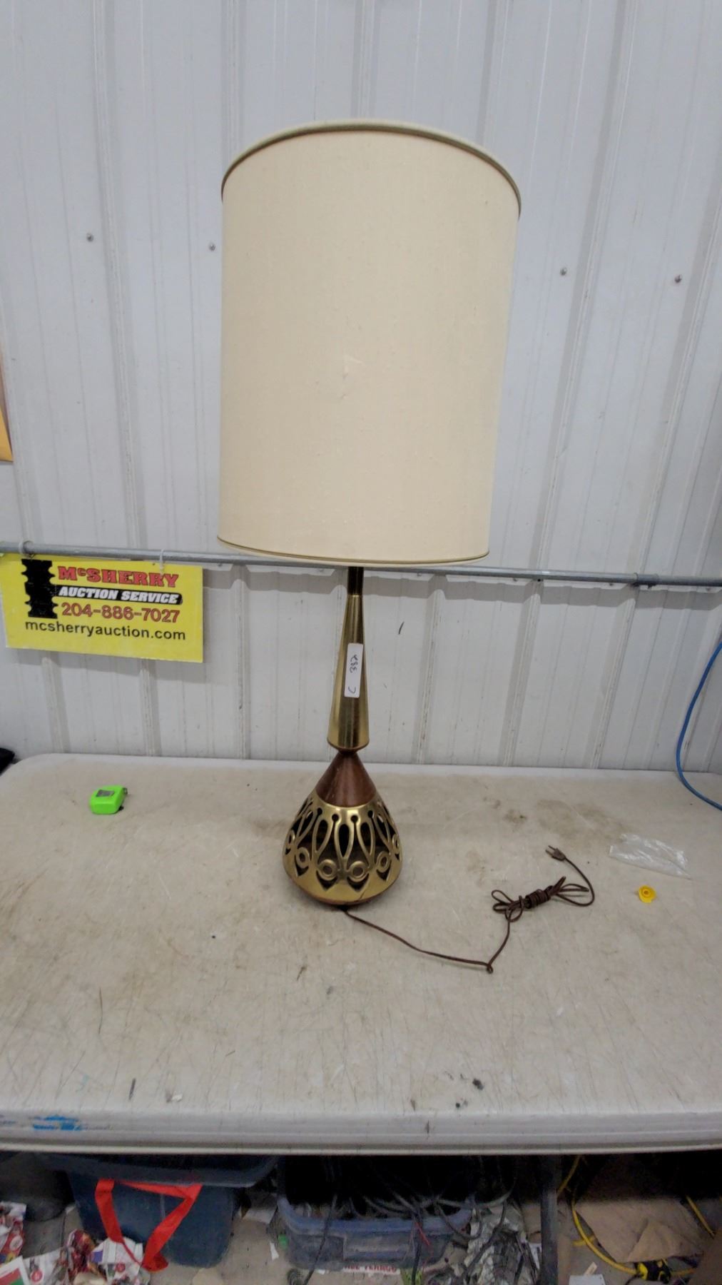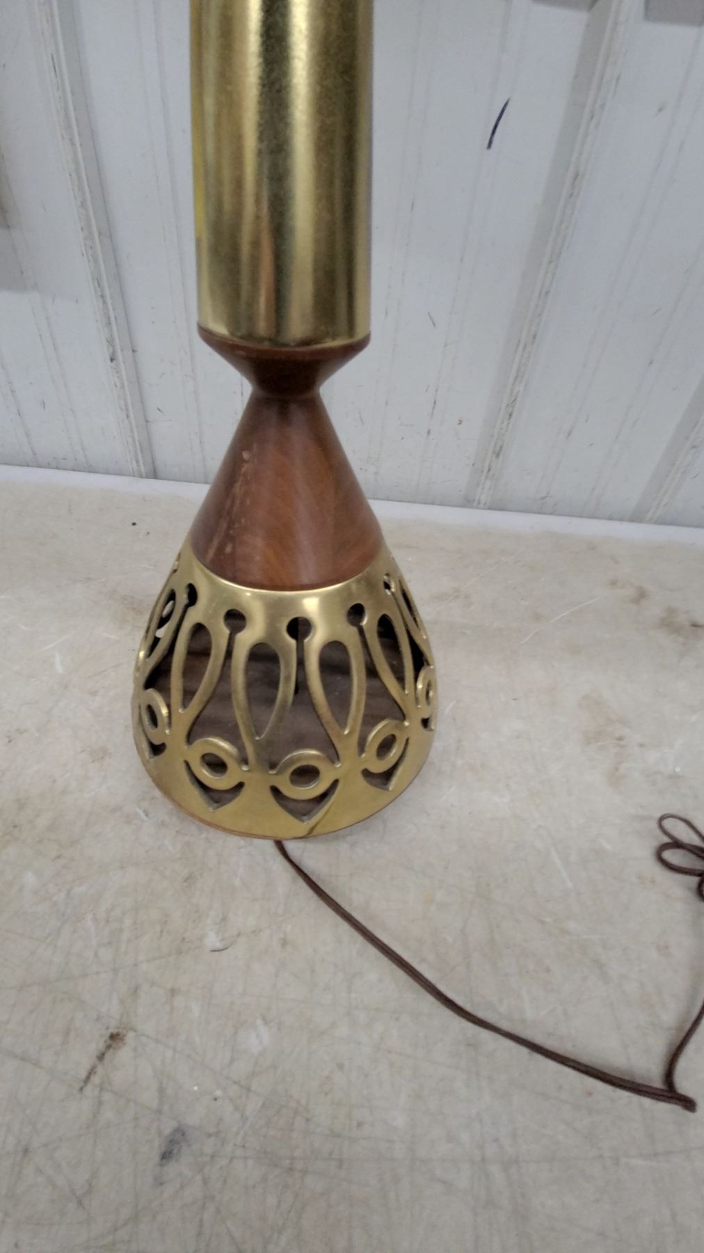 Lot 382 Mid-Century Modern Brass & Walnut Table Lamp with Pierced Base and Drum Shade