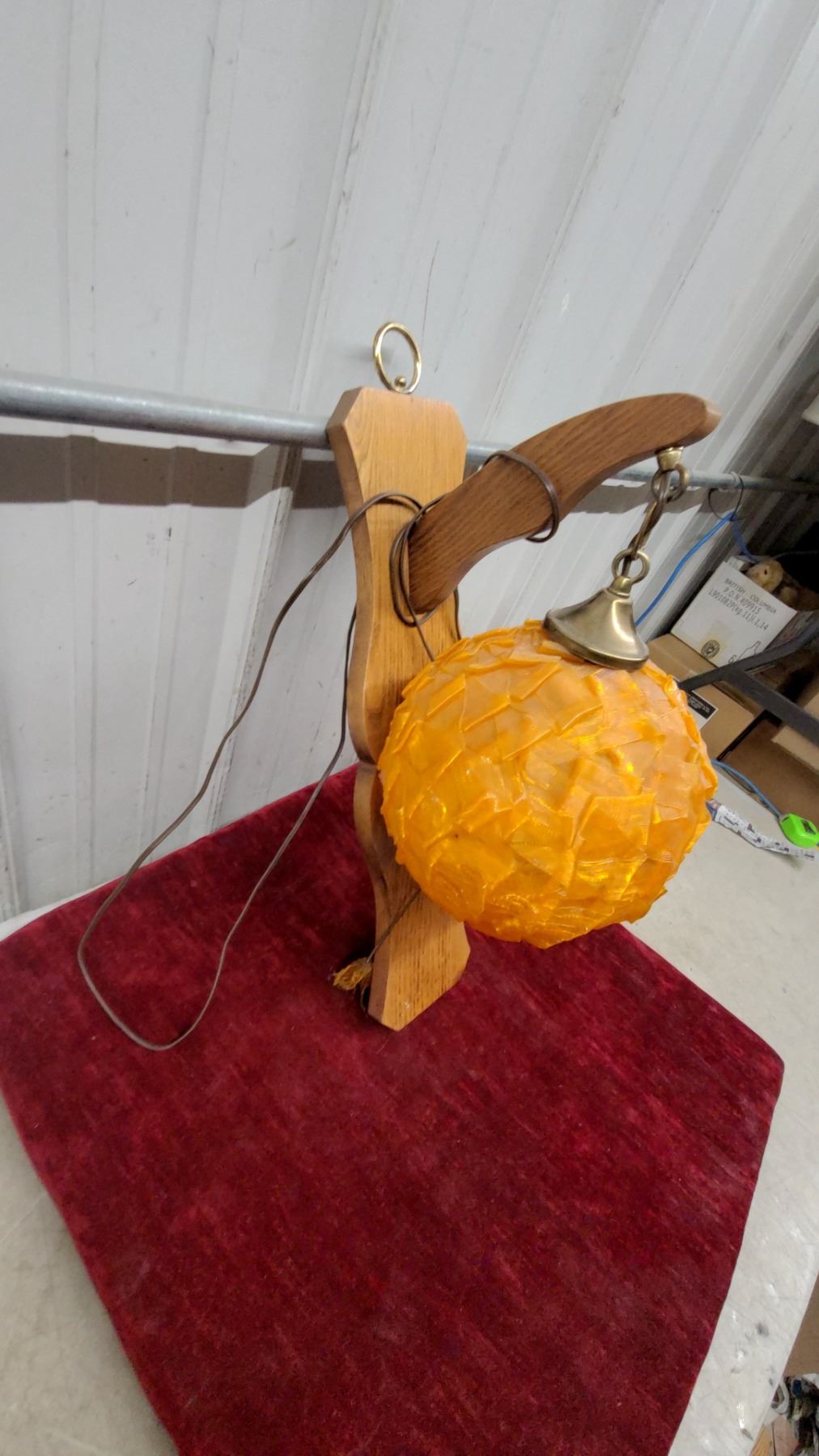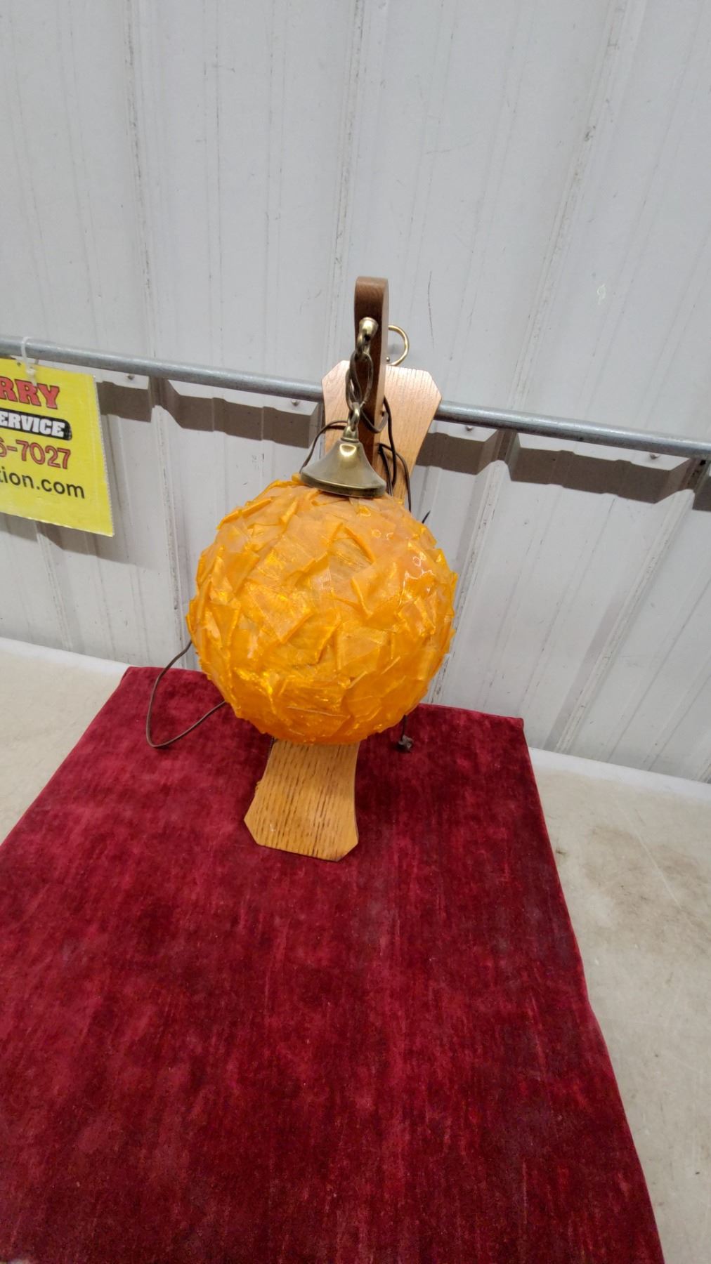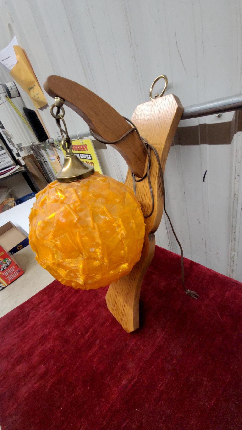 Lot 440 Mid-Century Wood Bracket Table Lamp with Orange Spaghetti/Lucite Globe Shade, Brass Hardware