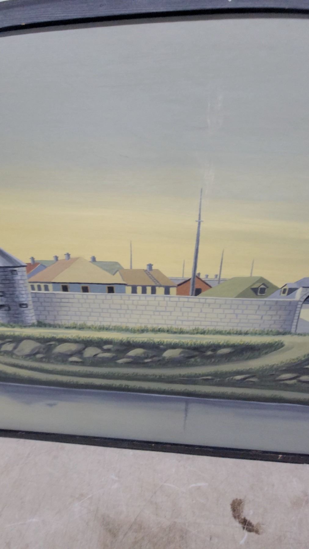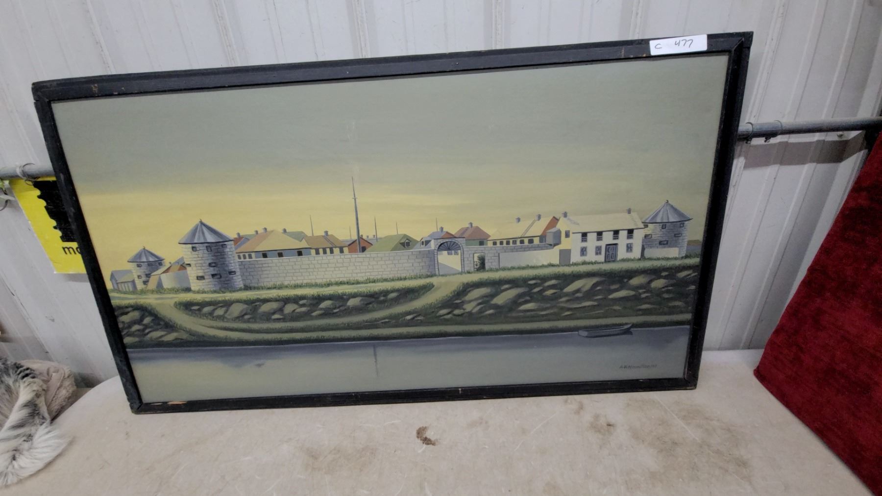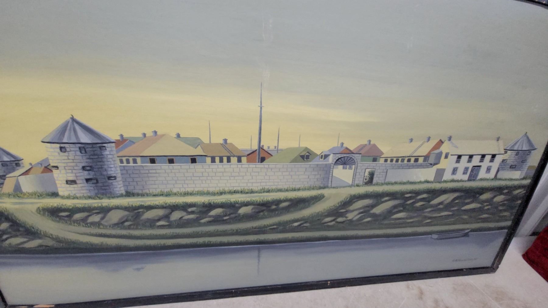 Lot 477 Framed Painting of a Fortified Coastal Town with Stone Towers and Walls, Black Frame 27 x 48"