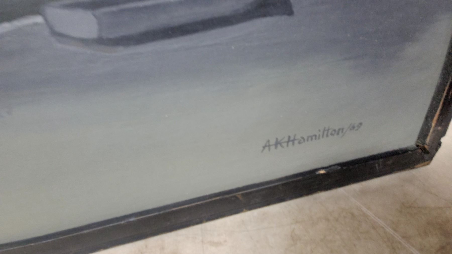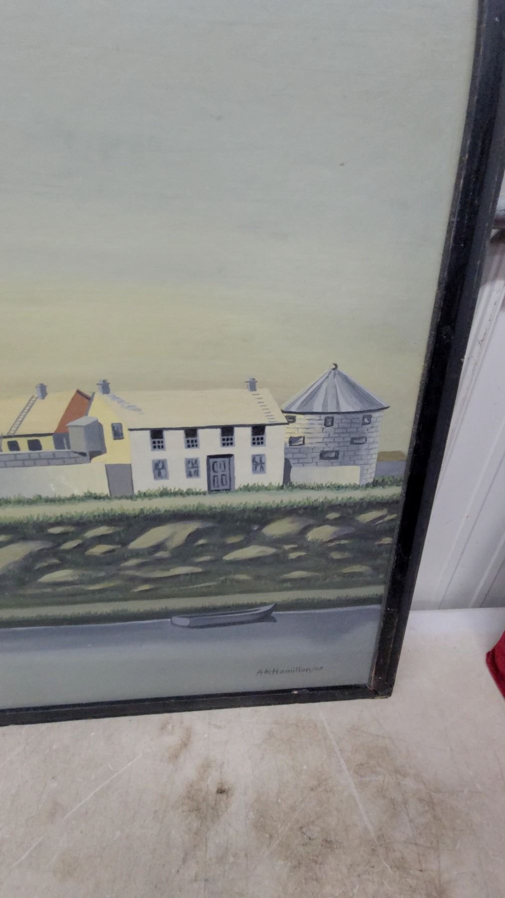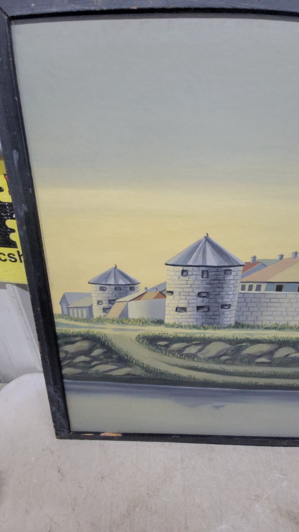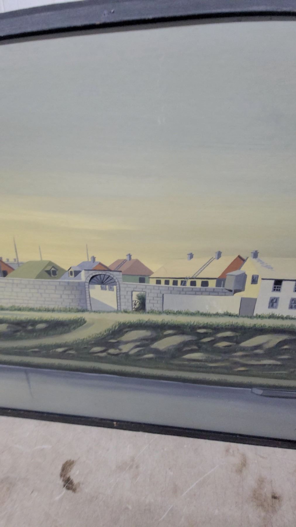 Lot 477 Framed Painting of a Fortified Coastal Town with Stone Towers and Walls, Black Frame 27 x 48"